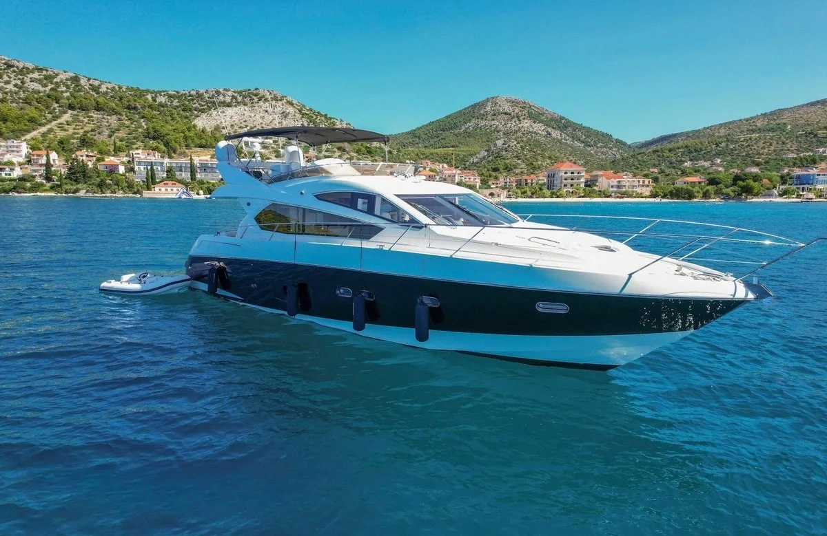 Embark on a journey of unparalleled adventure aboard ‘2 Drunk,’ a masterful creation by the esteemed Sunseeker shipyard. This 21-meter motor yacht is a gateway to both serene relaxation and exhilarating exploration. Experience the thrill of gliding through tranquil waters at speeds of up to 32 knots, courtesy of her efficient GRP hull and superstructure. With a shallow draft of just over 1.5 meters, ‘2 Drunk’ effortlessly navigates secluded coves and hidden shorelines, inviting you to explore untouched natural beauty. As you set sail for a week of discovery, every moment aboard the ‘2 Drunk’ promises to be as exciting as it is tranquil.