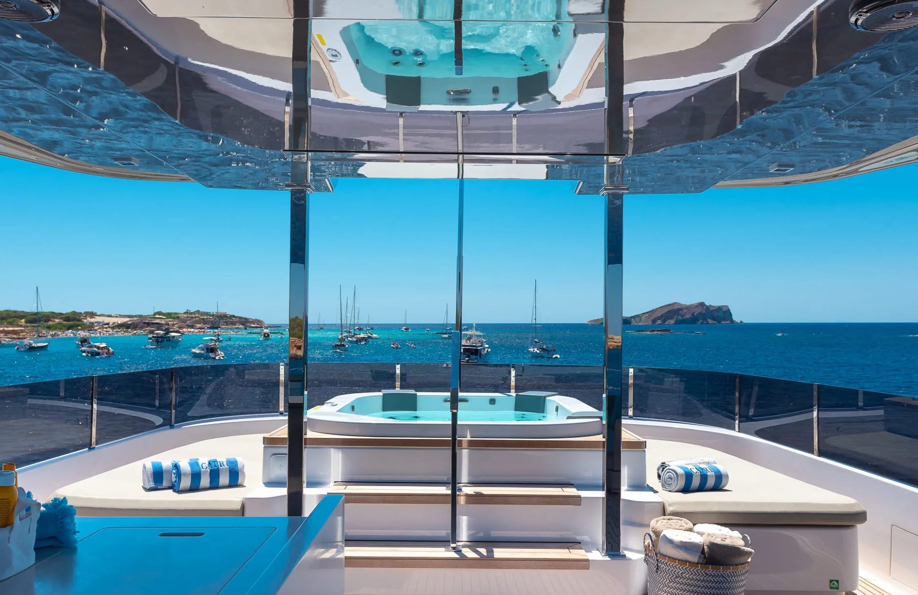 The moment you step aboard Acqua, a world of refined comfort envelops you. Feel the gentle sea breeze on the foredeck seating as you enjoy a convivial breakfast, or unwind in the serene beach club as the sun dips below the horizon. The deck jacuzzi offers a haven of relaxation, perfect for starlit evenings, while the gym equipment ensures you can maintain your wellness routine. With Wi-Fi throughout and an exterior bar for entertaining, every detail is crafted for your pleasure.