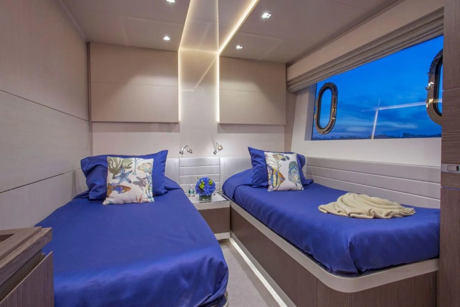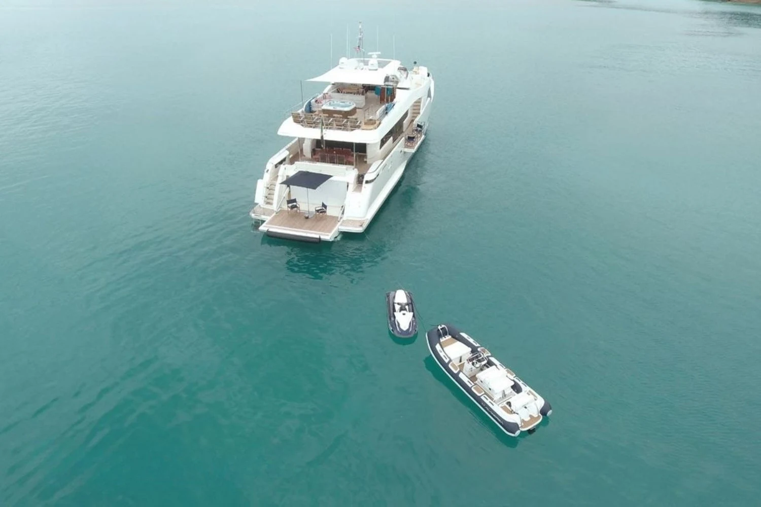 Every corner of Alandrea reflects a dedication to refined comfort and bespoke design by Zuccon. Whether you choose to relax on board or set off on an excursion ashore, the yacht’s layout and features are meticulously crafted to enhance your journey. With a capacity to host 10 guests in five opulent cabins, Alandrea presents an intimate setting for cherished memories. As the sun sets, the yacht transforms into a haven of tranquility, with the gentle lull of the sea creating a serene backdrop for your adventures.