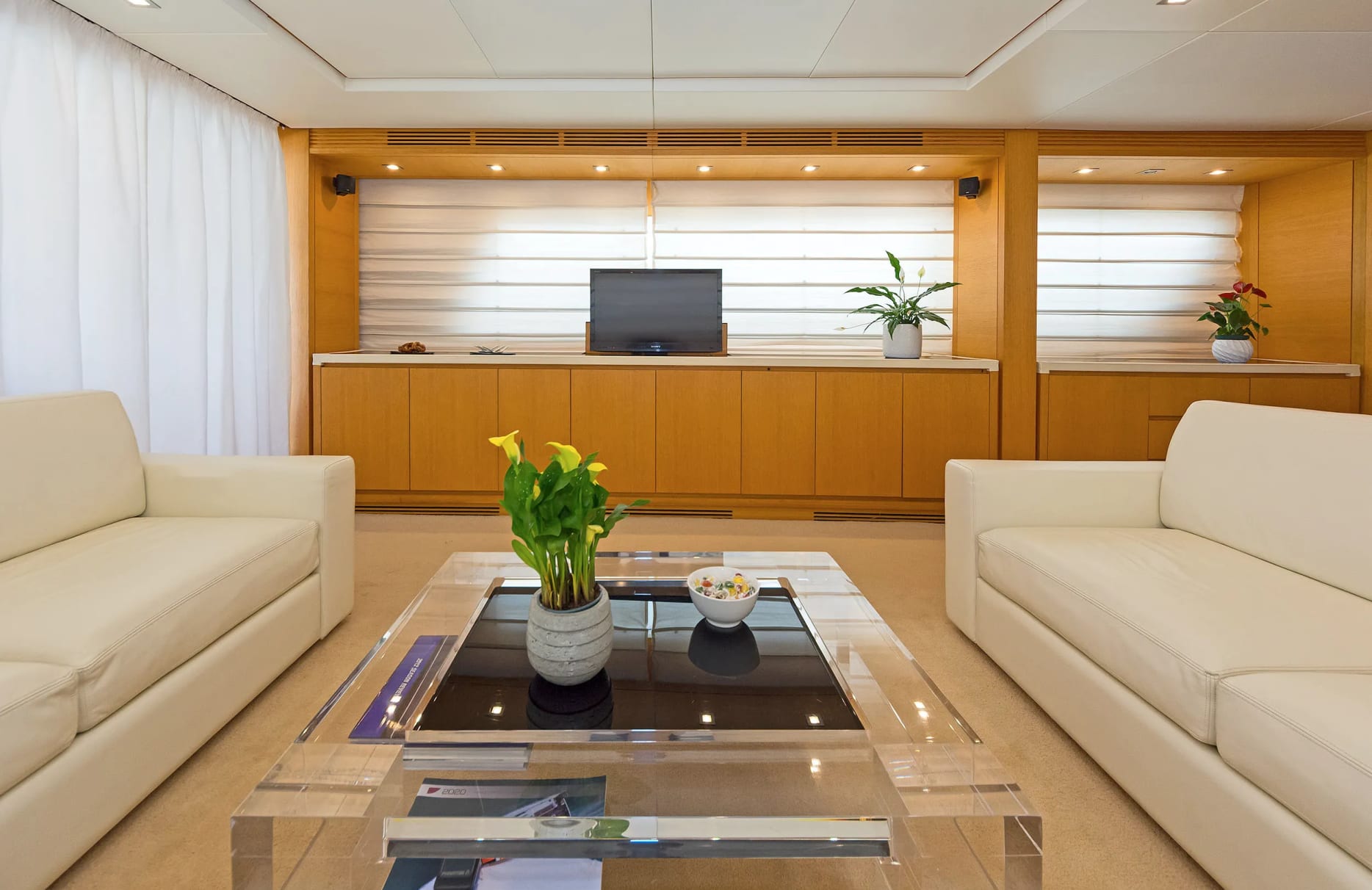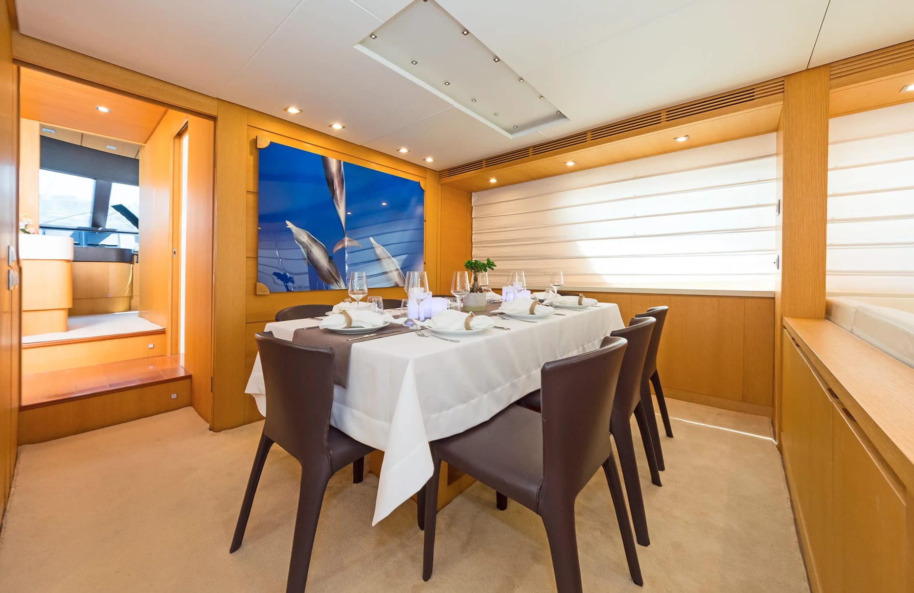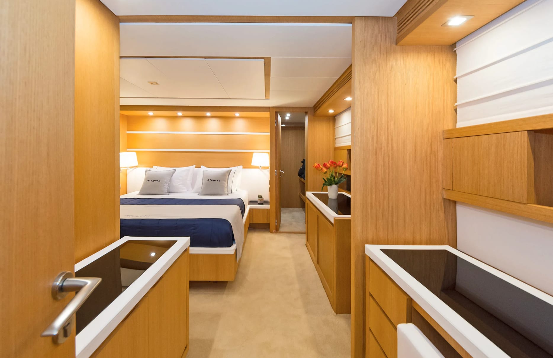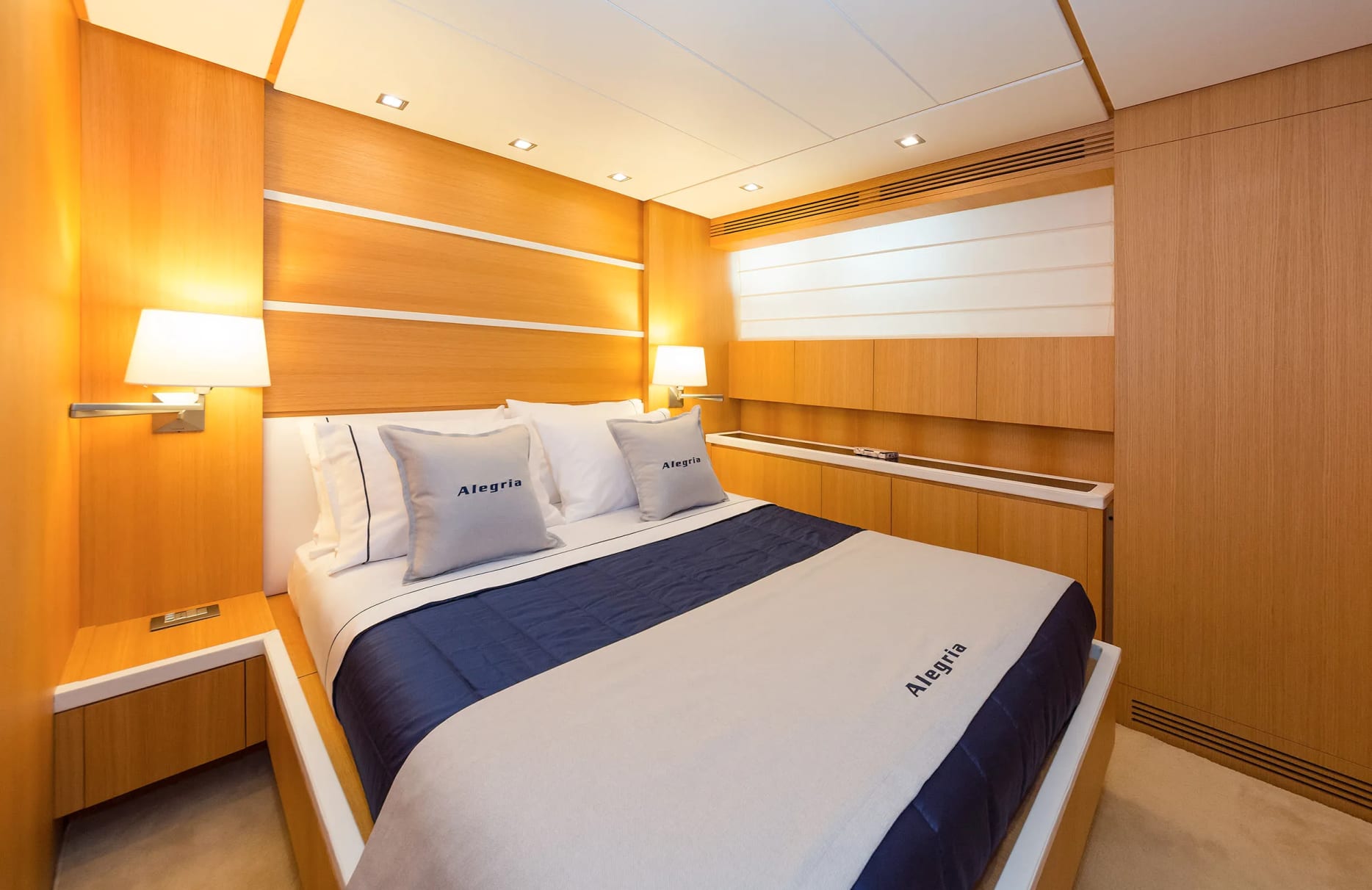 Alegria offers refined accommodations for up to eight guests, providing a sanctuary of relaxation and privacy. The master suite offers a serene retreat, while the VIP cabin and two twin cabins ensure comfort and style for all guests. Each morning, awaken to the gentle sound of the sea and the promise of another day of enchanting discovery. The yacht’s interior, crafted by the talented designers of Sanlorenzo, effortlessly blends sophistication with comfort, ensuring an unforgettable stay.