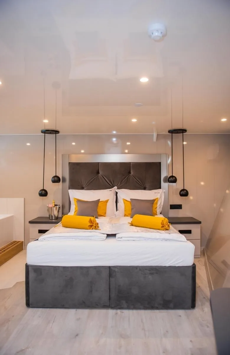 Life aboard Alfa Mario is a symphony of comfort and style, where every detail has been meticulously curated to enhance your journey. Start your day with a tranquil session in the sauna, followed by a refreshing swim in the pool, perfectly positioned to catch the dawn’s first light. As the day unfolds, the gym beckons those with a penchant for fitness, while the deck jacuzzi offers a serene escape for contemplation under the stars. The sun deck, with its inviting sunpads, becomes the ideal setting for leisurely afternoons, while the exterior bar serves as a vibrant hub for evening gatherings, ensuring that each day transitions seamlessly from one delightful moment to the next.