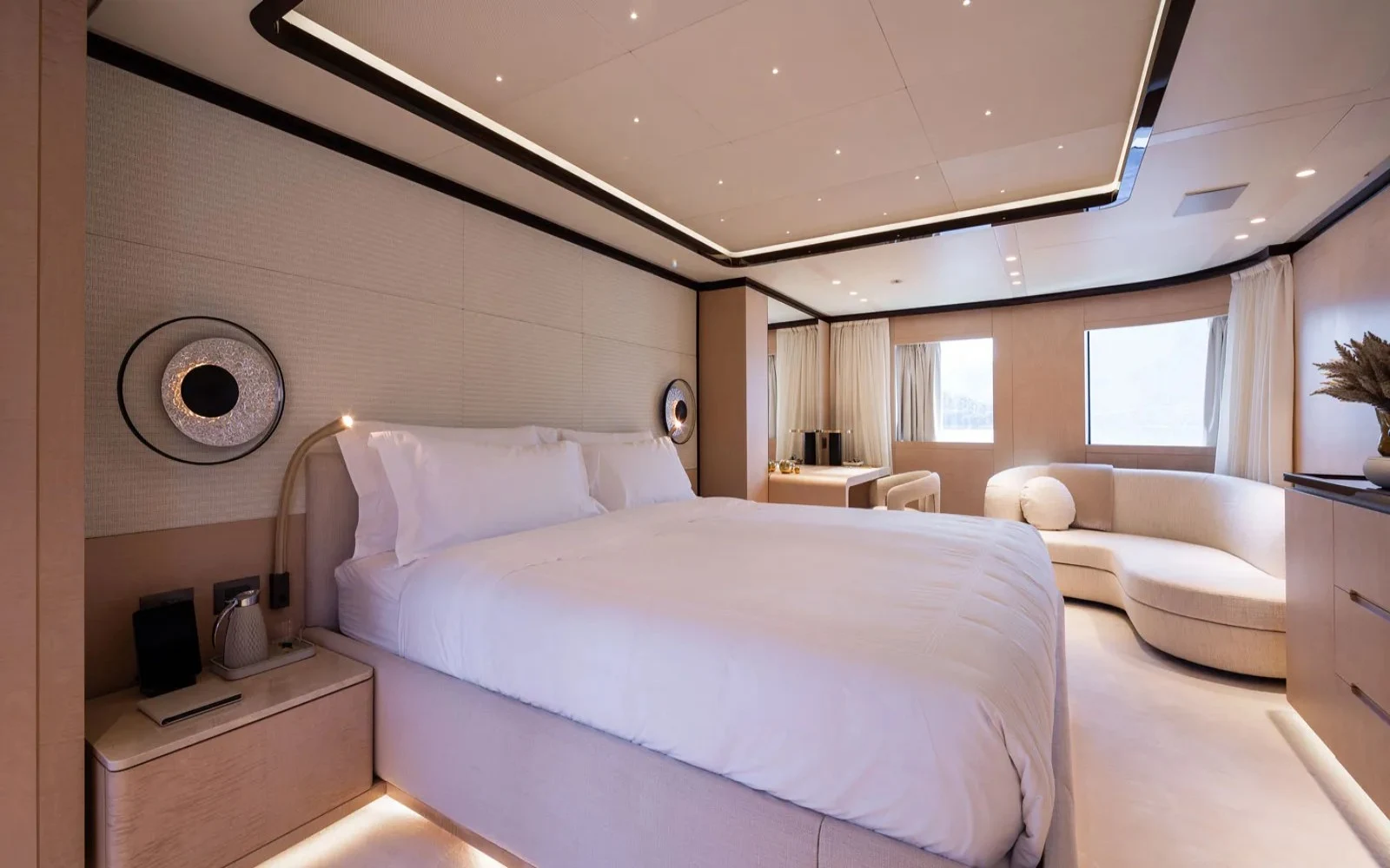 Alunya accommodates up to ten guests within her five luxurious cabins, each a sanctuary of comfort and style. The full-beam master suite, with its own study and his-and-her bathroom, offers a private retreat that is both spacious and serene. Additional VIP and double cabins are designed to provide a restful haven, ensuring every guest wakes up rejuvenated and ready to embrace the day’s adventures. With meticulous attention to detail, the accommodations aboard Alunya promise an experience that is as restful as it is memorable.
