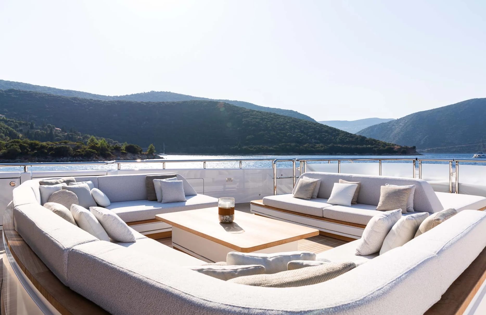 Alunya’s onboard experience is a celebration of sophisticated leisure. As you wander through her resplendent interiors, discover spaces that cater to every whim. At the heart of the yacht, the beach club offers an intimate connection with the sea, while the gym stands ready for invigorating workouts. Evenings can be spent under a sky illuminated by underwater lights, creating a magical setting for a dinner beneath the stars. The deck jacuzzi provides a tranquil retreat, and for those seeking entertainment, the exterior bar and satellite TV offer a convivial ambiance.