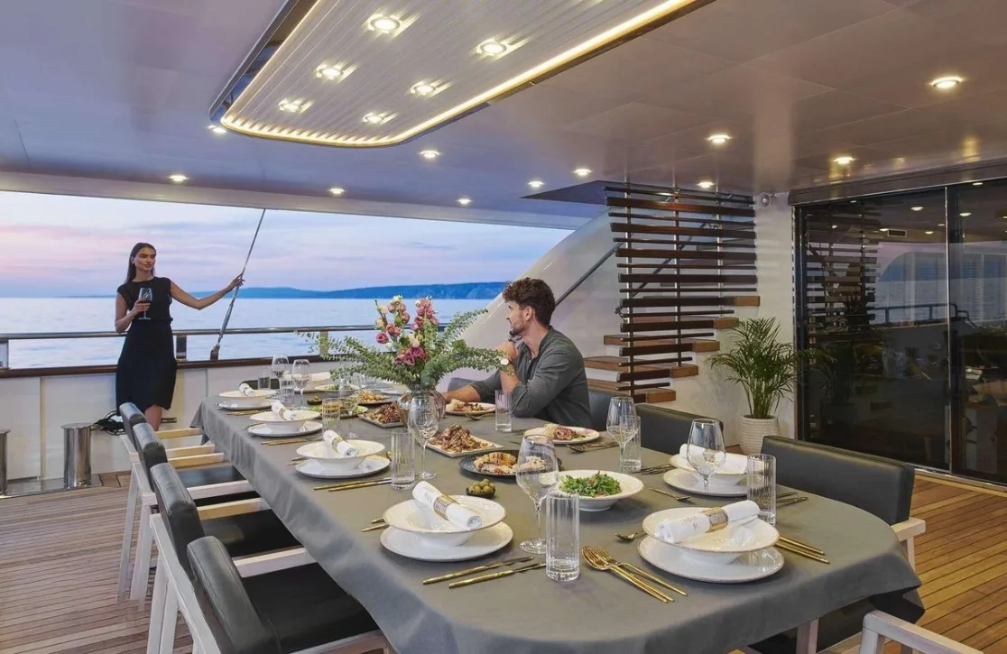 Aboard Anima Maris, each day unfolds with a promise of serene indulgence and vibrant social gatherings. Begin your morning with a refreshing dip in the deck jacuzzi, where the world seems to pause as you gaze upon endless ocean vistas. As the sun sets, the underwater lights cast a magical glow, perfect for evening soirees or contemplative moments under the stars. With Wi-Fi connectivity at your fingertips and air-conditioned interiors, every aspect of your stay is designed for comfort and connection. Enjoy leisurely afternoons on the sunpads or engage in lively conversations at the exterior bar, where stories of the day’s adventures are shared.