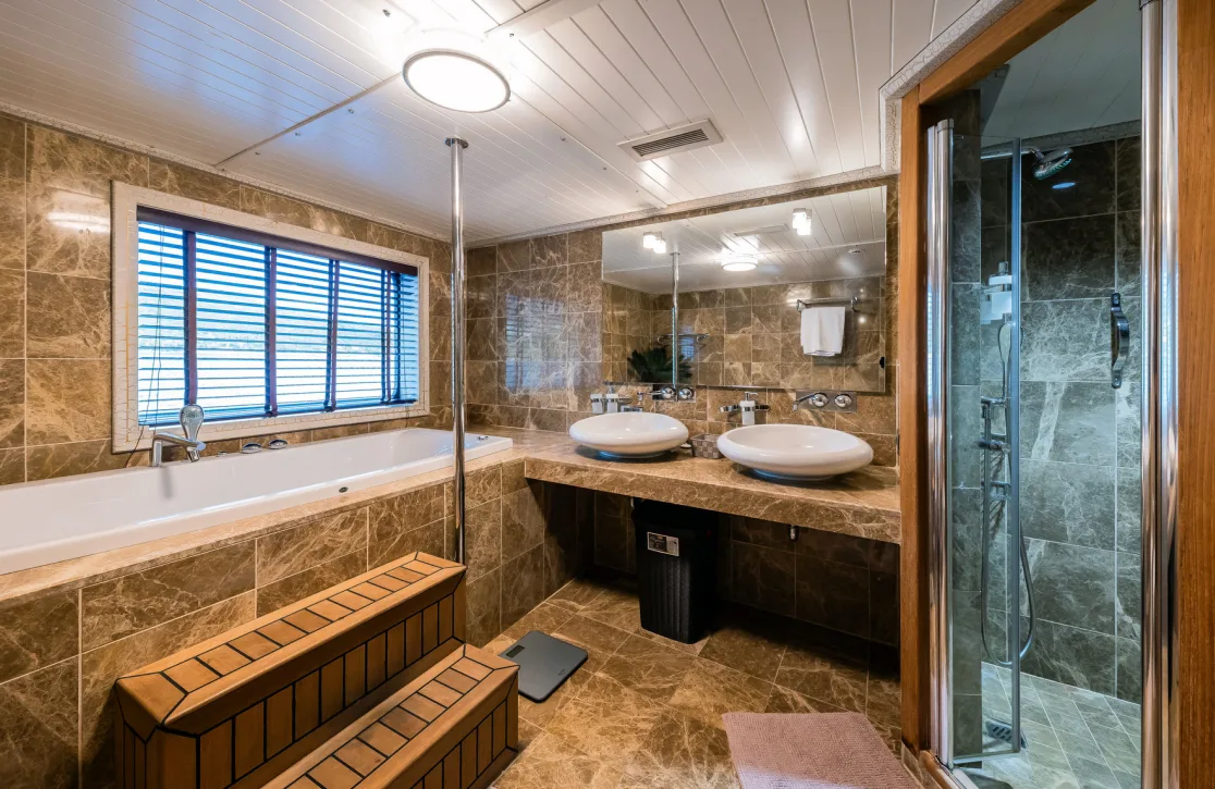 The accommodations aboard ‘Apna’ are nothing short of extraordinary, designed to host 12 guests across six opulent suites. Each cabin is a haven of tranquility, where the gentle lapping of the waves provides a soothing soundtrack to your slumber. Wake up to the soft glow of dawn filtering through your window, and let the promise of a new day at sea inspire your journey. With a dedicated crew attending to your every need, the experience is one of effortless elegance, ensuring that each moment spent on board is as restful as it is memorable.