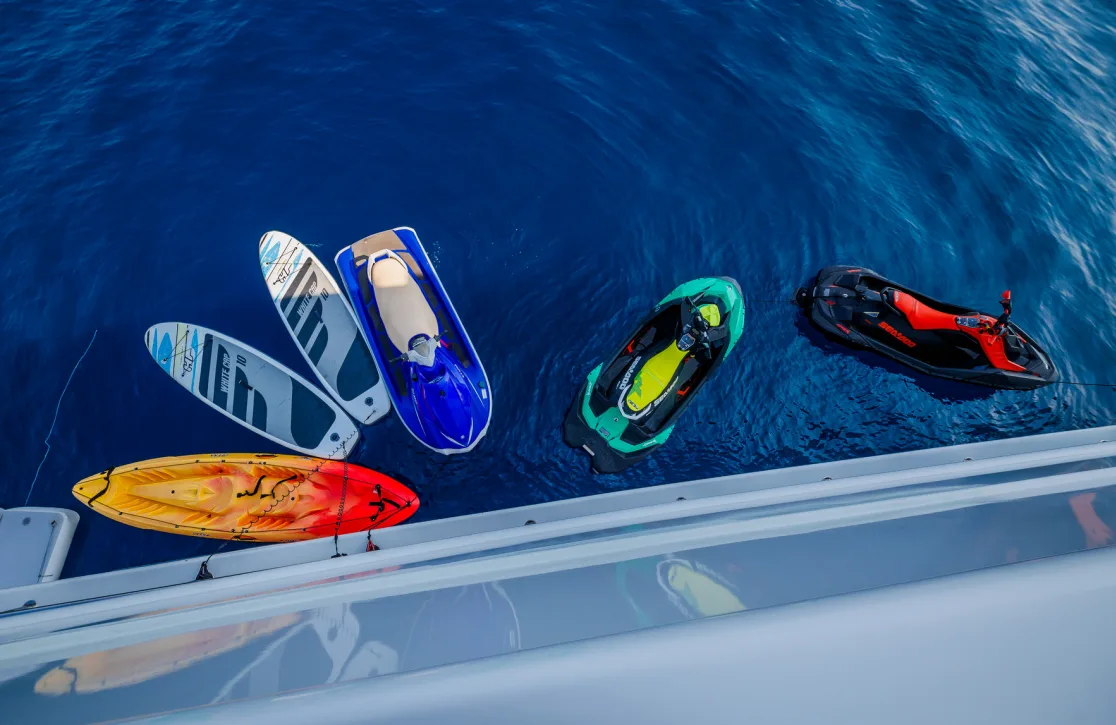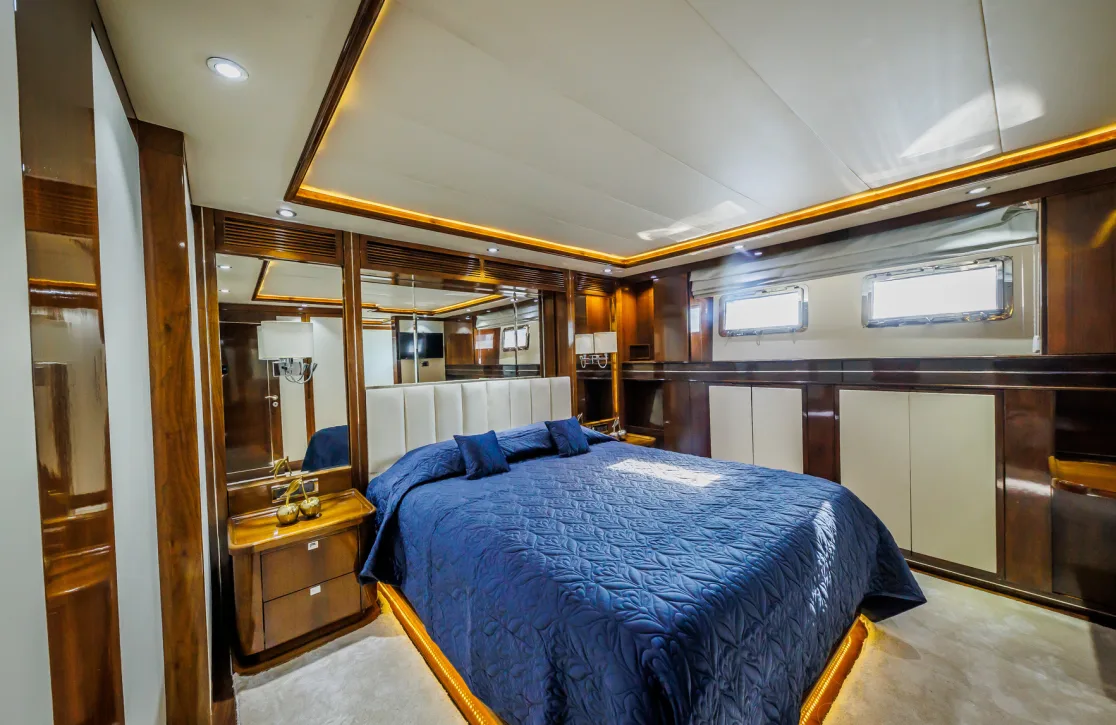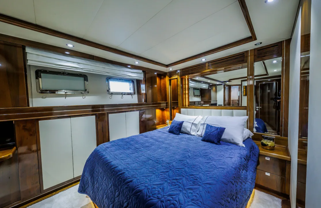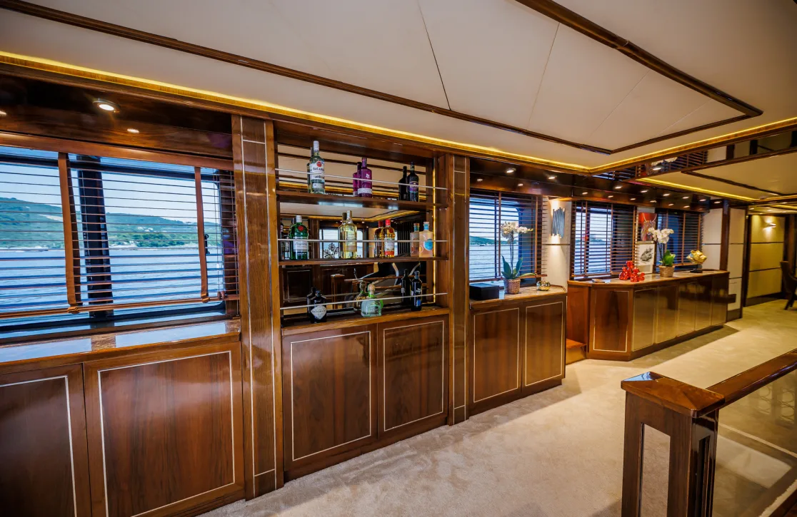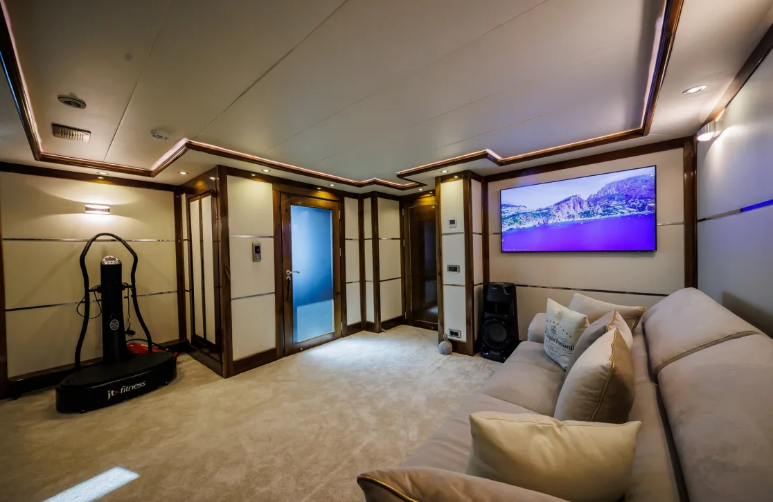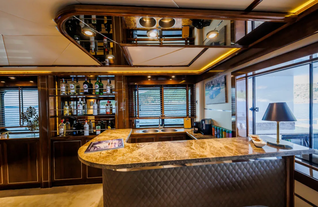 Aboard ‘Apna’, every detail is curated for an exceptional experience. Begin your day with a rejuvenating workout in the well-equipped gym, or unwind in the bubbling retreat of the deck jacuzzi while soaking in panoramic ocean views. The air-conditioned interiors offer a sanctuary of calm, providing a perfect escape from the midday sun. Evenings are best spent at the outdoor bar, where conversations flow as freely as the cocktails, all under a starlit sky. The yacht’s at-anchor stabilizers ensure that whether you’re dining alfresco or enjoying a quiet moment on the deck, comfort is paramount.