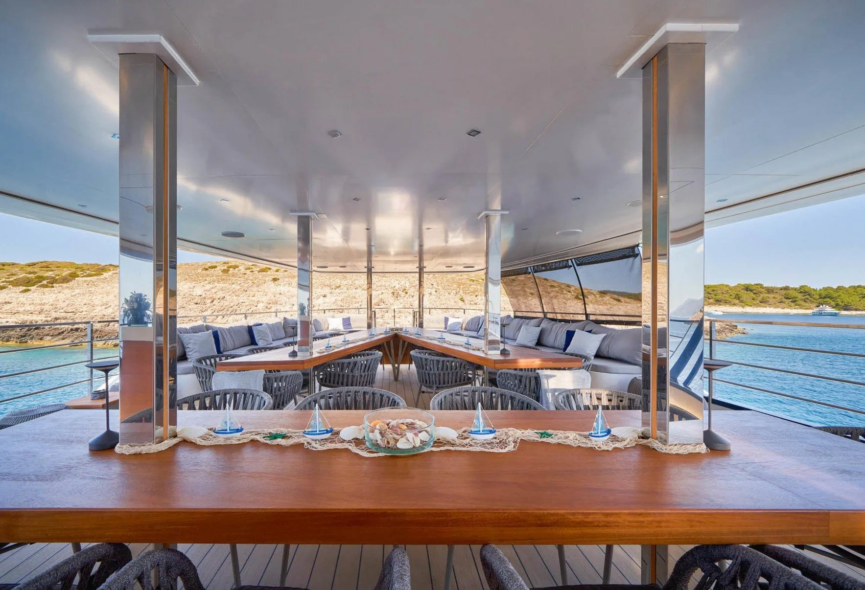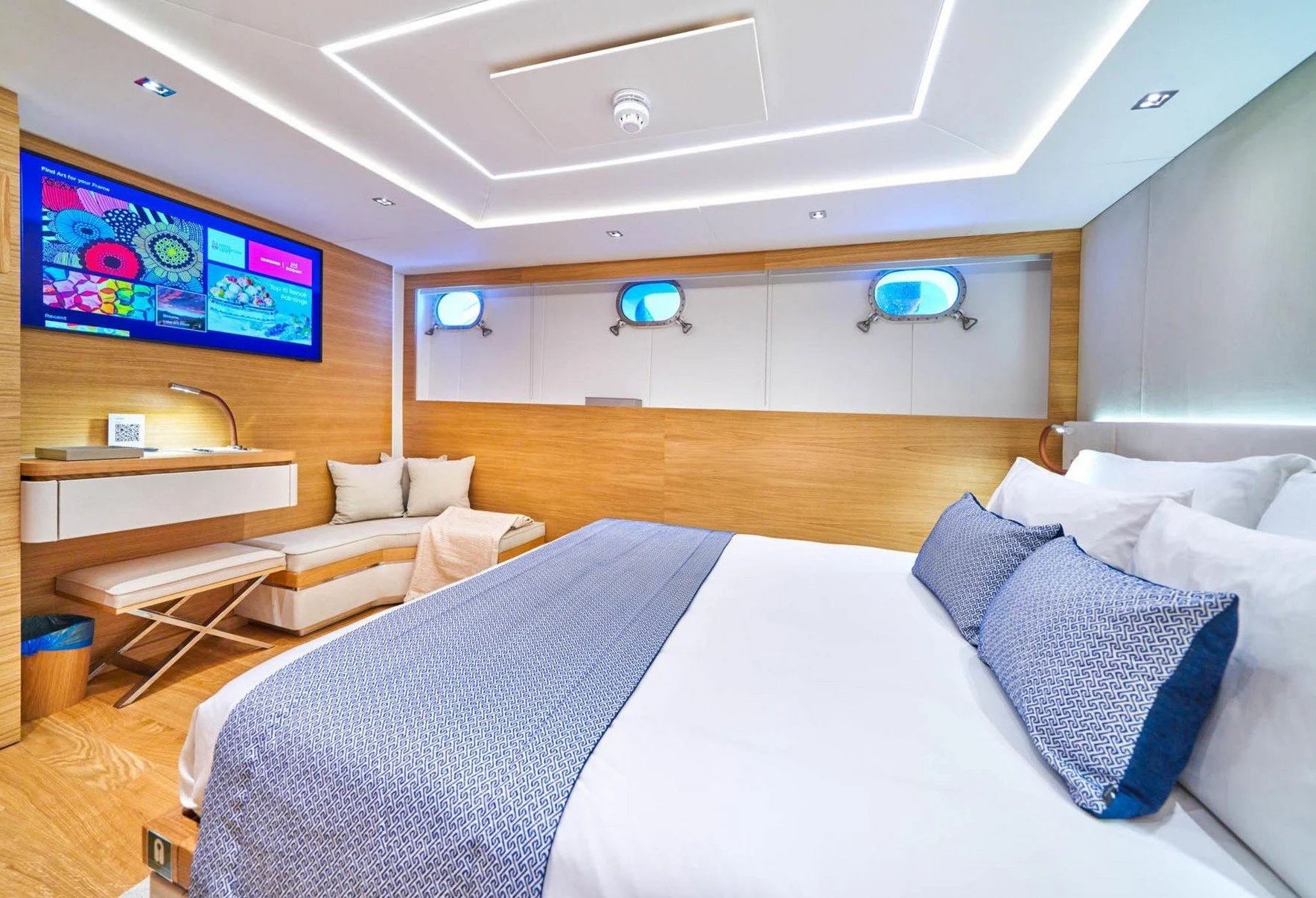 At the heart of Argo’s charm lies her ability to host up to 26 guests in 13 well-appointed cabins, each designed to be a haven of tranquility. The master suite offers a realm of comfort with expansive views, while the three VIP cabins exude a refined elegance. For those seeking versatility, eight adaptable cabins cater to various guest arrangements, ensuring everyone finds their perfect nook. Waking up aboard Argo is akin to greeting a new dawn with the gentle sway of the sea, as sunlight filters through your windows and the promise of another exquisite day unfurls before you.