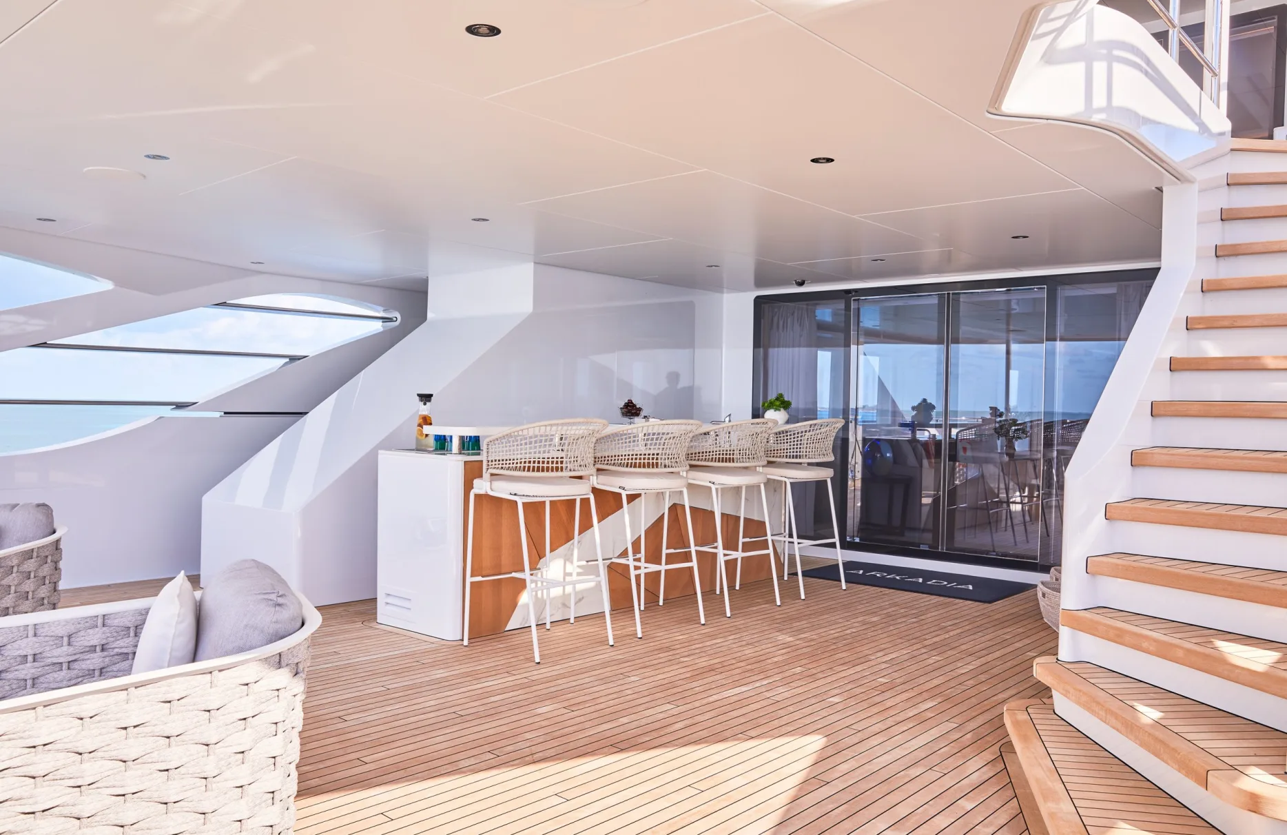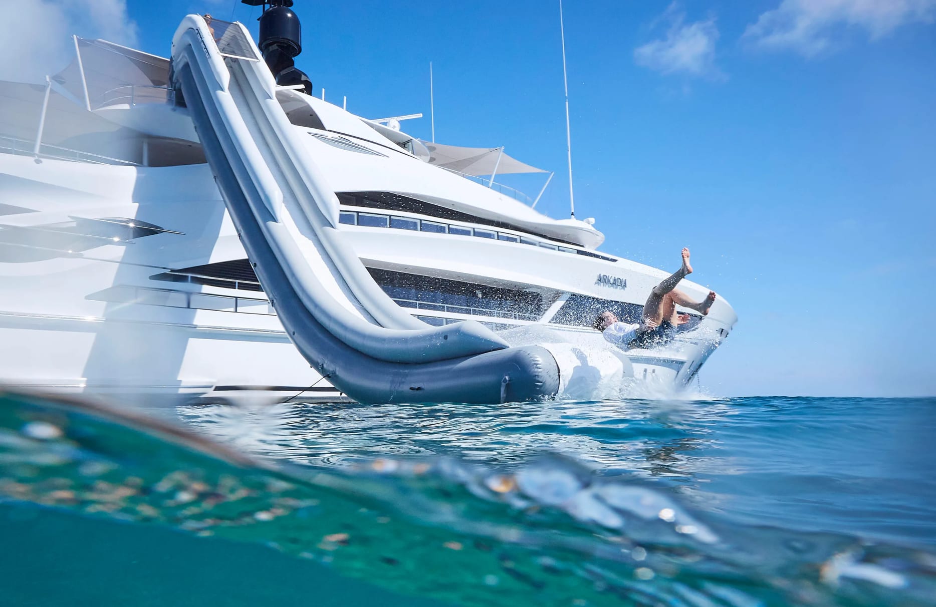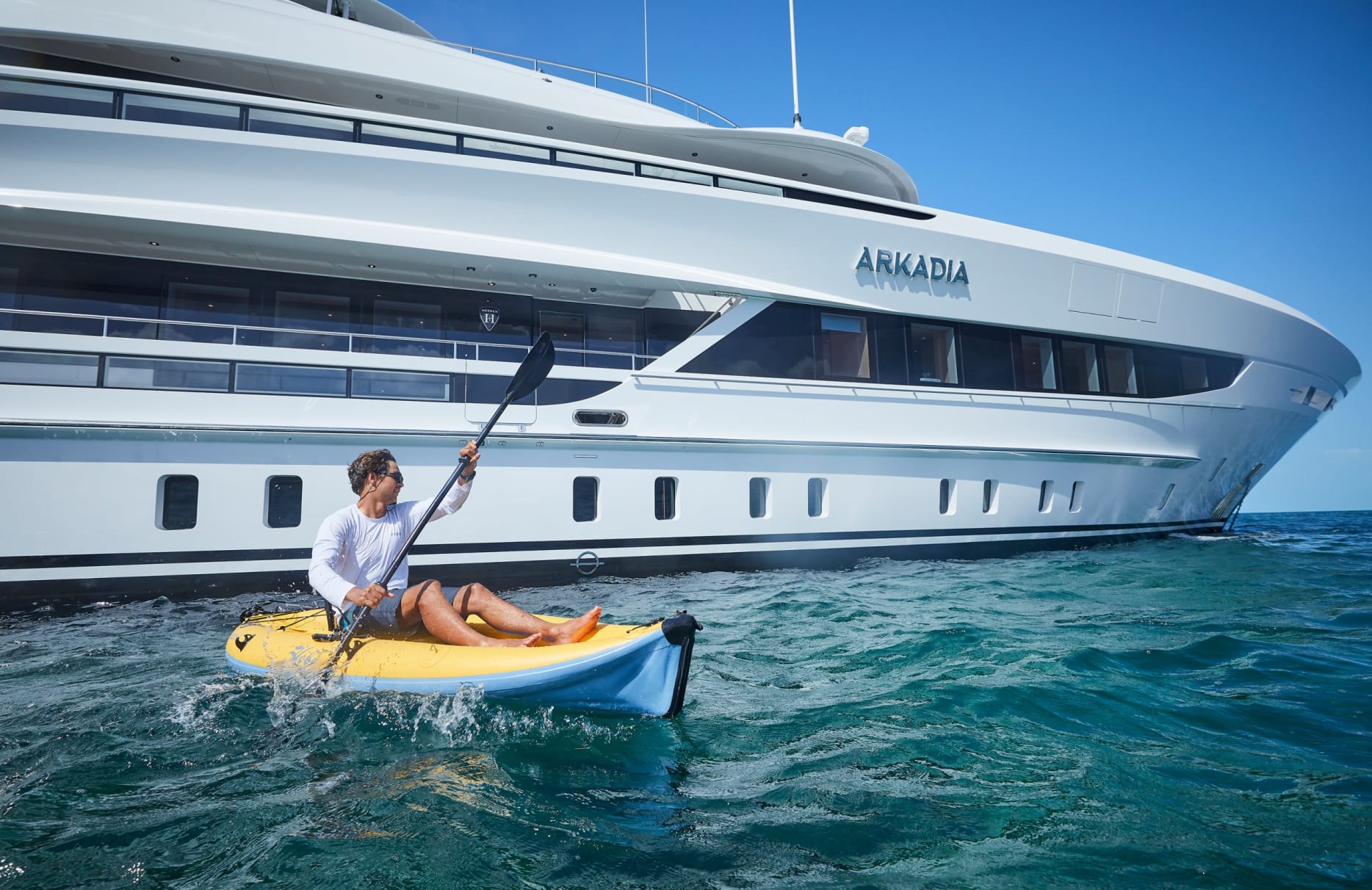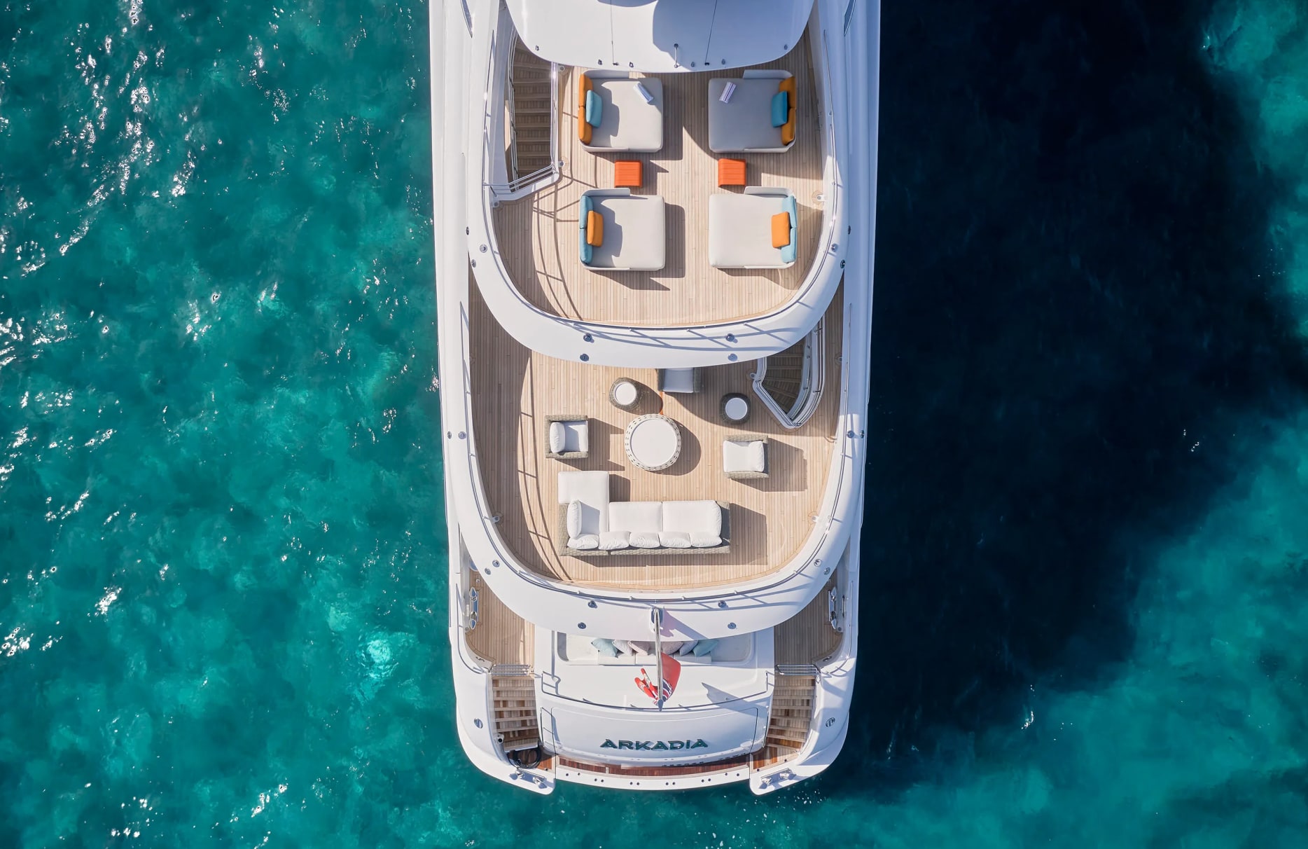 While the Arkadia invites you to revel in her inviting interiors and expansive decks, she also beckons you to explore the world beyond her hull. Each day aboard can be as serene or adventurous as you wish, with opportunities to indulge in water sports, visit secluded beaches, or savor the culinary delights prepared by your dedicated crew. With nine attentive crew members ensuring every detail is perfect, your time aboard is a bespoke experience tailored to your desires. Arkadia is more than a yacht; she is your gateway to a world of refined exploration.