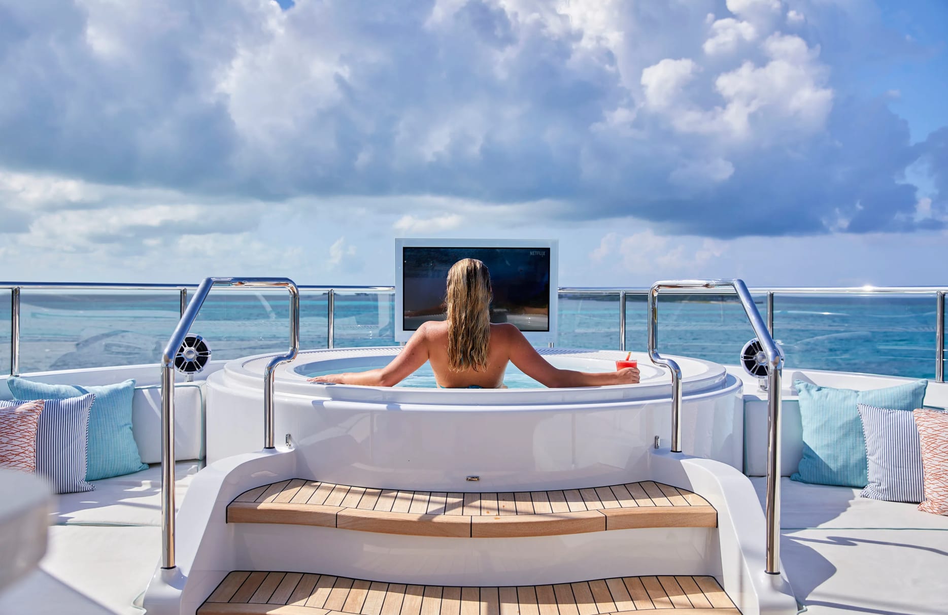 On Arkadia, each day begins with the promise of indulgence and ends with the serenity of the sea. Start your morning with a workout in the state-of-the-art gym, or perhaps a refreshing dip in the deck jacuzzi as you watch the sun rise over the horizon. As the day unfolds, unwind in the sauna or relax at the beach club, where the gentle sound of the ocean soothes your senses. As evening falls, gather with friends at the outdoor bar on the sun deck, where the day’s adventures are recounted under a blanket of stars. Throughout your journey, seamless connectivity via Wi-Fi and the perfect climate maintained by the air conditioning ensure comfort and connection, no matter where your voyage takes you.