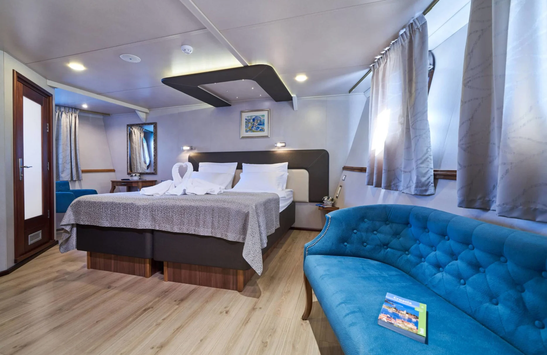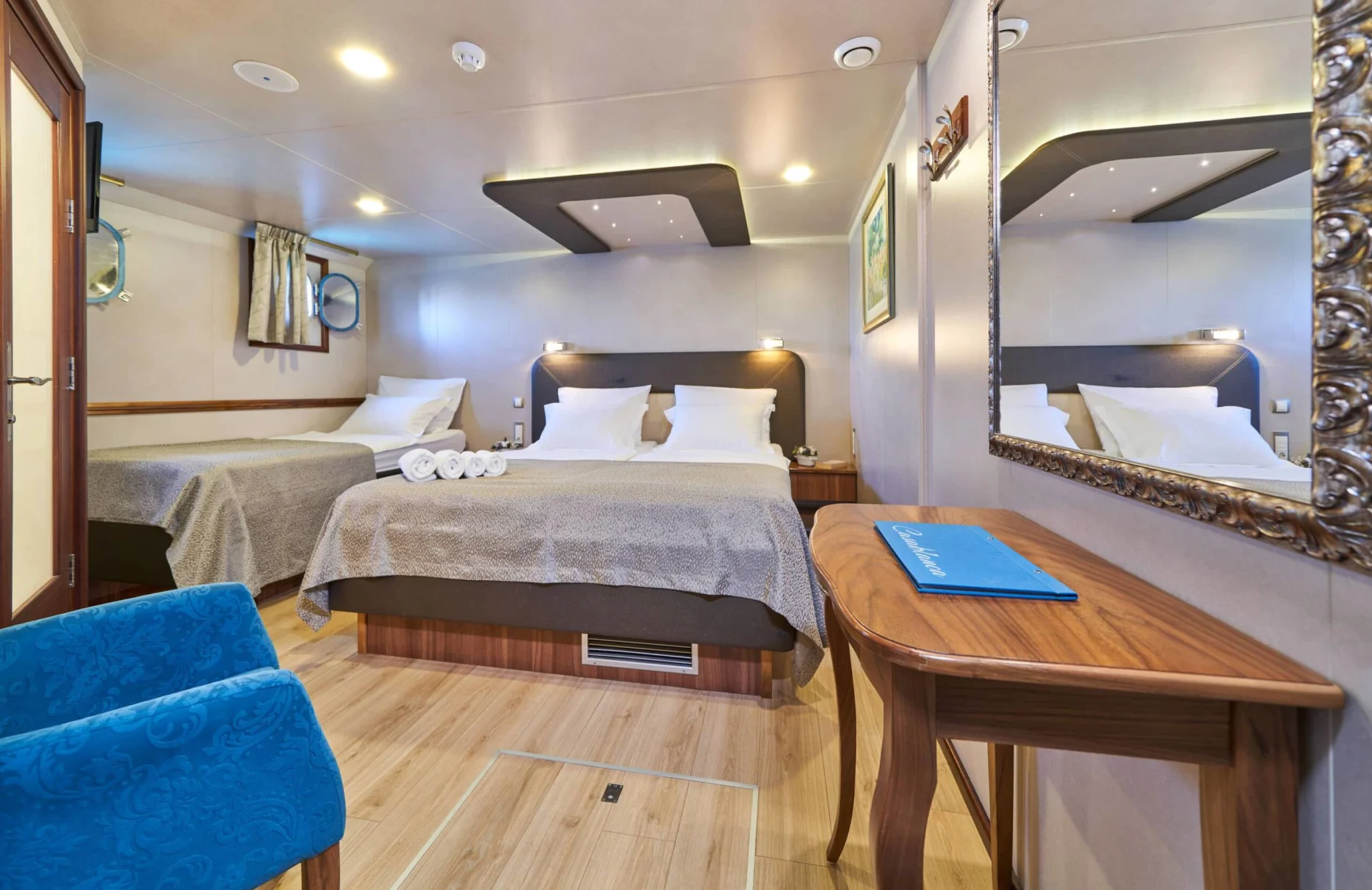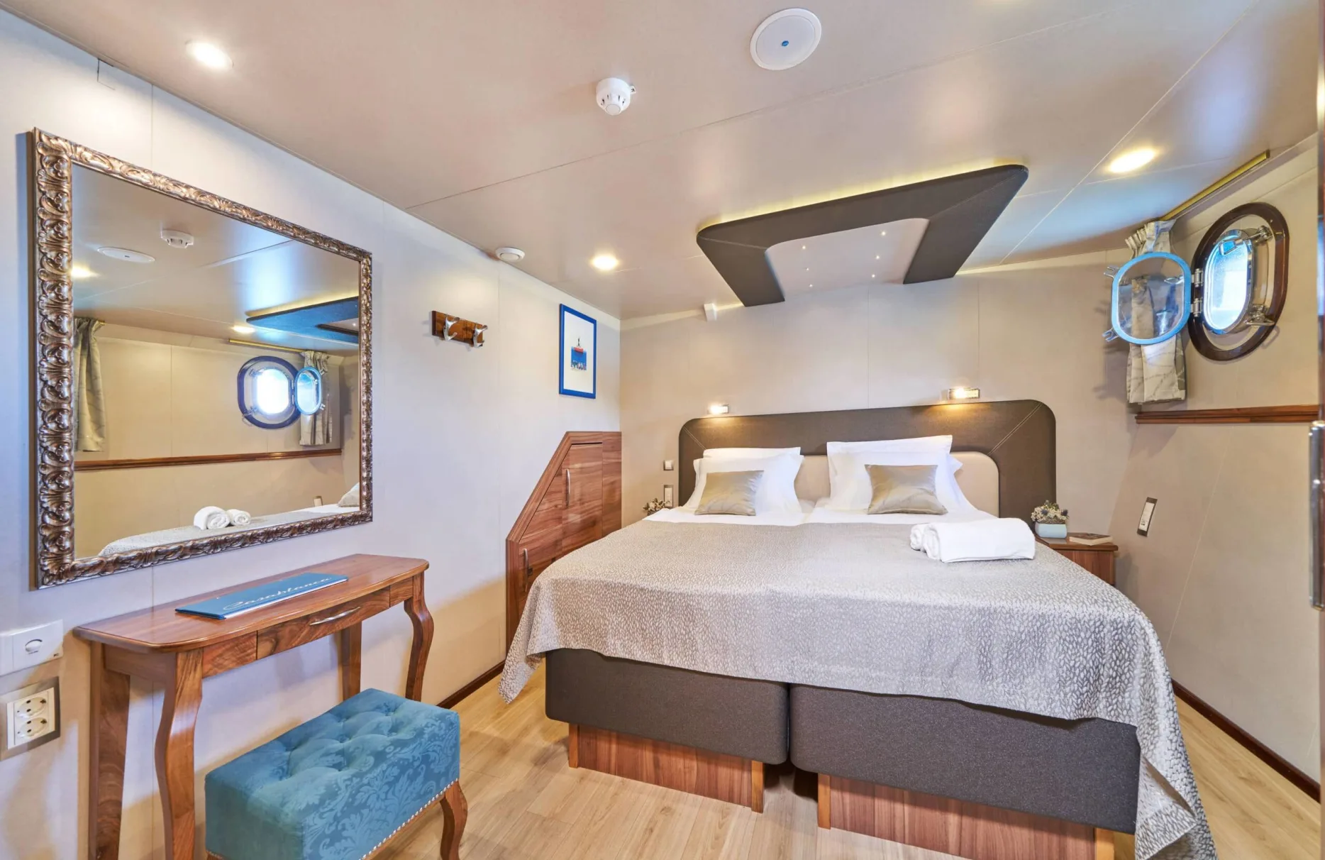 Casablanca’s accommodations are a testament to comfort and versatility, with 19 beautifully appointed cabins that cater to every need. Hosting up to 38 guests, the yacht features thirteen double cabins and six twin cabins, perfectly blending privacy with social spaces. Waking up aboard Casablanca is an experience in itself, as natural light floods each cabin, offering breathtaking sea views and a gentle start to each new day.