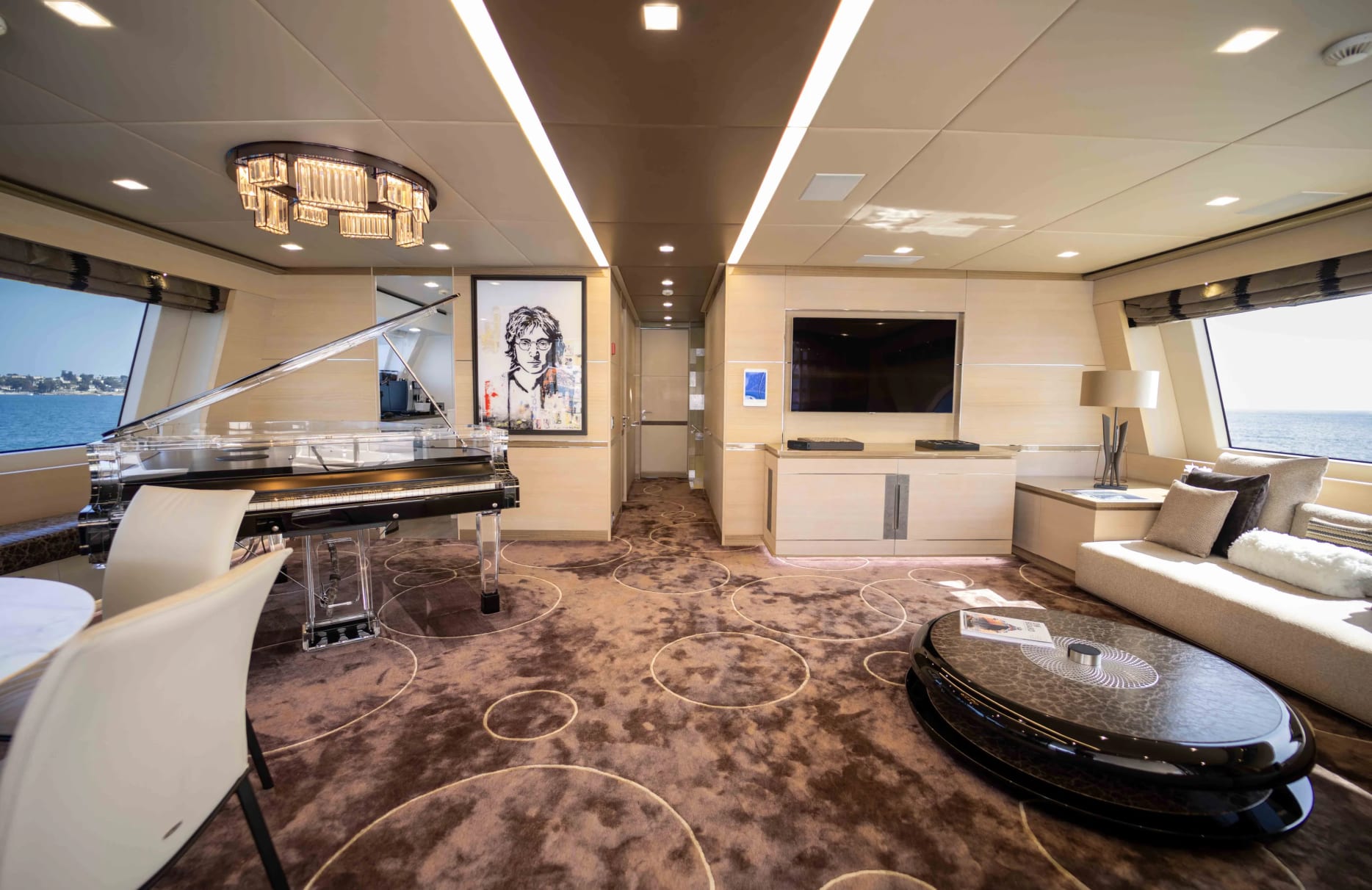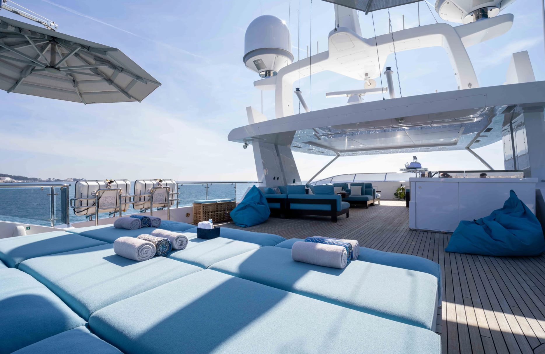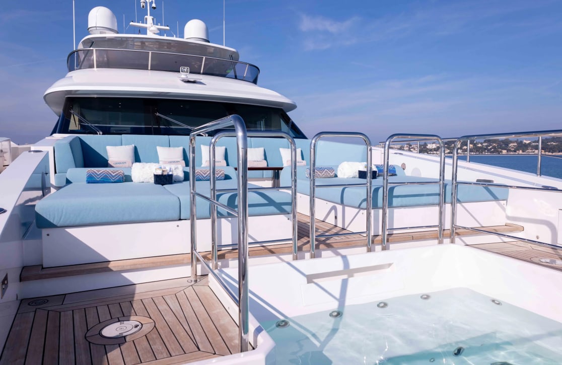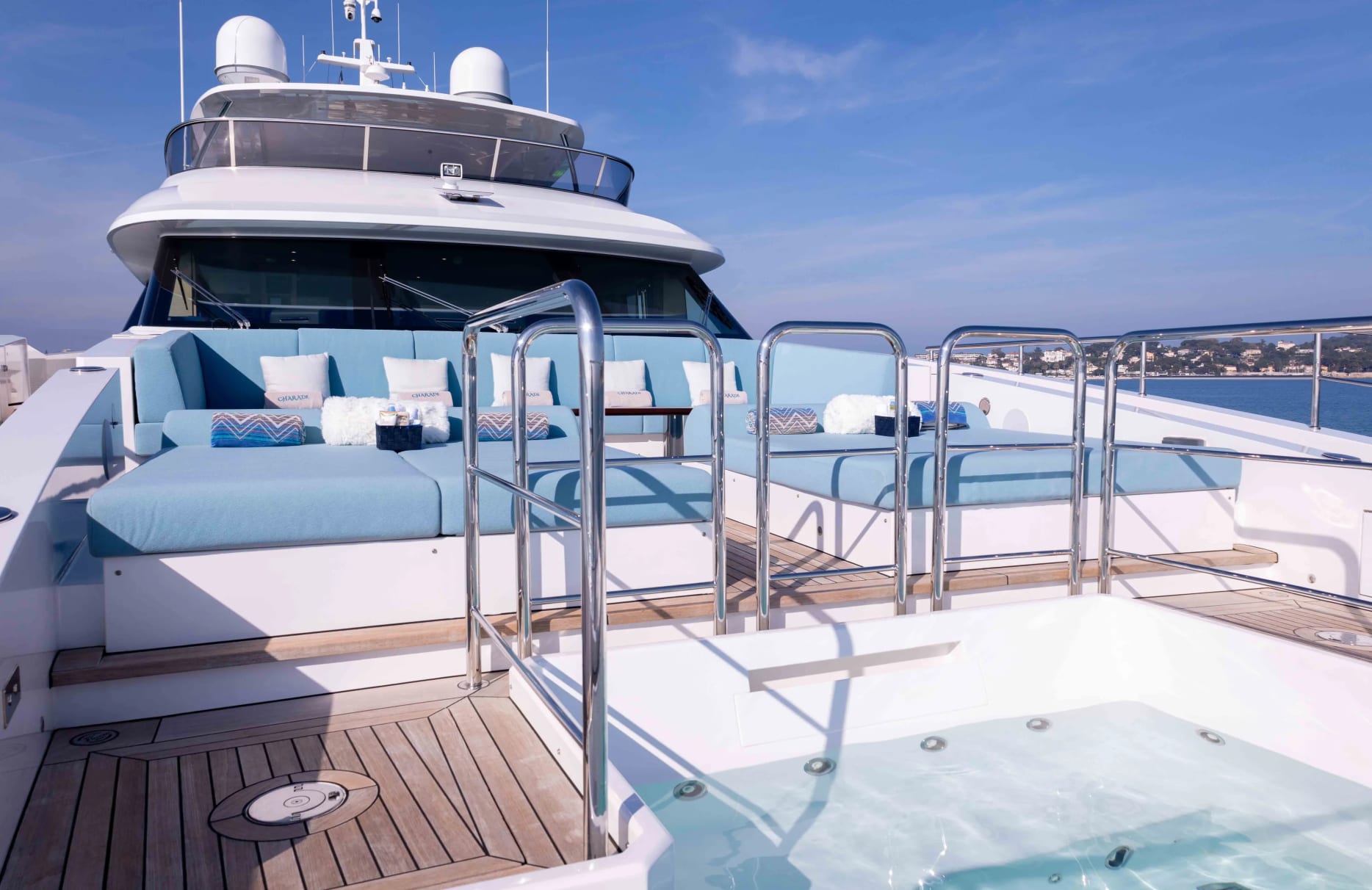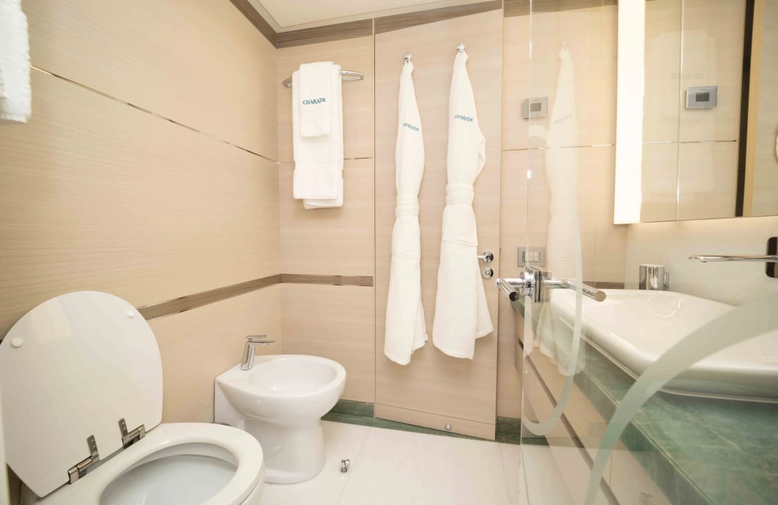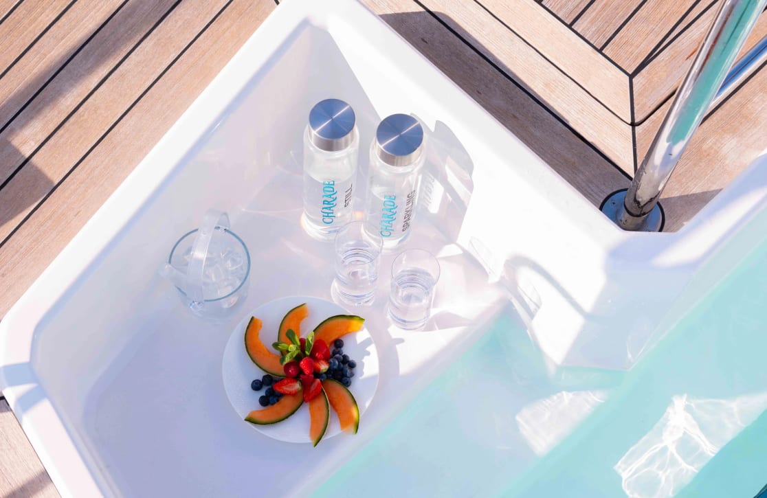 Onboard Charade, every moment is an invitation to indulge. As you step into her refined interiors, designed by the acclaimed RWD, a world of warmth and elegance unfolds. Unwind with the soothing melodies of the onboard piano as the sun dips below the horizon, or enjoy a quiet evening in the foredeck seating area, where an intimate table awaits your next al fresco dining experience. The deck Jacuzzi provides a perfect retreat for witnessing the ever-changing seascape, while the sun deck, with its plush sunpads and exterior bar, invites you to relax with a refreshing drink in hand. Charade ensures seamless connectivity with high-speed Wi-Fi, keeping you in touch with the world while you immerse yourself in this floating sanctuary.
