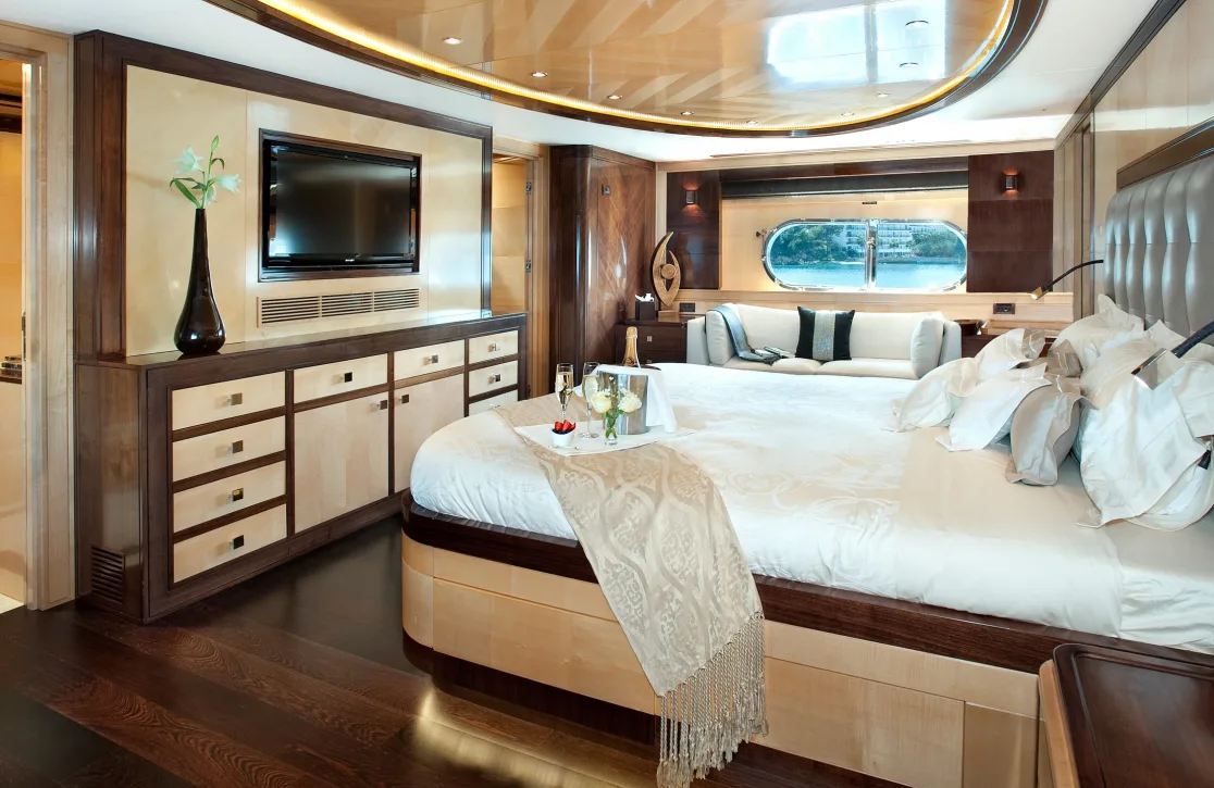 Christina G offers an inviting escape for up to ten guests, with accommodations that cater to both comfort and elegance. The master suite, along with two double and two twin cabins, are thoughtfully designed to provide restful retreats after days of exploration. Each cabin is a testament to the yacht’s dedication to detail, with plush bedding and serene decor creating an atmosphere of tranquility. Waking up aboard Christina G, the gentle sound of the sea sets the tone for another day of adventure, while the attentive six-member crew ensures every need is met with grace and discretion.