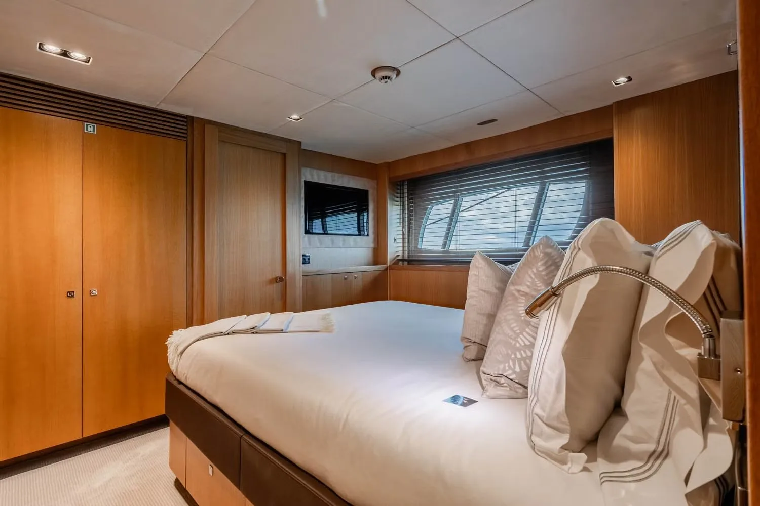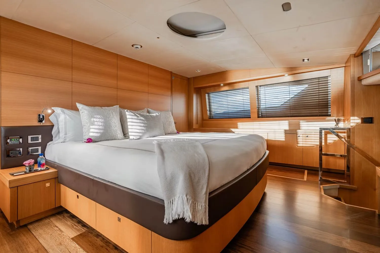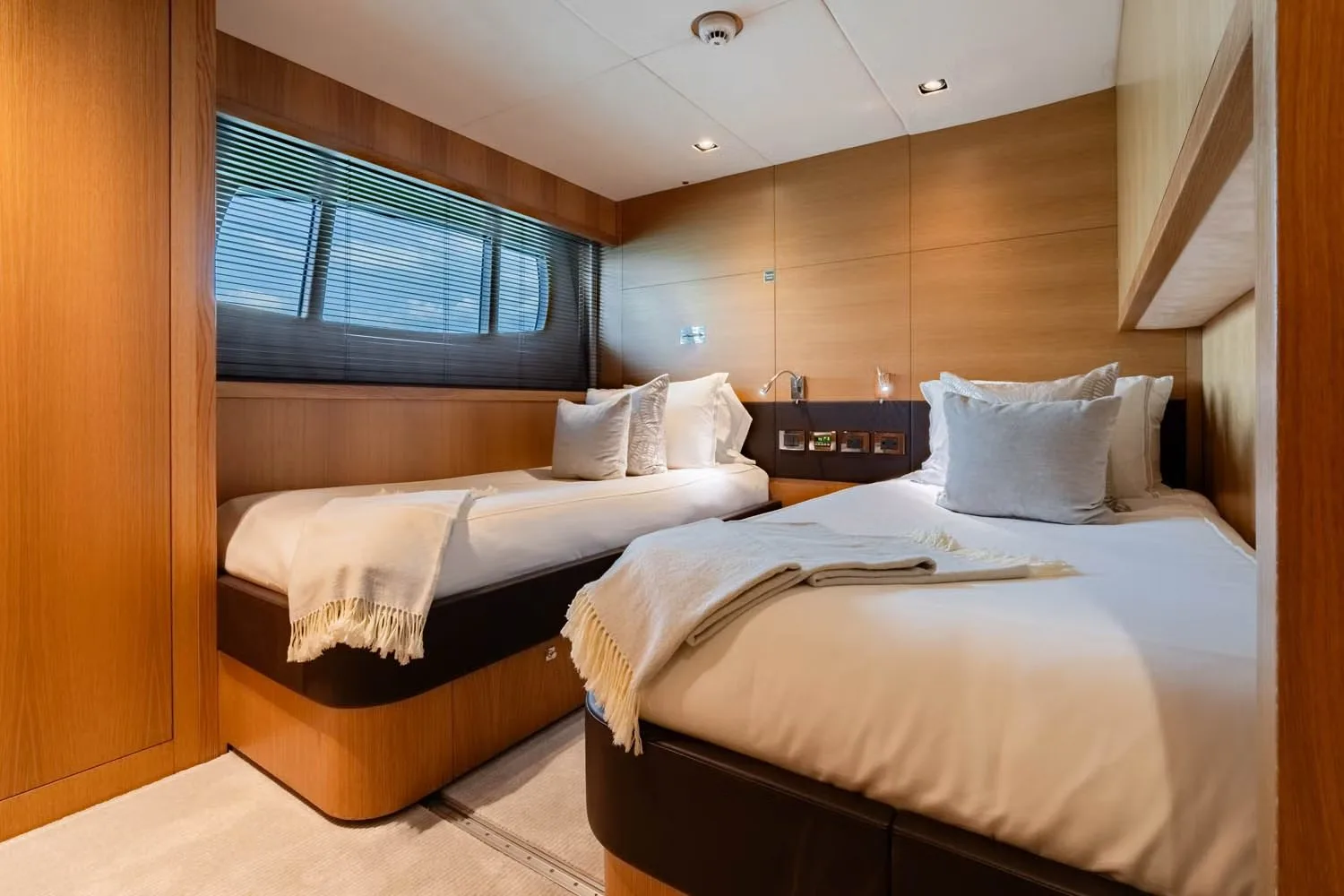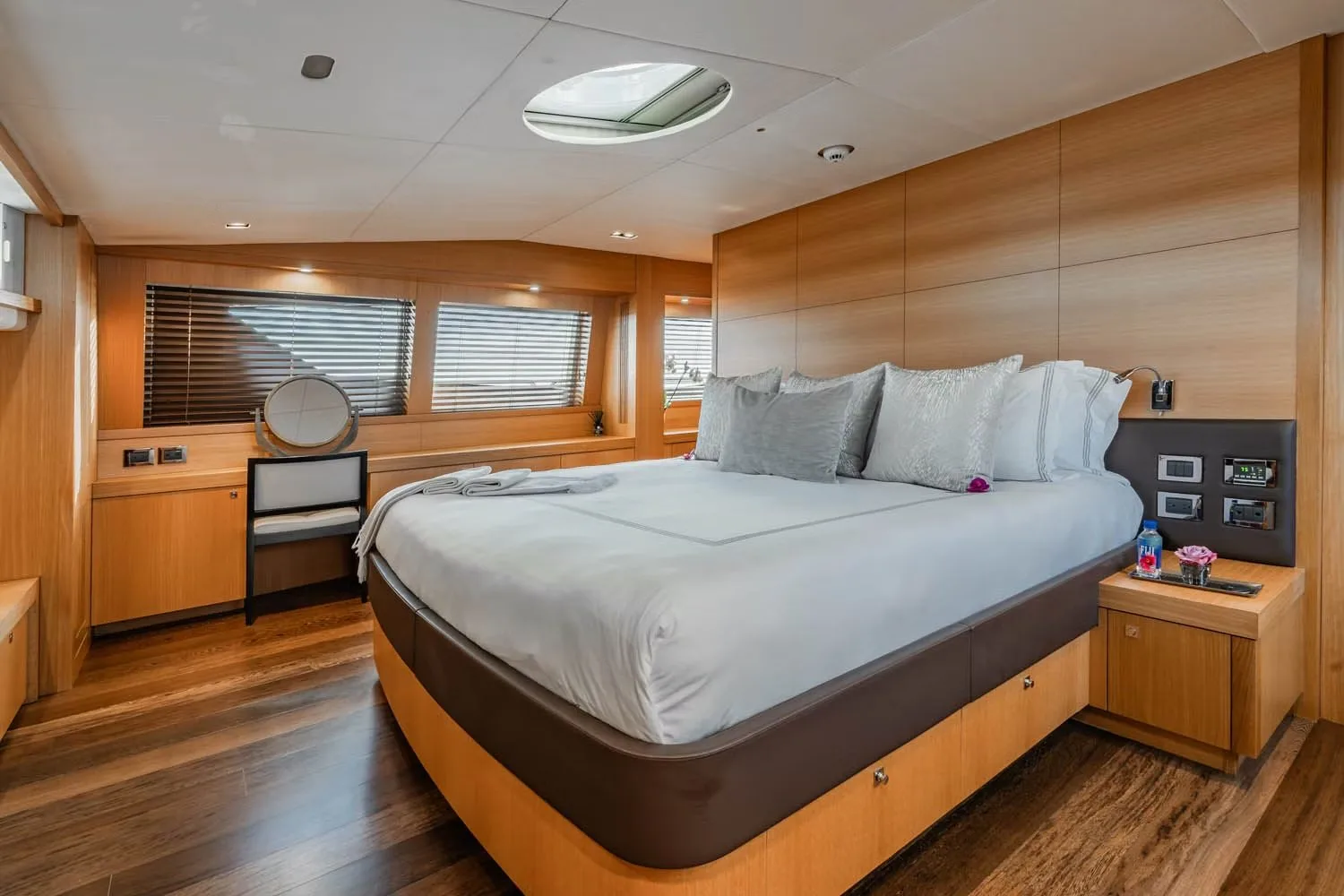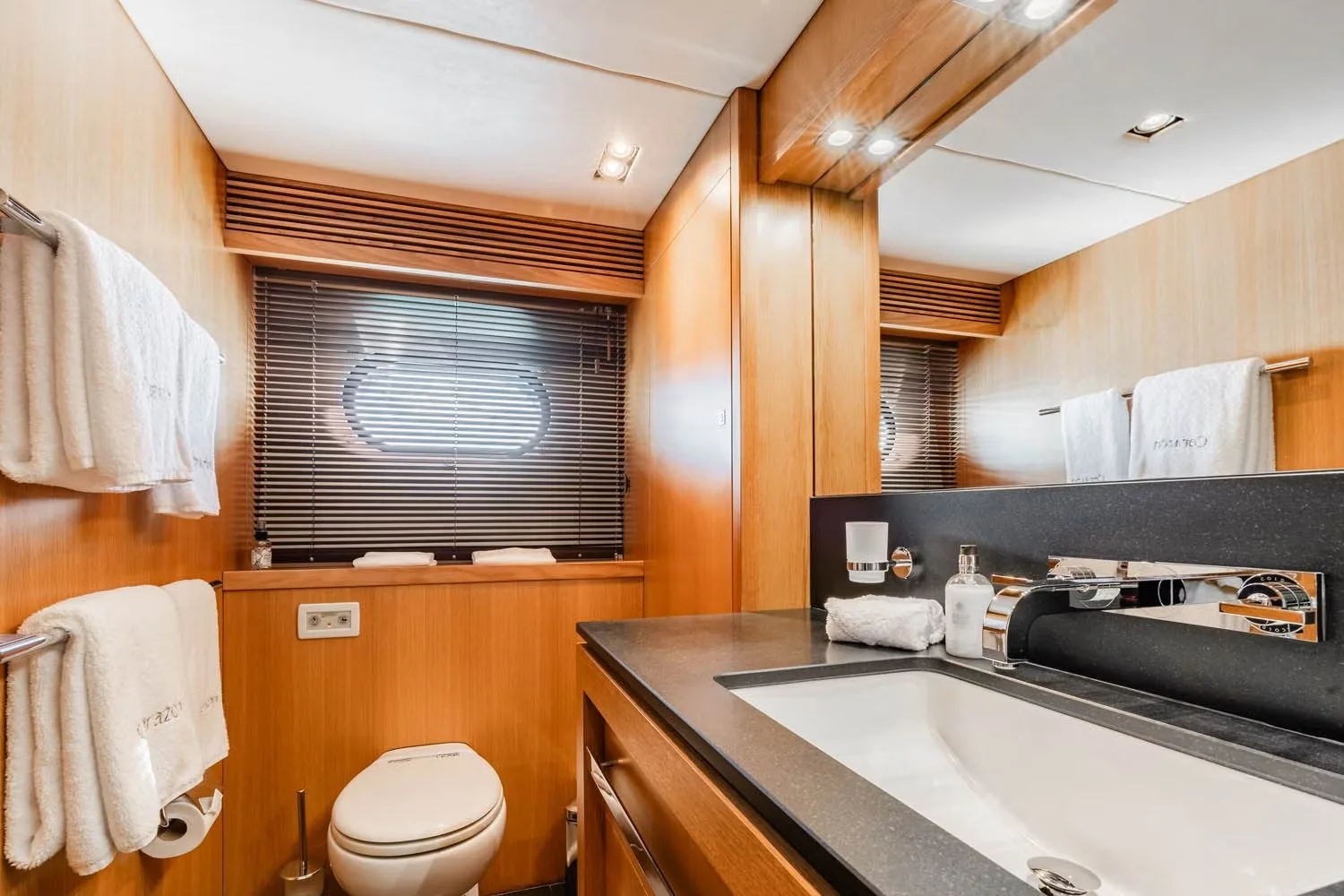 Corazon’s five beautifully appointed cabins offer a sanctuary of comfort and style, ensuring each guest wakes up refreshed and ready for new adventures. The lavish master suite, accompanied by two double cabins and two versatile cabins, provide ample space for up to ten guests to find their perfect retreat. Each cabin is thoughtfully designed to provide a restful escape, with plush furnishings and subtle lighting that create a warm and inviting atmosphere. Whether you choose a twin or double configuration, the experience is one of personalized comfort, allowing you to drift into dreams as the gentle sway of the yacht lulls you to sleep.