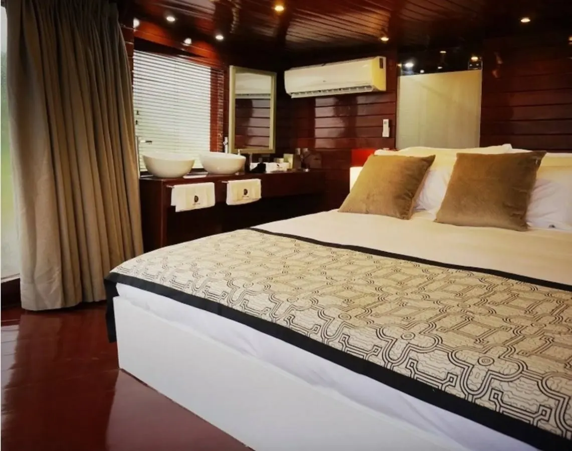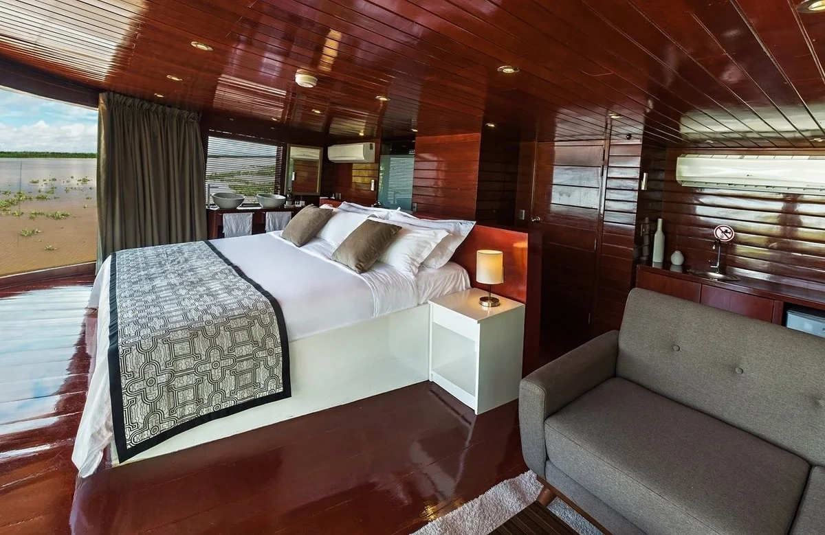 The Crucero Amazonas welcomes her guests into a realm of comfort with 13 well-appointed cabins, including a master suite, eight double cabins, and four twin cabins. Accommodating up to 26 passengers, each cabin is a sanctuary of serenity, offering the perfect retreat after a day of sun-soaked adventures. Wake up to the gentle sway of the ocean and the promise of another day filled with discovery and delight. The thoughtful design of the accommodations ensures a restful experience, where sophisticated interiors meet the soothing ambiance of life at sea.