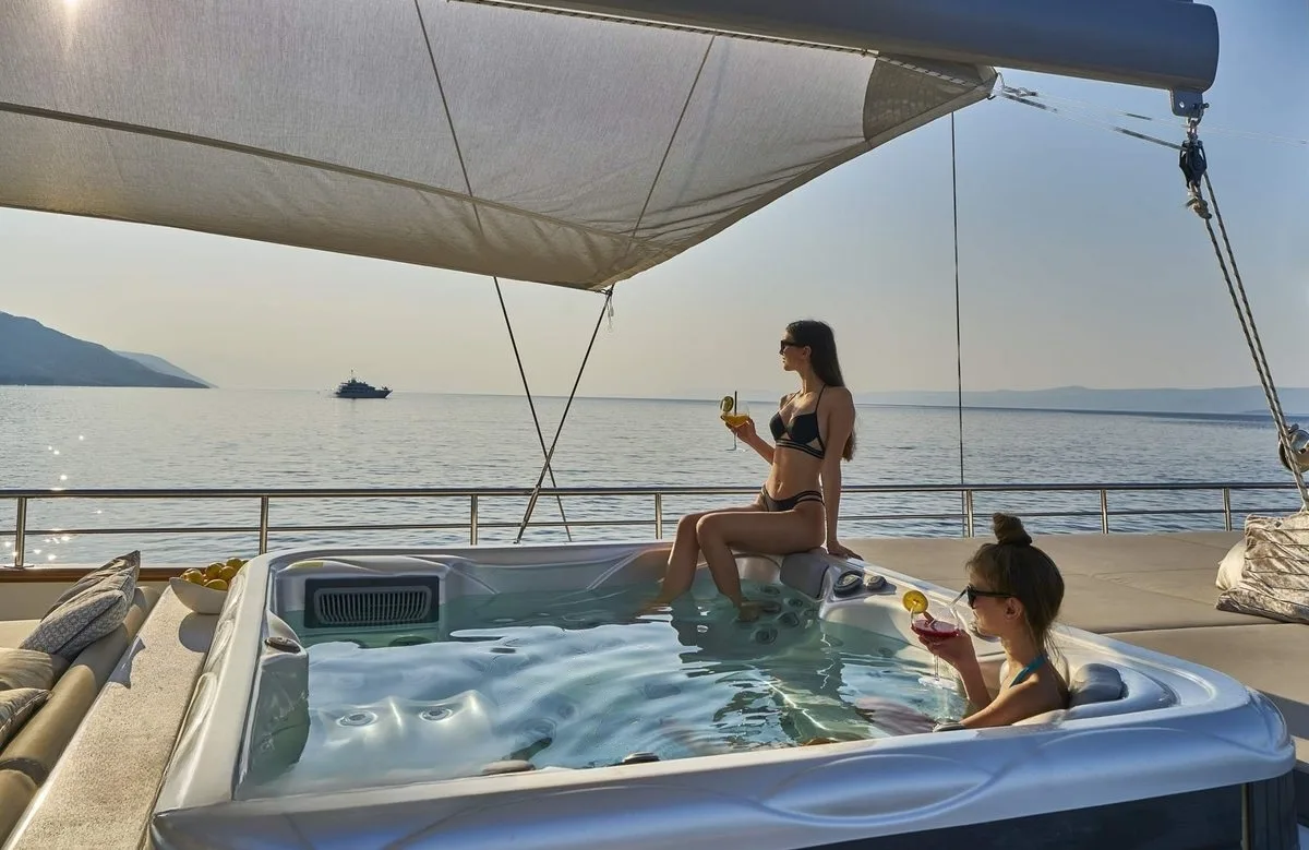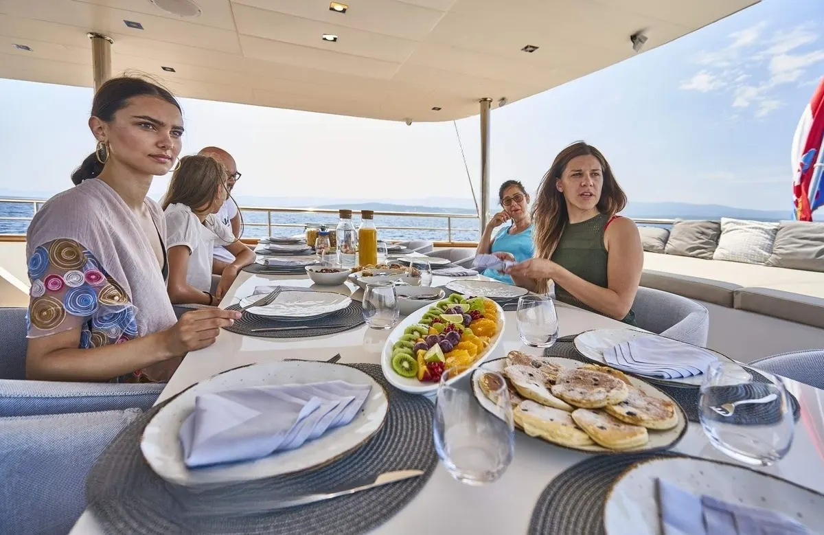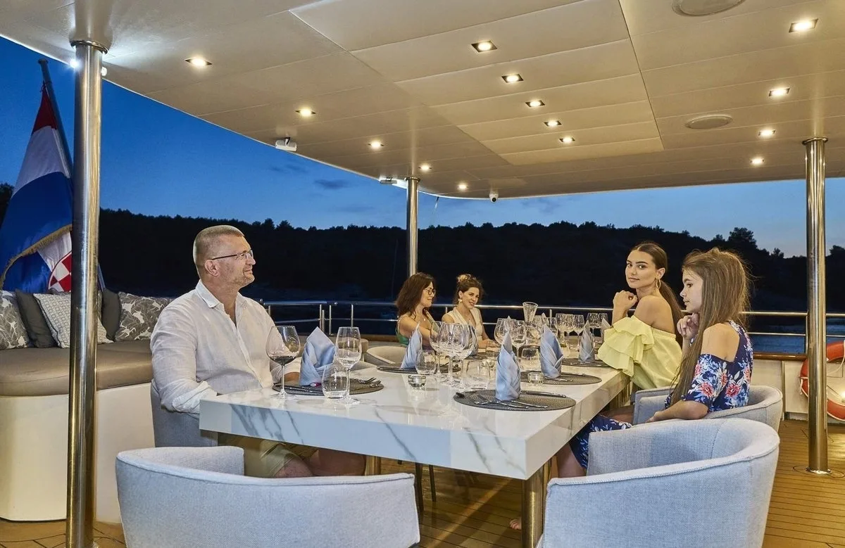 Aboard Dalmatino, each day unfolds with a blend of tranquility and excitement. Picture yourself unwinding in the deck jacuzzi as the sun sets over the horizon, or savoring a quiet morning on the sun deck, enveloped by the gentle sea breeze. With seamless Wi-Fi connectivity and air-conditioned interiors, every modern comfort is at your fingertips. The thoughtfully designed spaces invite you to indulge in both solitude and company, whether you’re sharing stories over a sumptuous meal or enjoying a moment of privacy with a book in hand.