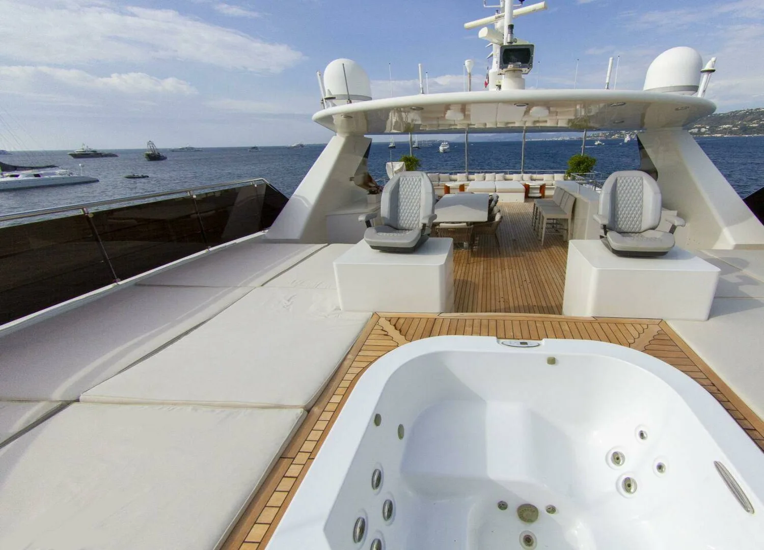 Aboard Darling, each moment is designed to indulge your senses, whether you’re seeking invigorating activity or serene relaxation. Begin your day with a sunrise session in the state-of-the-art gym, where you can maintain your fitness regimen while gazing out over the endless horizon. Later, unwind in the deck jacuzzi, its soothing bubbles complementing the champagne in hand, as the sun dips below the horizon. Throughout your stay, the yacht’s air conditioning ensures a pleasant ambience, allowing you to enjoy every space, from the chic indoor salons to the inviting outdoor decks, regardless of the day’s warmth.