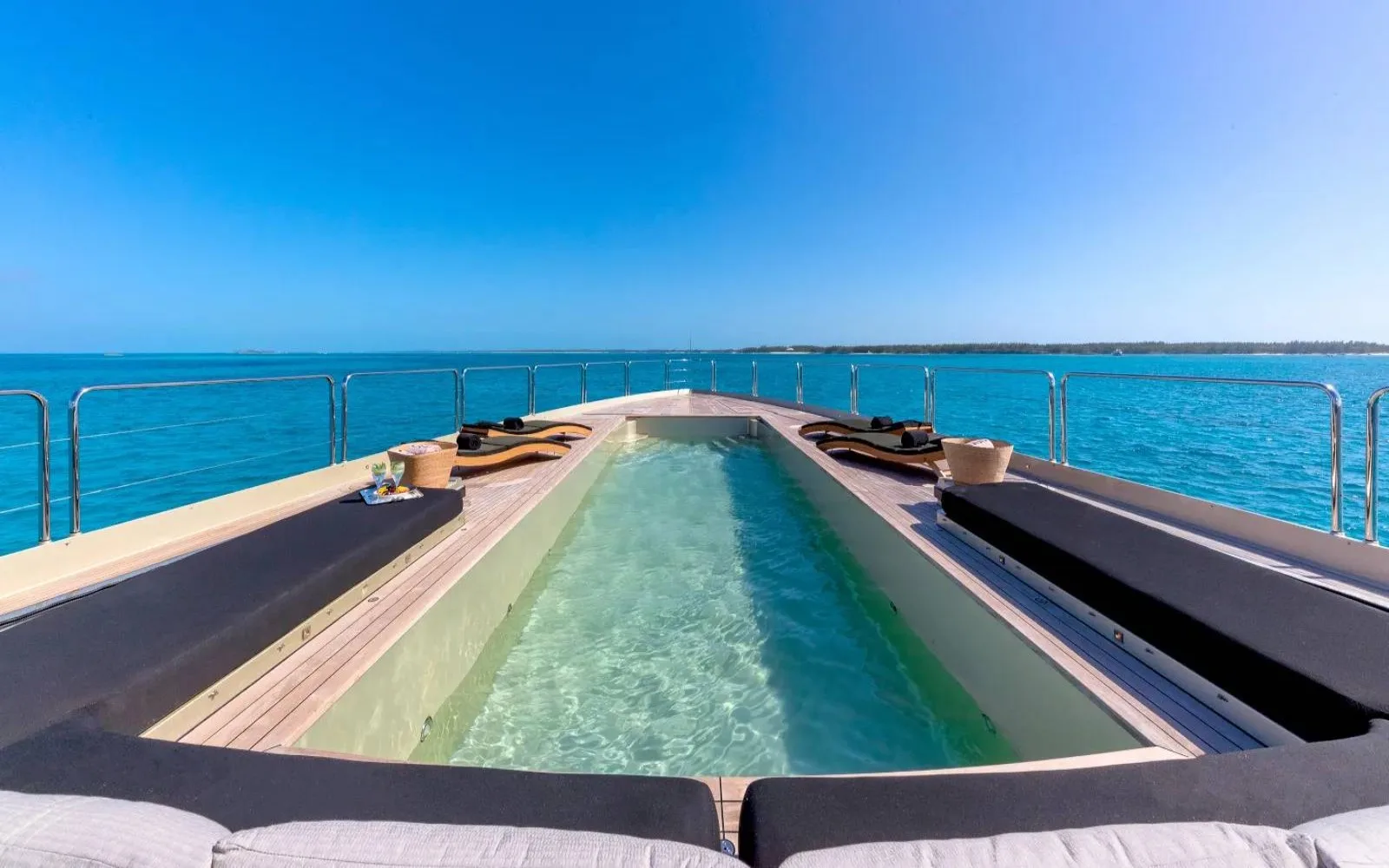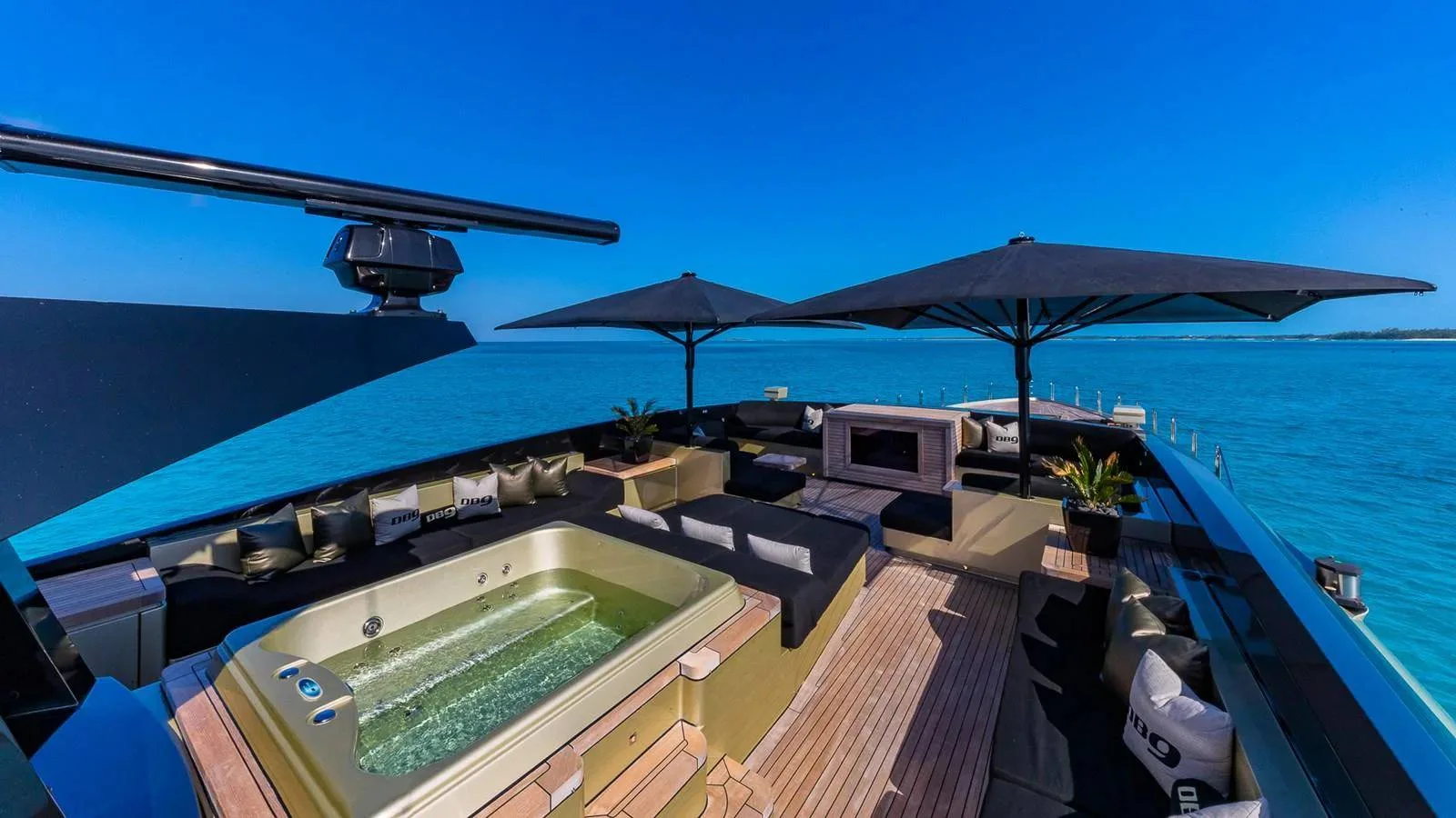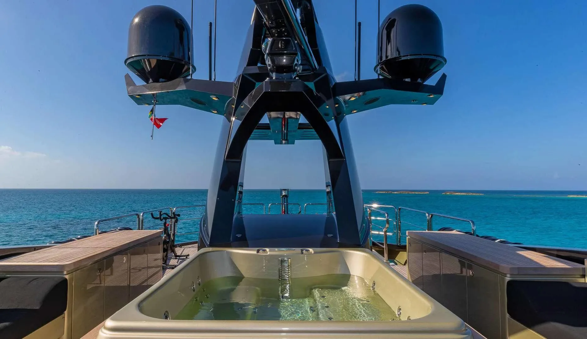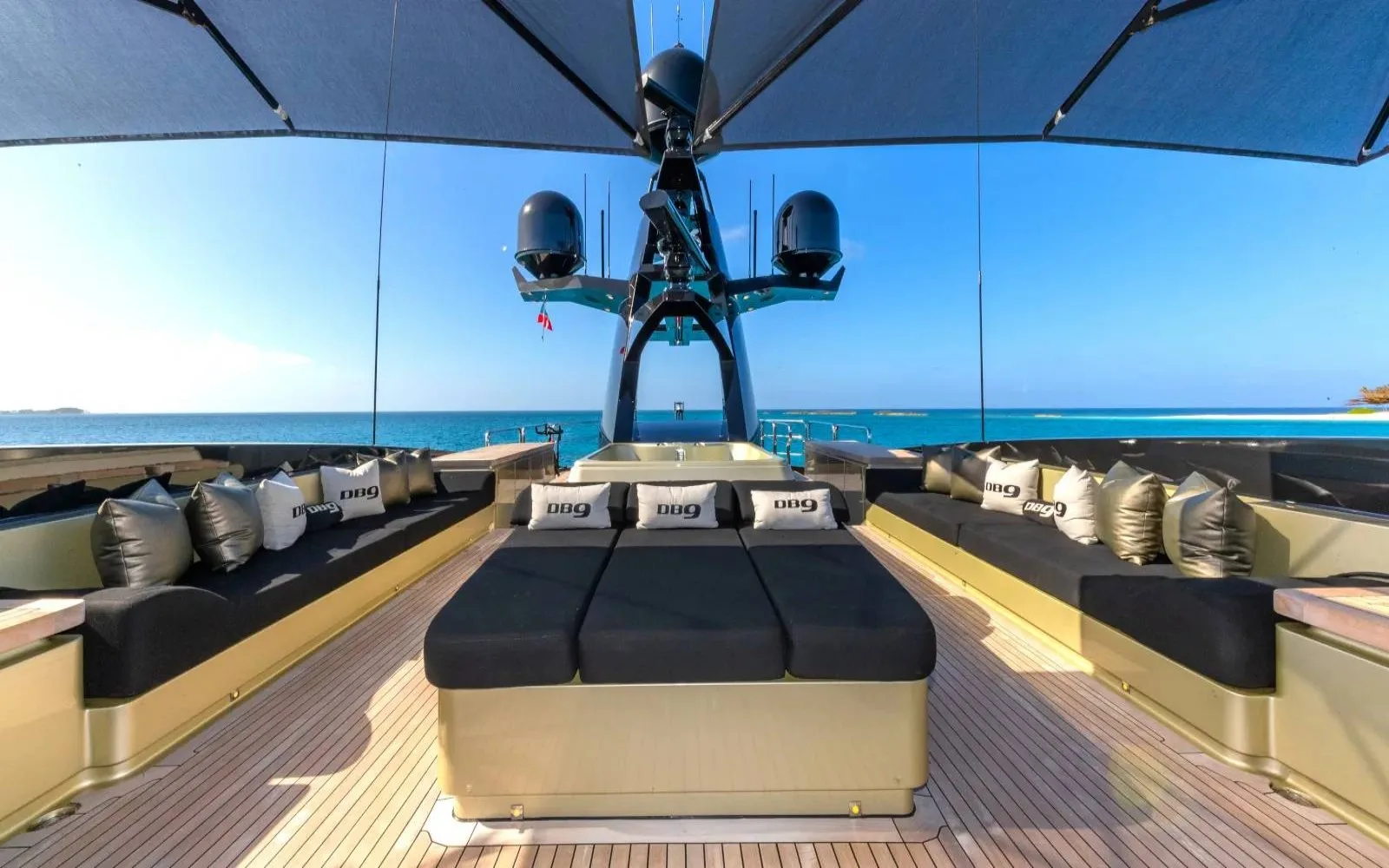 The DB9 invites you to experience life at sea with unparalleled comfort. Whether basking on sumptuous sunpads or enjoying the refreshing embrace of the deck jacuzzi, each moment is crafted for your delight. The yacht’s outdoor cinema offers a unique entertainment experience under the stars, while the air-conditioned interiors provide a cool retreat. At-anchor stabilizers ensure a smooth experience, allowing you to focus on the serene surroundings while sipping a cocktail from the exterior bar.