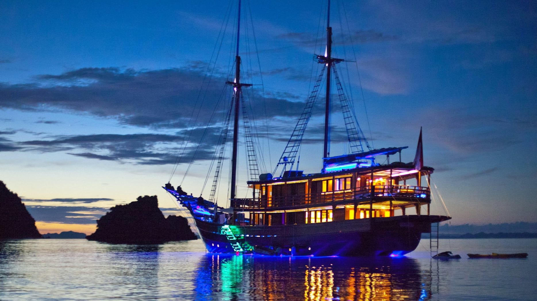 Embark on an unforgettable journey aboard the 51-meter Dunia Baru, a masterpiece of craftsmanship by the Konjo Boat Builders. This majestic vessel, a harmonious blend of traditional Indonesian design and modern comfort, invites you to explore the enchanting waters of Indonesia. As the sun sets, her dark hull and elegant rigging transform into a mesmerizing silhouette, promising an evening of serenity and wonder. During the...