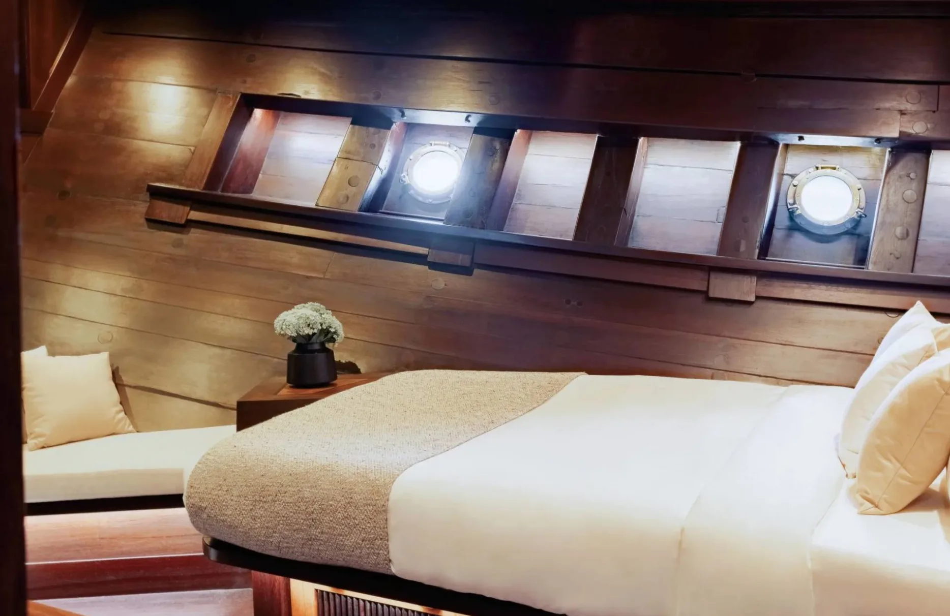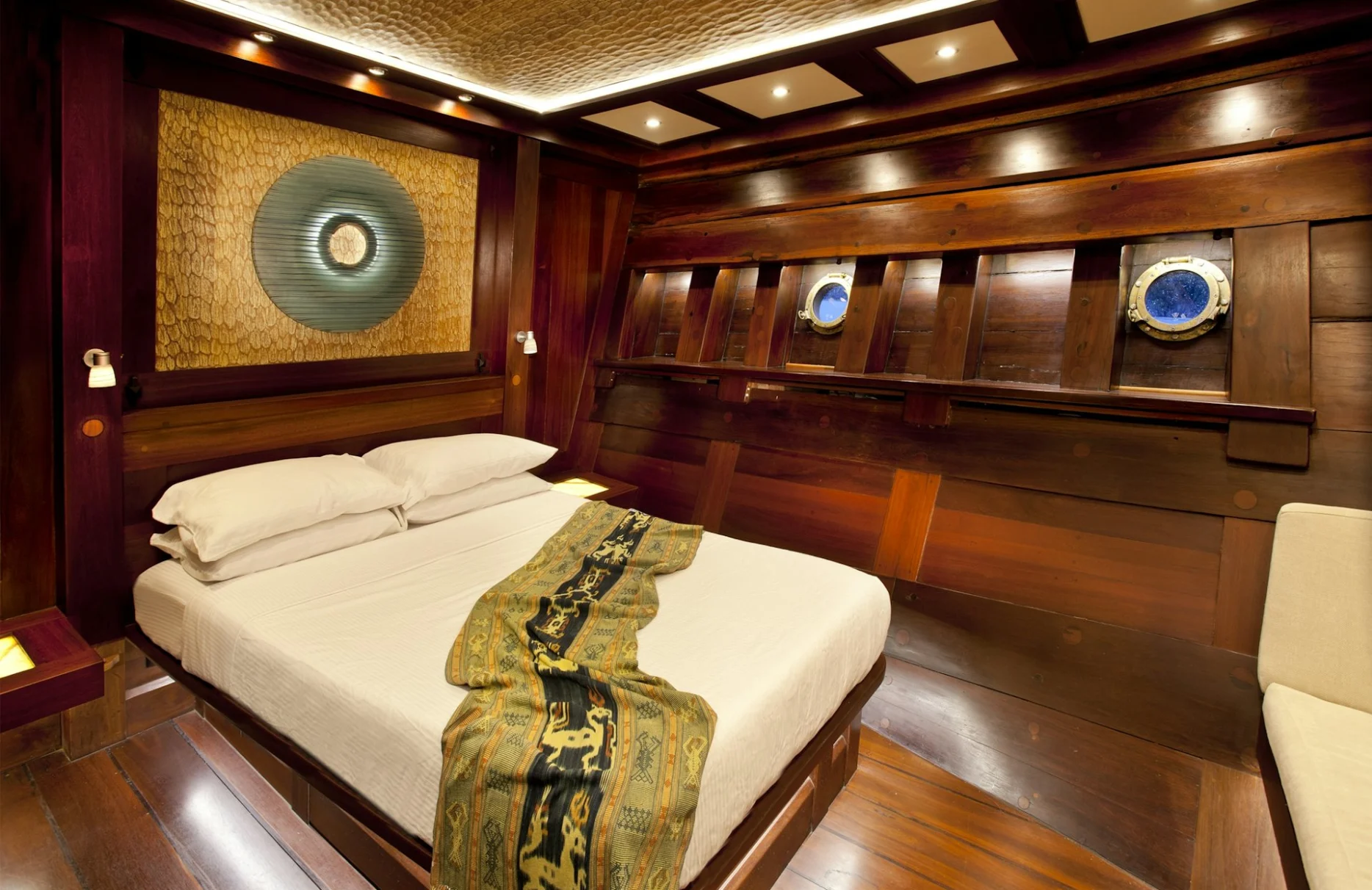 Dunia Baru accommodates up to 14 guests in seven exquisitely crafted cabins, each a sanctuary of comfort and elegance. The master suite, strategically located on the bridge deck, offers privacy and a personal retreat with expansive views. The six additional double suites on the lower deck are adorned with rich woods and engaging art, creating a warm, inviting atmosphere. Waking up aboard Dunia Baru, you’ll find yourself embraced by tranquility and inspired by the gentle sway of the ocean.