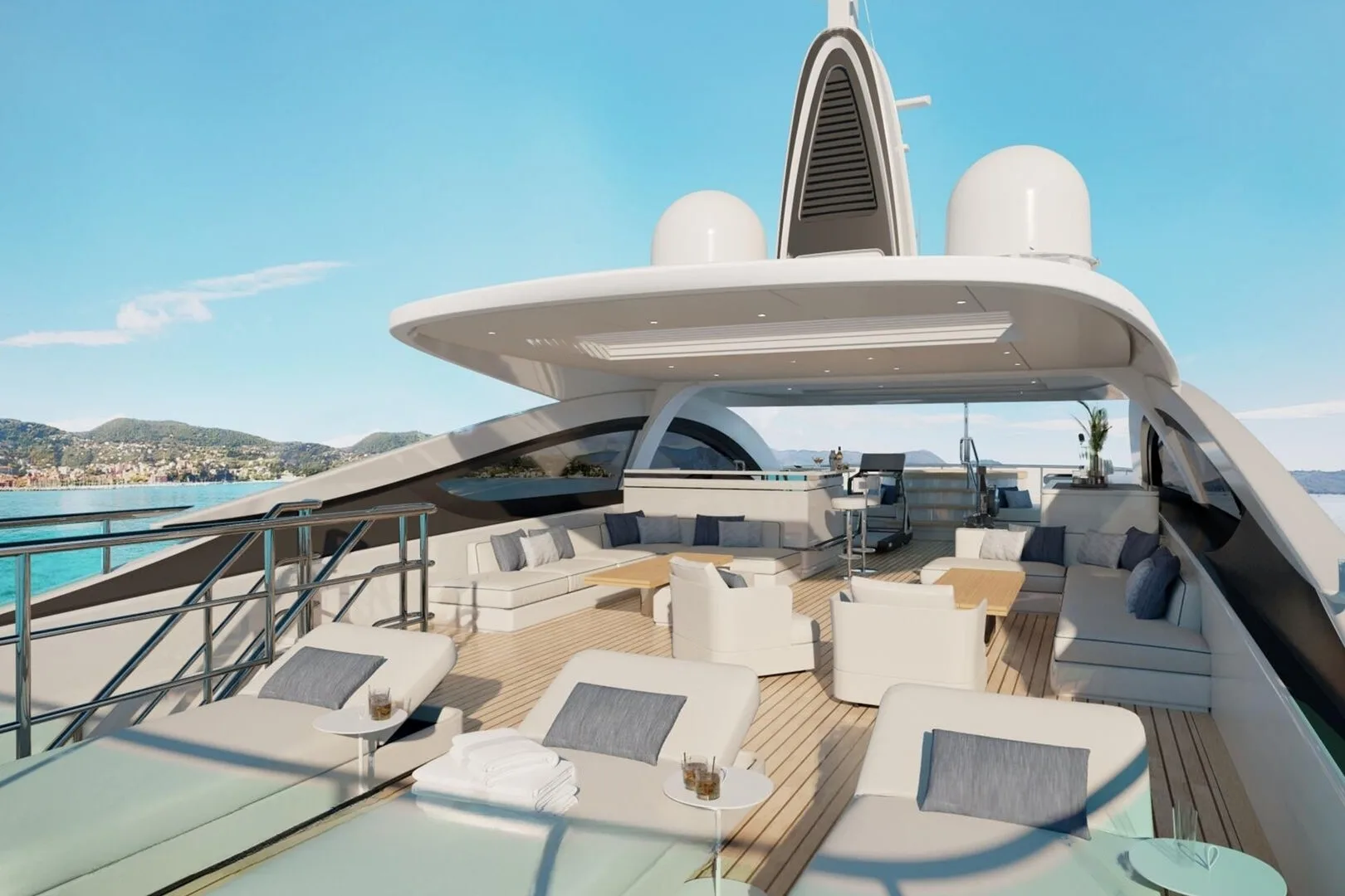 Life aboard Dyna® is a symphony of comfort and style, where each space is crafted for delight. Begin your day with a rejuvenating session in the onboard spa or take in panoramic views from the sun deck, where serenity reigns. The deck jacuzzi offers a tranquil escape, while the beach club is perfect for socializing or simply unwinding. As evening falls, gather around the exterior bar for a cocktail or enjoy a film under the stars in the outdoor cinema. Every detail, from the foredeck seating to the firepit, invites you to relax and revel in the moment.