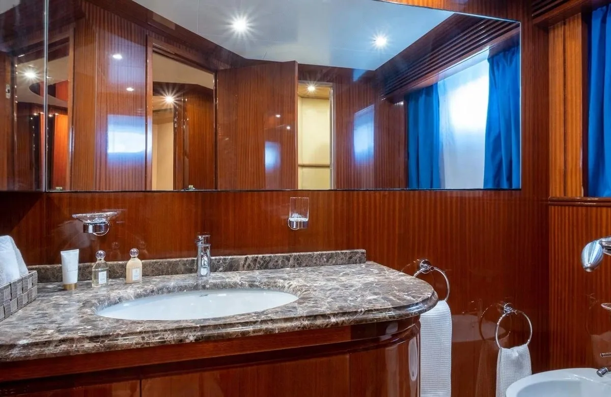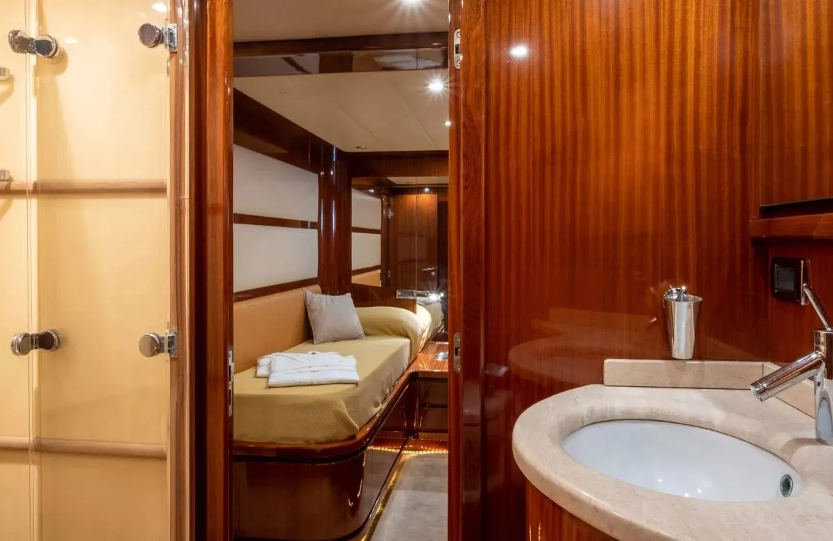 Eacos welcomes up to eight guests in her inviting quarters, ensuring a restful experience in one of the four beautifully appointed cabins. The gentle sway of the sea lulls you to sleep, and as dawn breaks, the promise of a new day greets you through wide windows framing the morning sun. Each cabin combines comfort with elegance, providing a restorative retreat after a day of Mediterranean adventures.