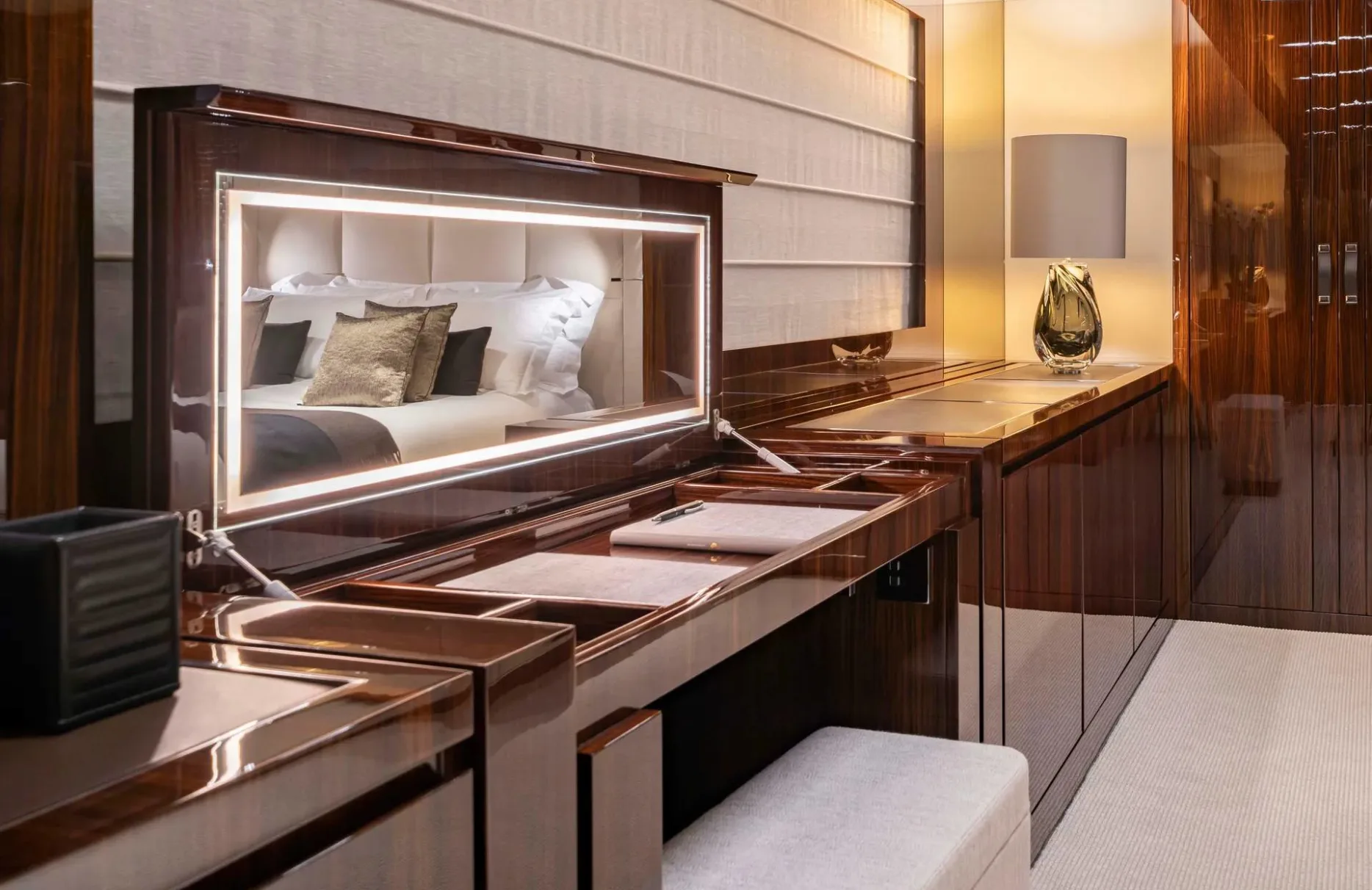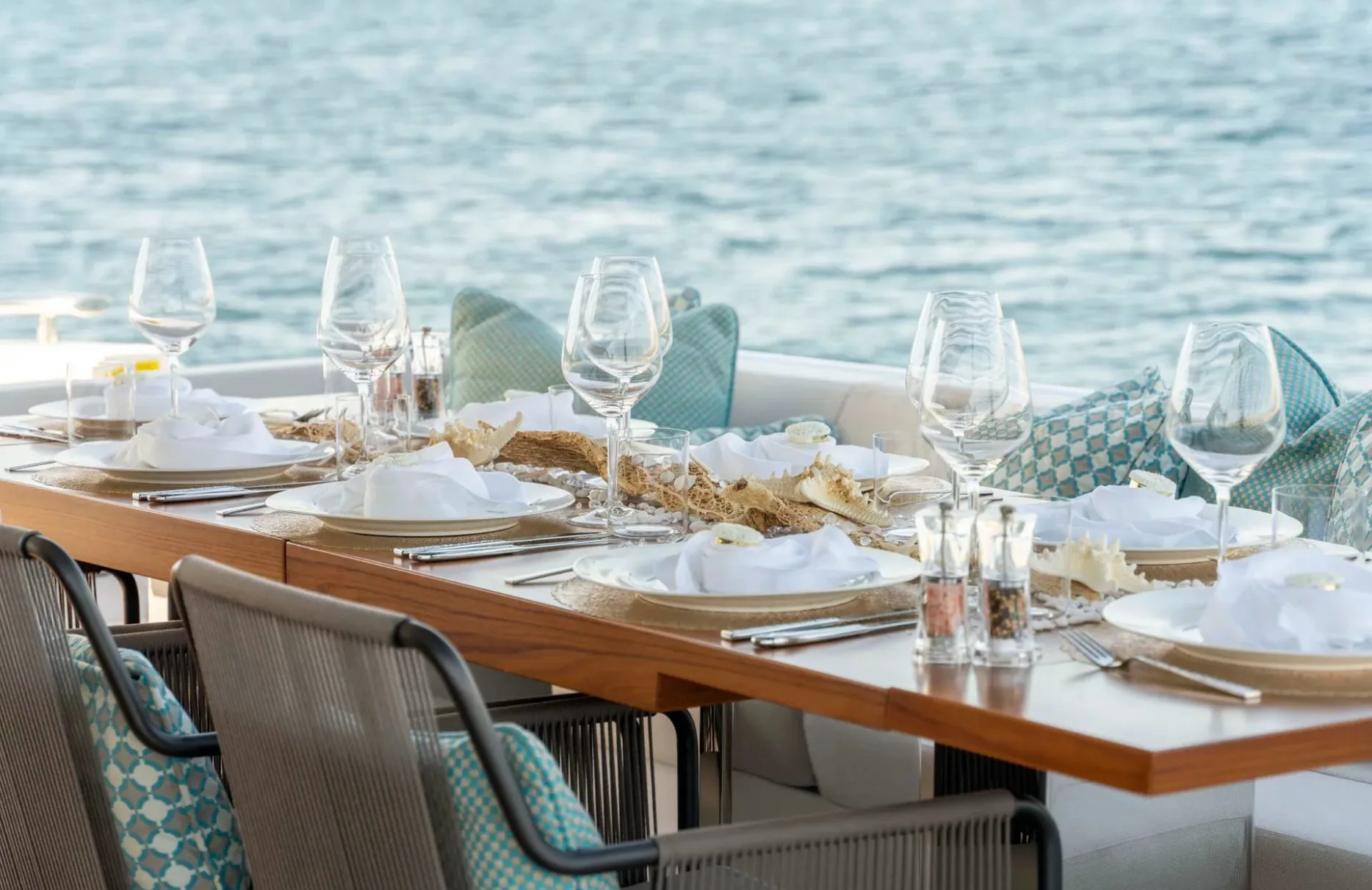 Aboard Elysium I, the ambiance is one of effortless sophistication. The interiors, crafted with precision by Officina Italiana Design, feature a stunning use of glass and wood that welcomes natural light and frames breathtaking ocean vistas. The main lounge, with its reflective glass ceiling, serves as an exquisite gathering spot, perfect for intimate evenings or lively social hours. Enjoy the convenience of Wi-Fi throughout your journey, while the yacht’s advanced stabilizers ensure a smooth ride. Whether lounging on sunpads or enjoying the refreshing swim platform, the yacht’s amenities are designed to enhance your voyage.