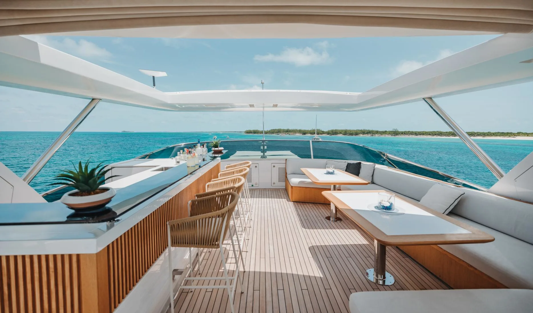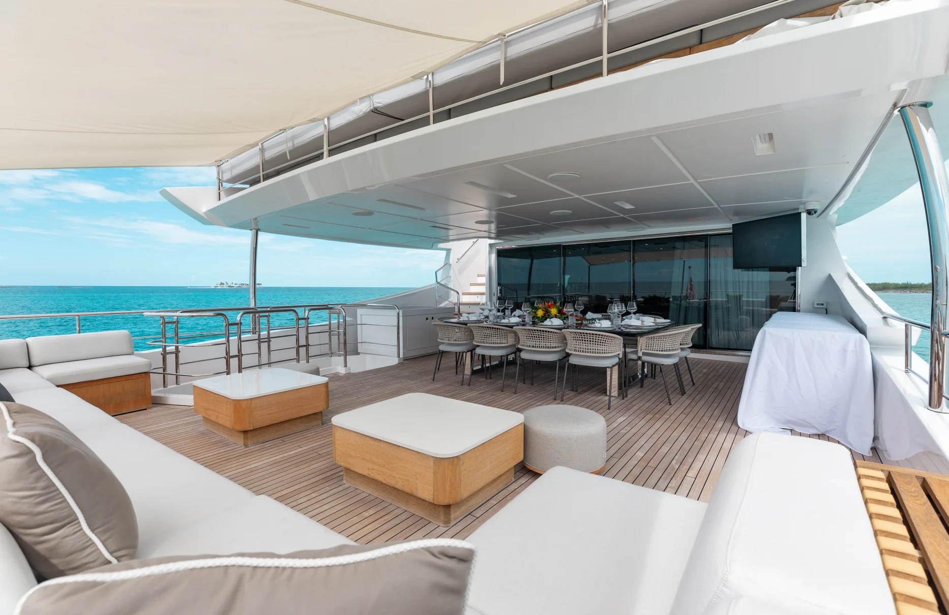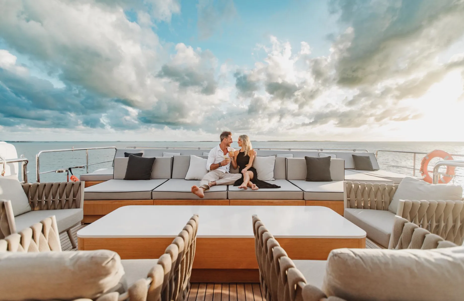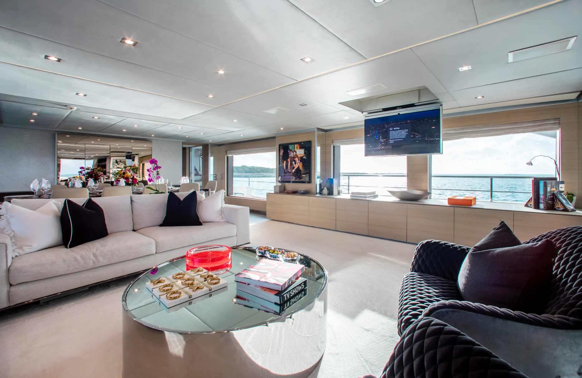 Onboard Emina, each day unfolds with a promise of rejuvenation and delight, thanks to an array of thoughtfully designed spaces and amenities. Begin your morning with an invigorating workout in the state-of-the-art gym, followed by a refreshing dip in the pool, where the water mirrors the azure sky. As the day transitions to evening, the deck jacuzzi becomes the ideal retreat for unwinding, a glass of champagne in hand, under a canopy of stars. The beach club offers a sanctuary for those moments when indoor-outdoor living beckons, while modern conveniences like Wi-Fi and air conditioning ensure a seamless blend of connectivity and comfort.