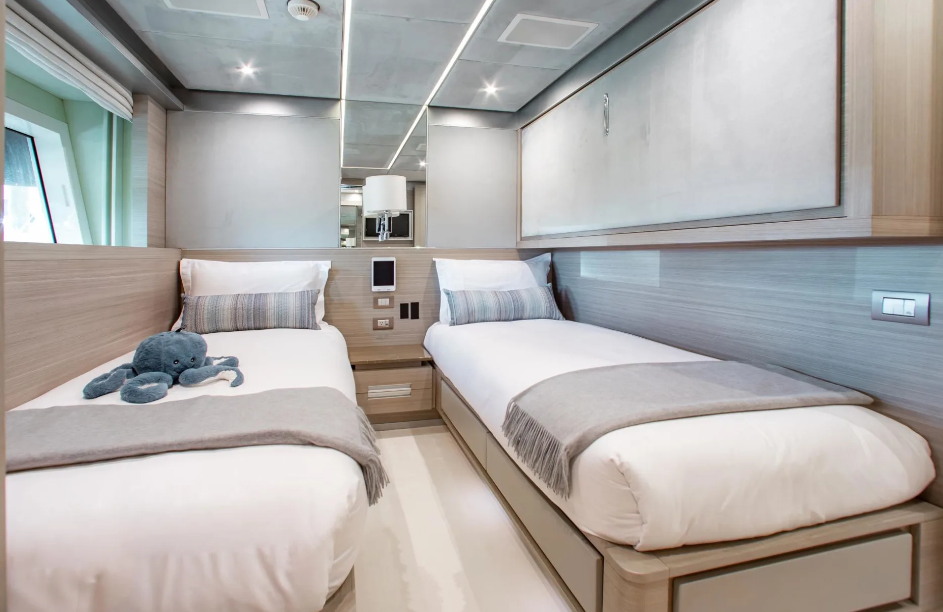 Emina welcomes up to 12 guests into its embrace, offering a sanctuary where rest and relaxation are paramount. The six beautifully appointed cabins, including a master suite and two VIP cabins, provide a haven of tranquility, each thoughtfully designed to enhance your stay. As dawn breaks over the horizon, waking up in these serene spaces feels like a gentle invitation to embrace the new day, with every comfort considered, from plush bedding to exquisite furnishings.