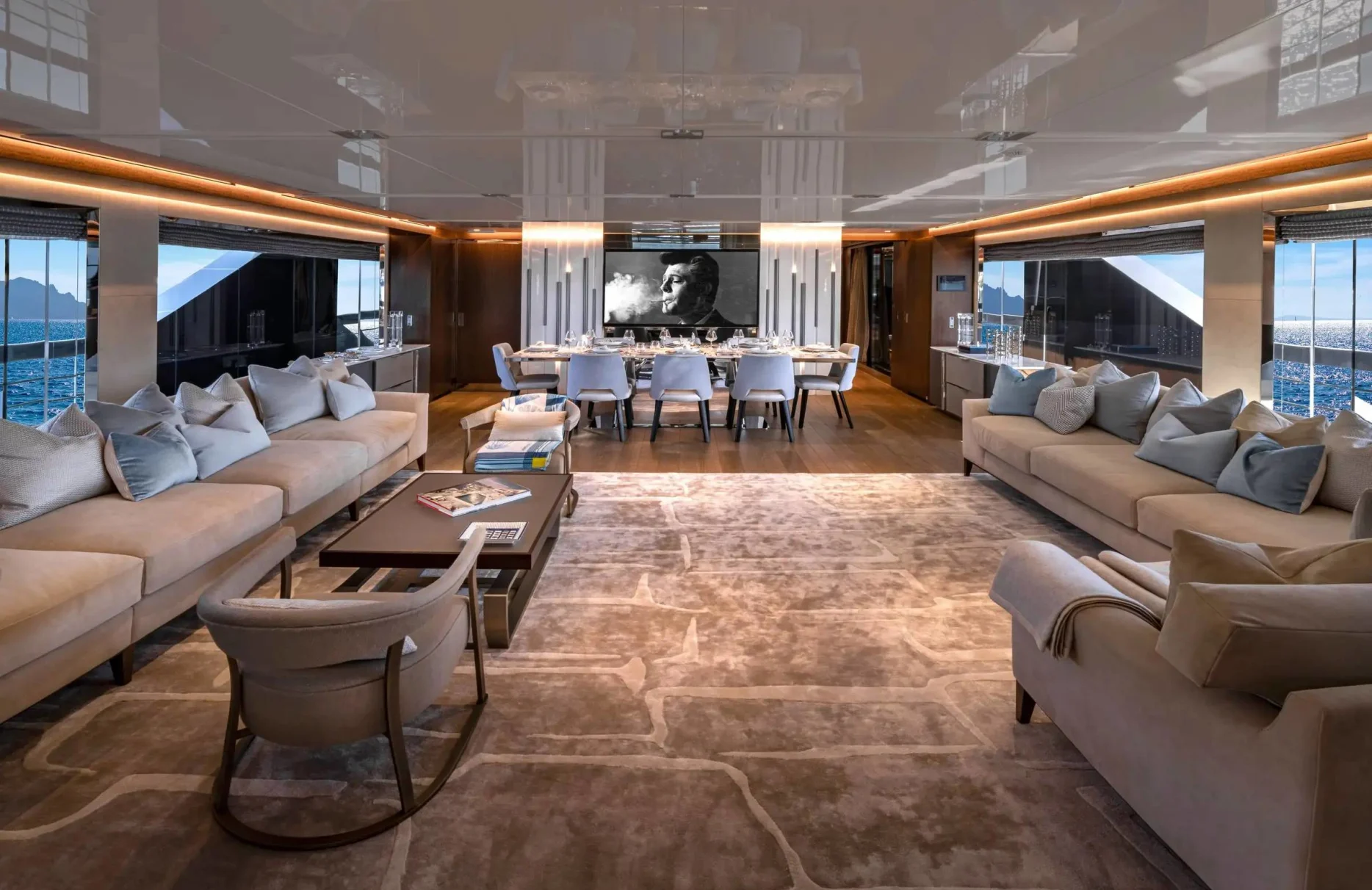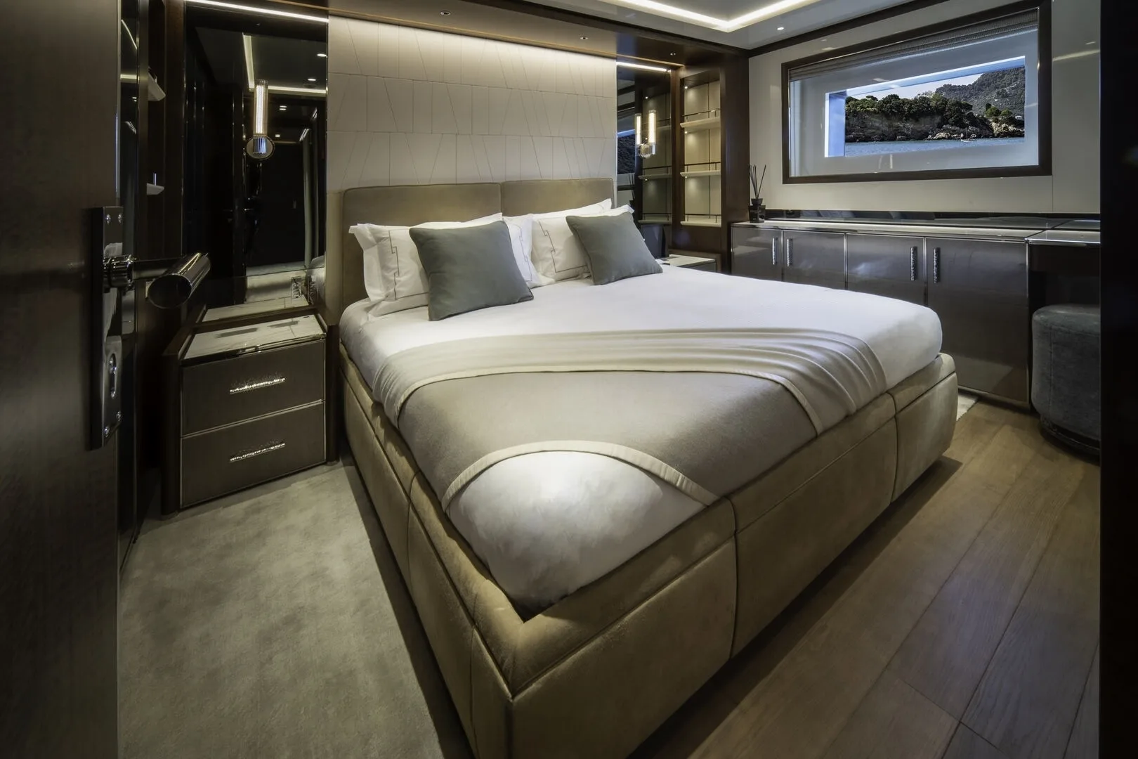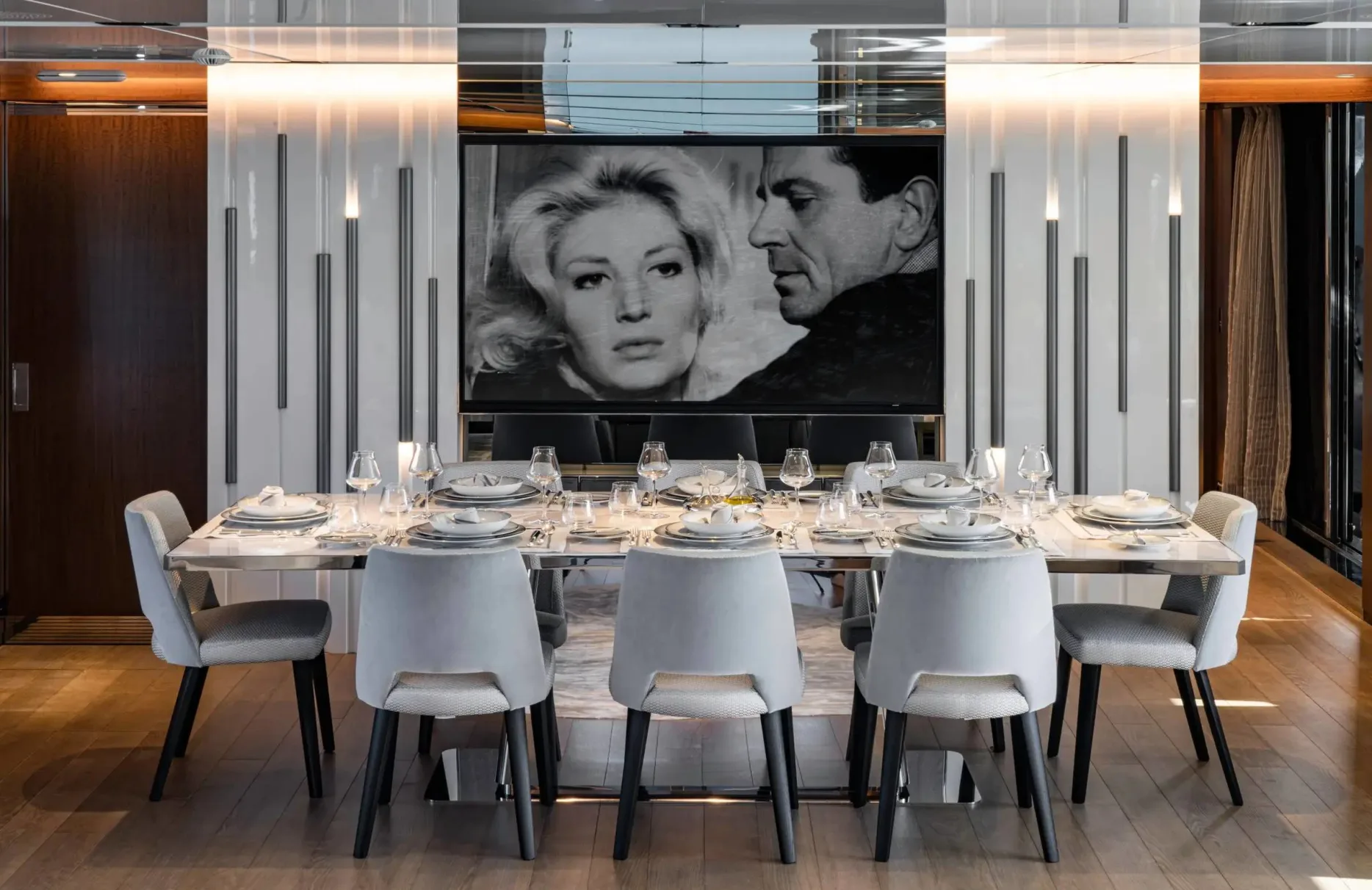 The Enterprise accommodates up to 10 guests in five splendid cabins, each a sanctuary of comfort and sophistication. The master suite is a private oasis with its own study and his-and-hers bathroom, ensuring a restful retreat. Two VIP cabins and two flexible cabins, which can be configured as twins or doubles, cater to every guest’s preference. As the morning sun filters through your window, waking up aboard the Enterprise is an exquisite experience, where the gentle sway of the yacht and the sound of waves provide the most serene alarm clock.