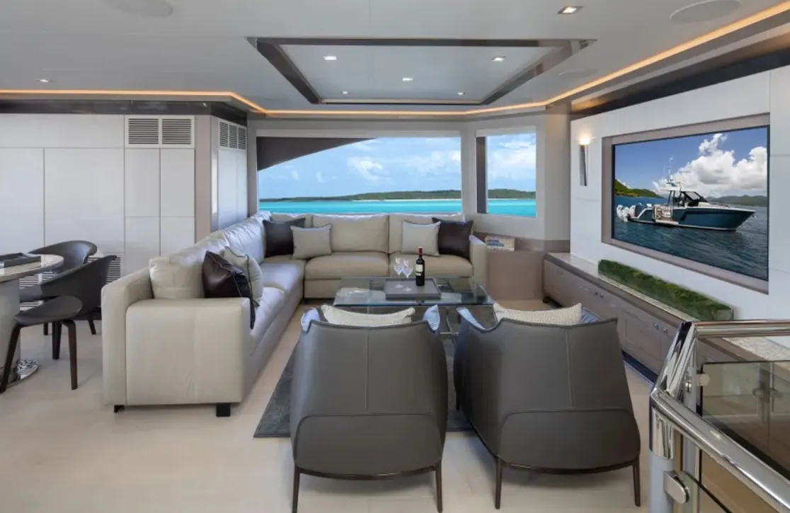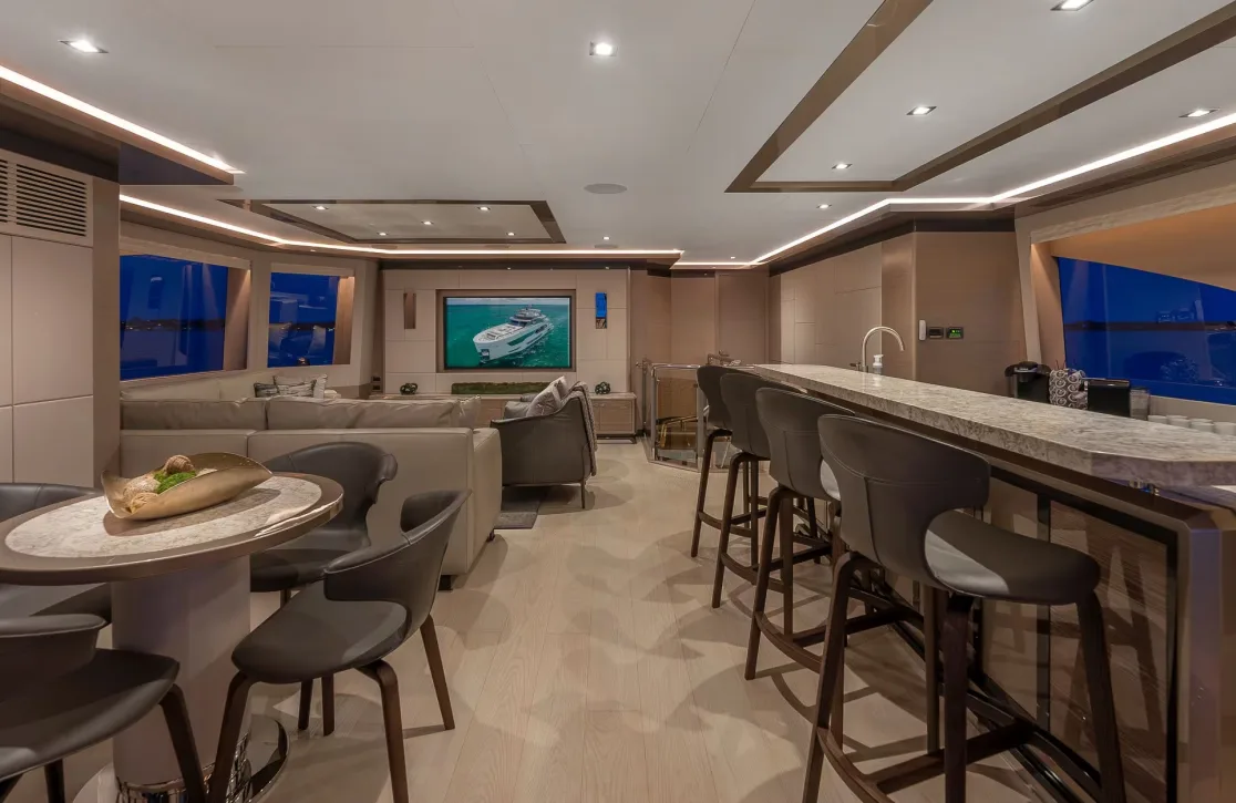 Life aboard the Entrepreneur is an orchestration of elegance and leisure. Guests can unwind in the beach club, where the gentle rhythm of the ocean provides a soothing backdrop. An evening might find you in the deck jacuzzi, under a canopy of stars, while the foredeck seating offers a perfect spot for al fresco dining. Fitness enthusiasts will appreciate the gym equipment, ensuring wellness is never out of reach. The yacht’s at-anchor stabilizers promise smooth sailing, allowing you to fully immerse in the serene surroundings.