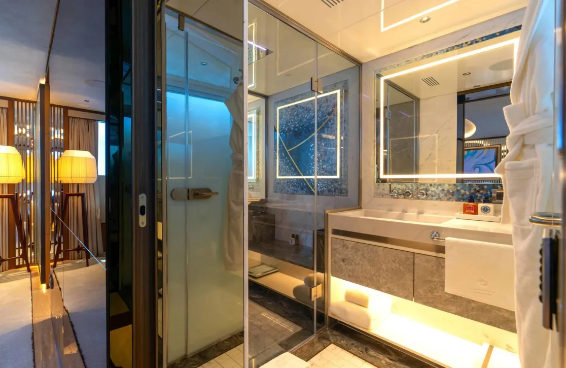 Eternal Spark welcomes up to 12 guests into a world of comfort across six cabins, each a sanctuary designed for rest and rejuvenation. The master suite, a full-beam oasis on the main deck, features a personal study and his-and-her bathrooms, ensuring privacy and indulgence. The versatility of her accommodations, including a VIP cabin and flexible double/twin cabins, caters to families and friends alike. Waking up aboard feels like a gentle embrace by the sea, with the promise of another day filled with the pleasures of yachting. The subtle yet attentive service of the crew ensures every night concludes in serene slumber, wrapped in the finest linens.