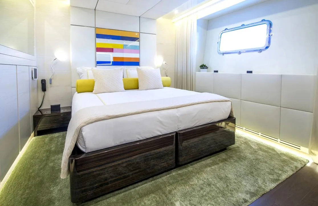 With accommodations for up to twelve guests across five elegantly appointed cabins, Ethos ensures every moment aboard is steeped in comfort. Each morning, awaken to the gentle lapping of waves and the promise of new adventures. The master suite and two VIP cabins offer a haven of tranquility, while convertible spaces allow for versatile sleeping arrangements, ensuring that families and friends can enjoy their time together in perfect harmony. The attentive nine-member crew discreetly caters to your every need, enhancing the experience with their dedicated service.