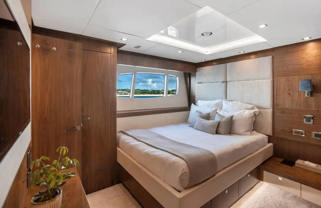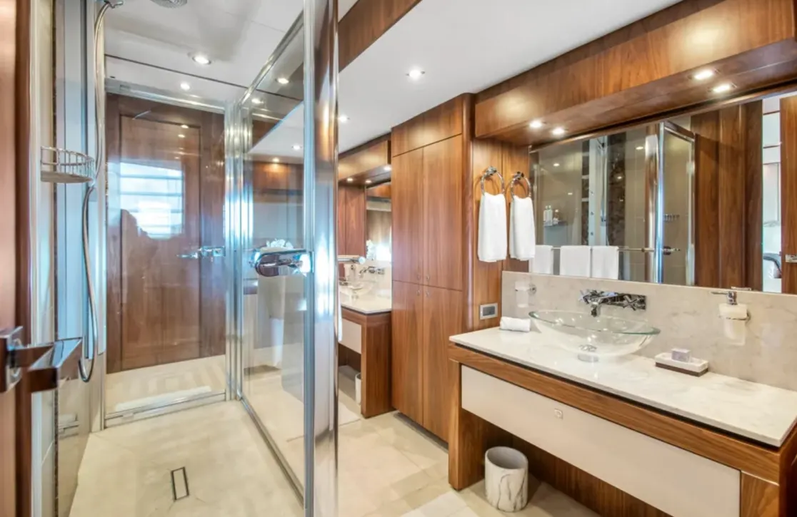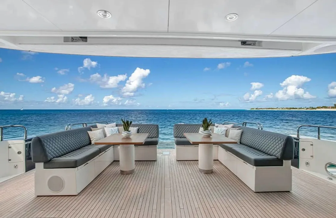 Aboard Ever East, the world-class amenities provide an oasis of comfort and delight. Picture yourself unwinding in the deck jacuzzi, where you can savor a refreshing cocktail while absorbing the stunning vistas. As evening falls, underwater lights cast a mesmerizing glow, enhancing the serene ambiance. The yacht’s foredeck seating with a table and sunpads ensures that every moment on deck is one of leisure. Whether basking in the sun or enjoying al fresco dining at the exterior bar, the spaces aboard offer a seamless blend of relaxation and social interaction. Modern conveniences such as high-speed Wi-Fi and air conditioning ensure your comfort, while the hydraulic swim platform offers effortless access to the sea.