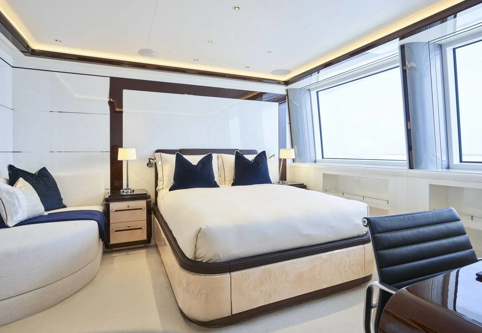 Excellence welcomes up to 12 guests into its haven of serenity, spread across seven beautifully appointed cabins. Each room is a sanctuary of style, where waking up to the gentle lull of the waves is a daily delight. The owner’s suite, a masterpiece of design, offers an extraordinary experience with its private terrace and jacuzzi, framed by floor-to-ceiling glass that opens up to panoramic ocean views. Every cabin is designed with its own unique palette, ensuring a personal and intimate retreat for all aboard.