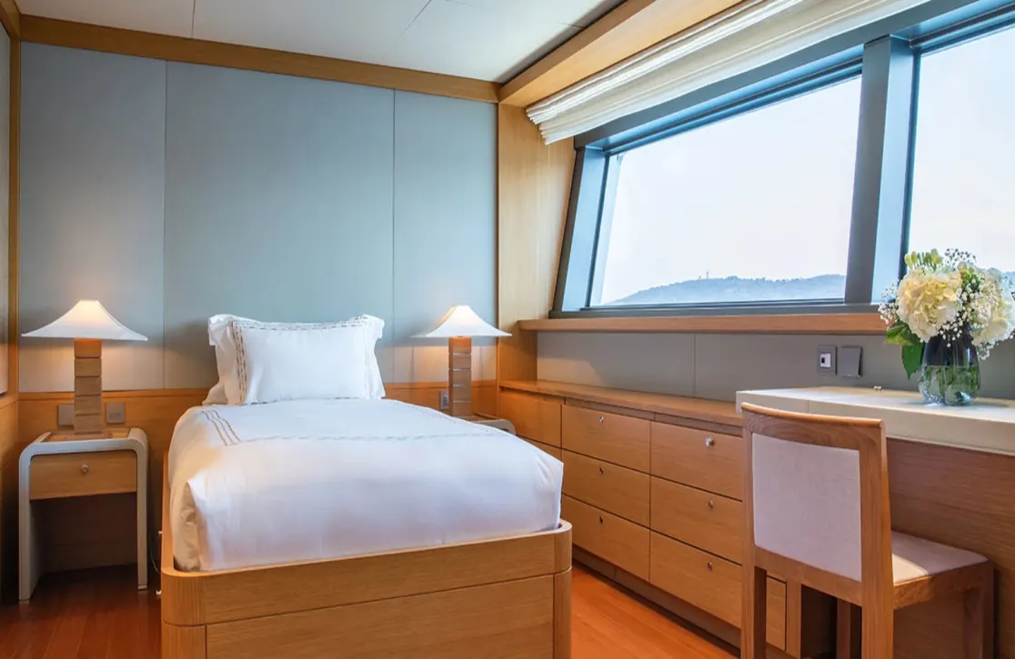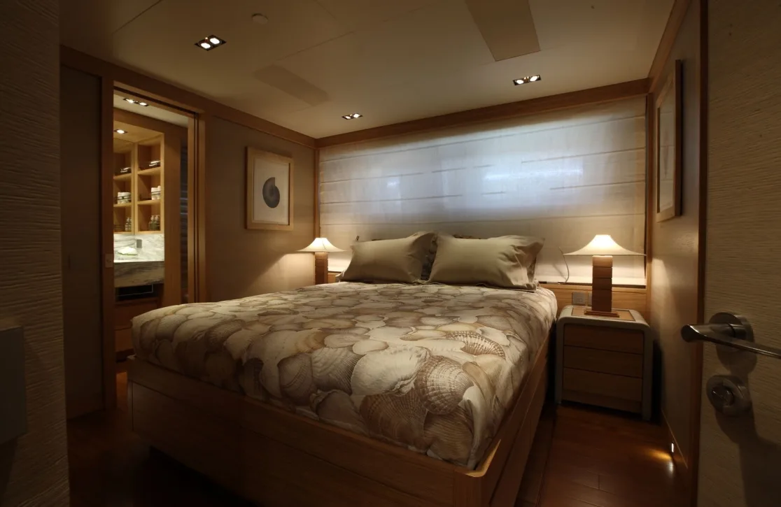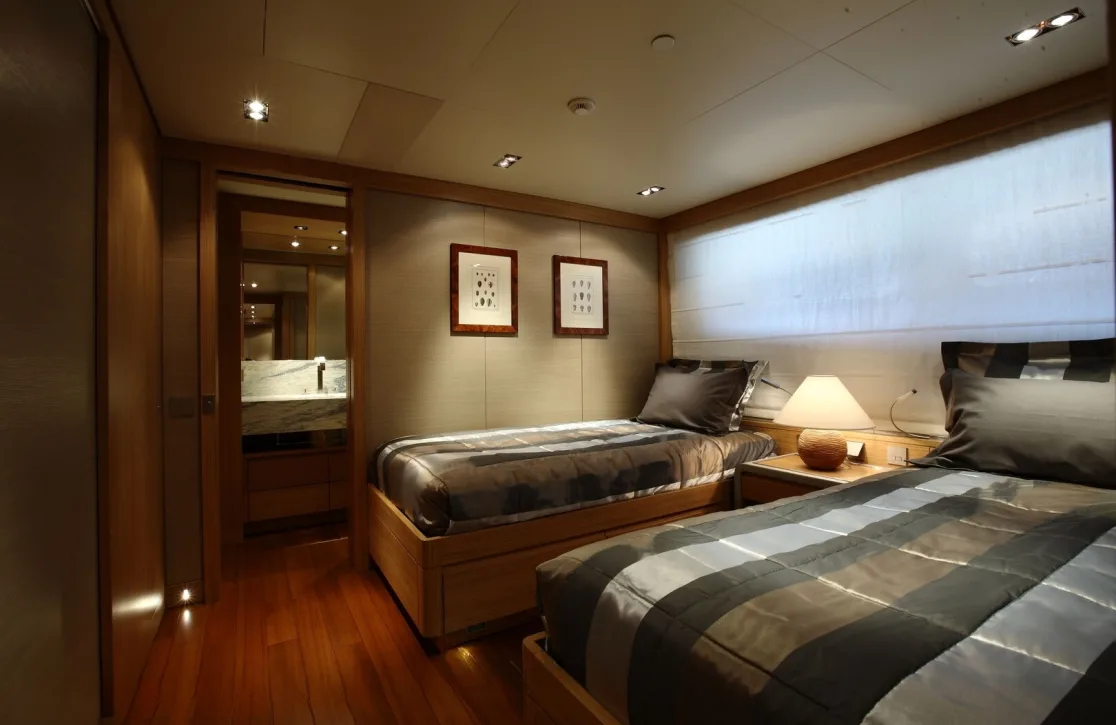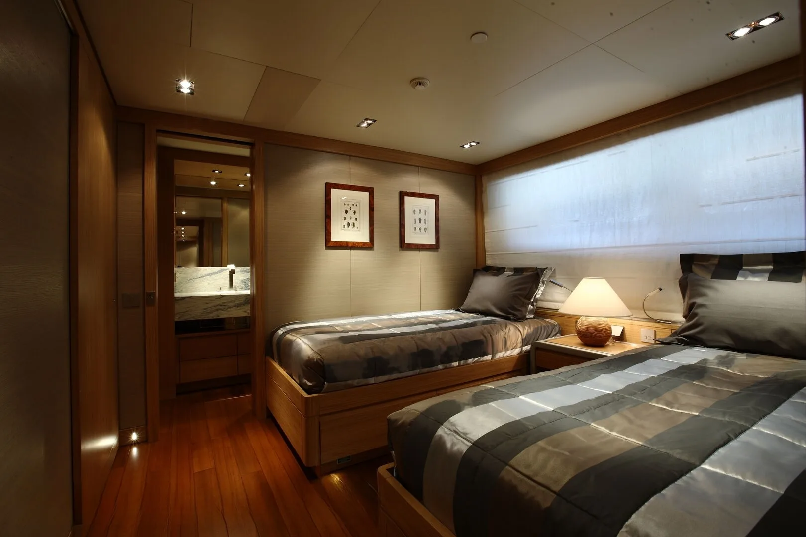 The Falco Moscata accommodates up to 9 guests in five beautifully appointed cabins, offering an intimate retreat after days of exploration. Awaken to the gentle sway of the ocean in the master suite or one of the two VIP cabins, where luxurious furnishings and thoughtful design details create a serene haven. The twin cabin provides a cozy sanctuary, ensuring restful slumber for all aboard. Each cabin is a testament to elegance, where waking up to panoramic ocean views becomes a daily pleasure, and the gentle rhythm of the sea lulls you into restful nights.