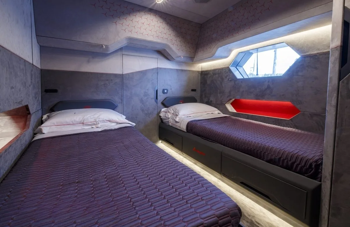Fast One offers an intimate retreat for up to four guests, providing an atmosphere of understated elegance. The primary suite, featuring a king bed, is a haven of comfort, while the twin cabin with its own set of twin beds ensures privacy and relaxation. Waking up to the gentle sway of the ocean and the promise of a day filled with discovery is an experience that transforms every morning into a spectacle of its own.