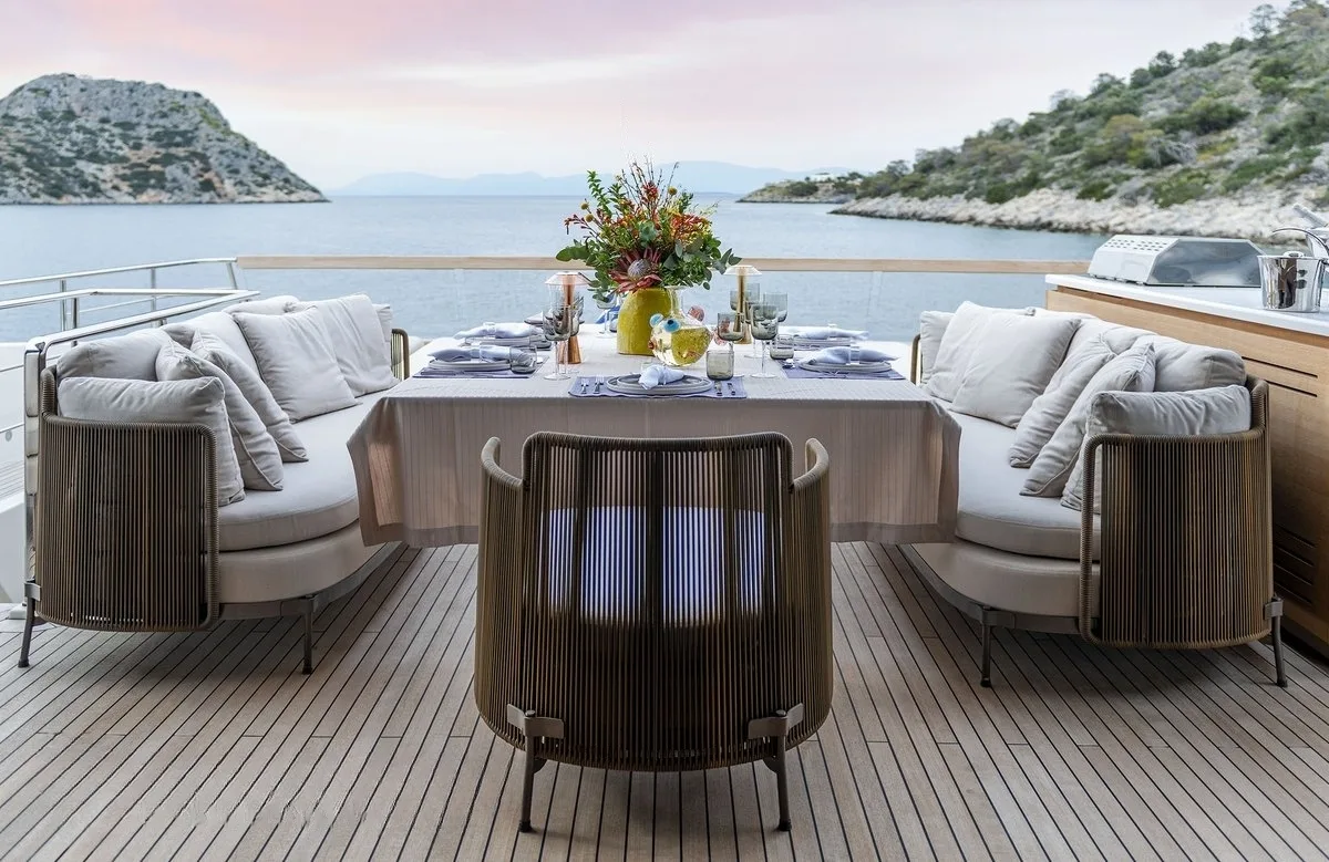 Aboard Fatsa, each moment is designed for your ultimate enjoyment. The sun deck beckons with plush sunpads, perfect for soaking up the sun’s warmth, while an exterior bar provides refreshing beverages crafted to your liking. Transition seamlessly from the azure waters to the yacht’s inviting spaces via the swimming platform, and refresh under the outdoor shower. As the day cools, gather on the foredeck seating with a table, where evenings transform into cherished memories under the stars, seamlessly blending the day’s adventures with the night’s tranquility.