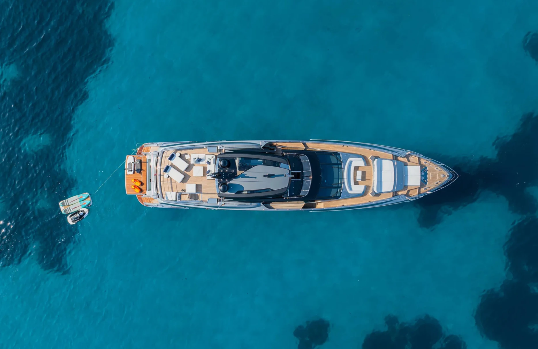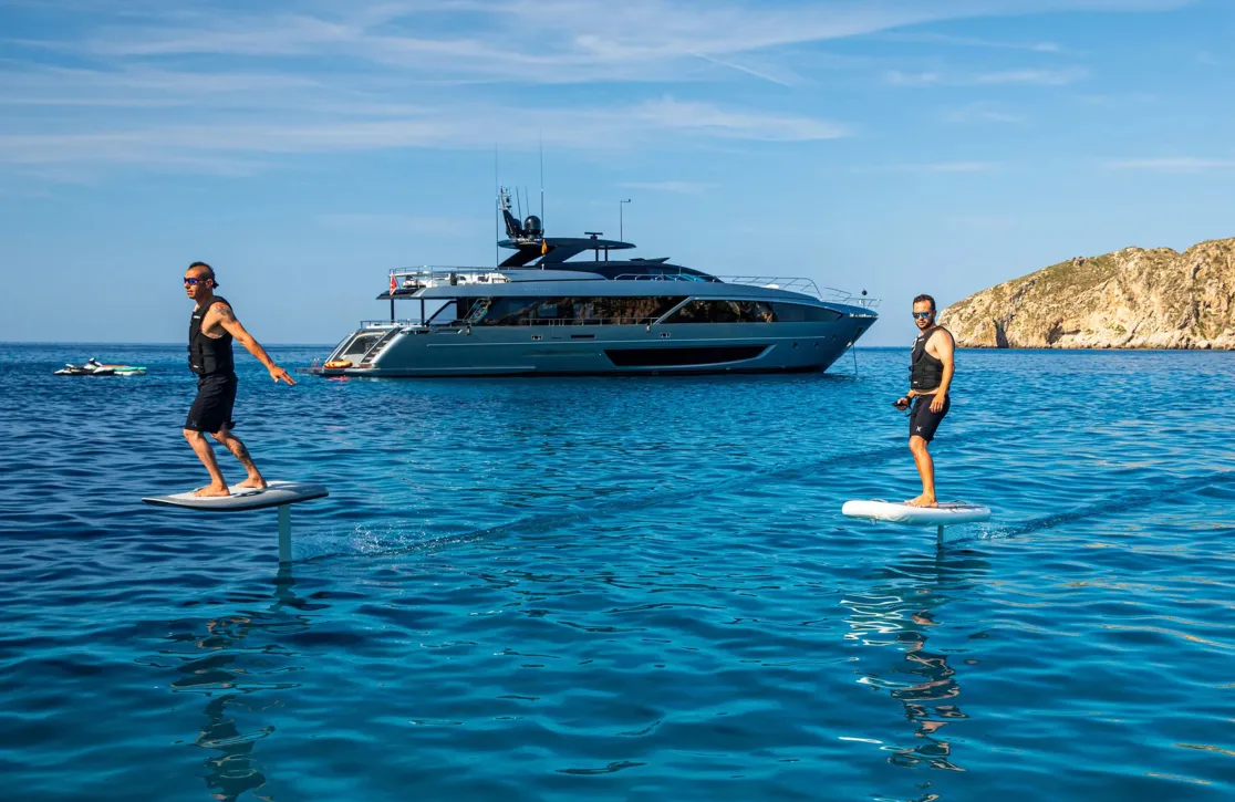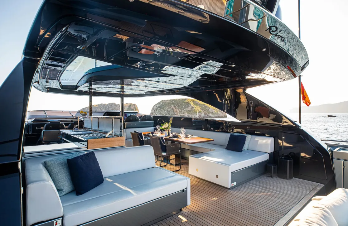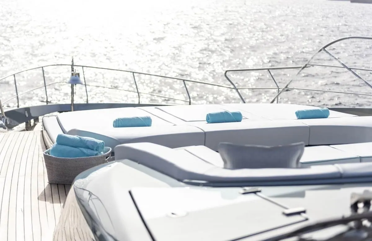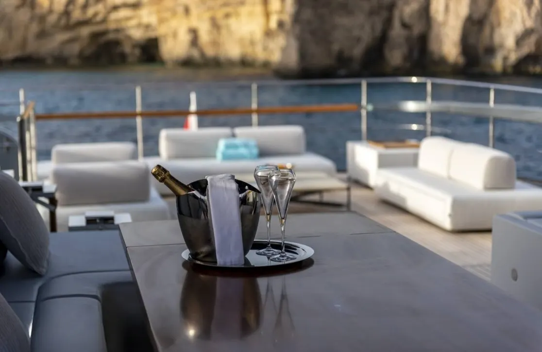 Life aboard Figurati is a symphony of relaxation and social delight. Begin your day with a refreshing dip in the deck jacuzzi, or unwind with a good book in one of the elegant lounges. As the sun sets, the exterior bar becomes the perfect spot for an evening cocktail, while the yacht’s ambient underwater lights create a mesmerizing aura. Stay connected with high-speed Wi-Fi, and enjoy the perfect climate indoors with cutting-edge air conditioning, each element designed to enhance your comfort and enjoyment.