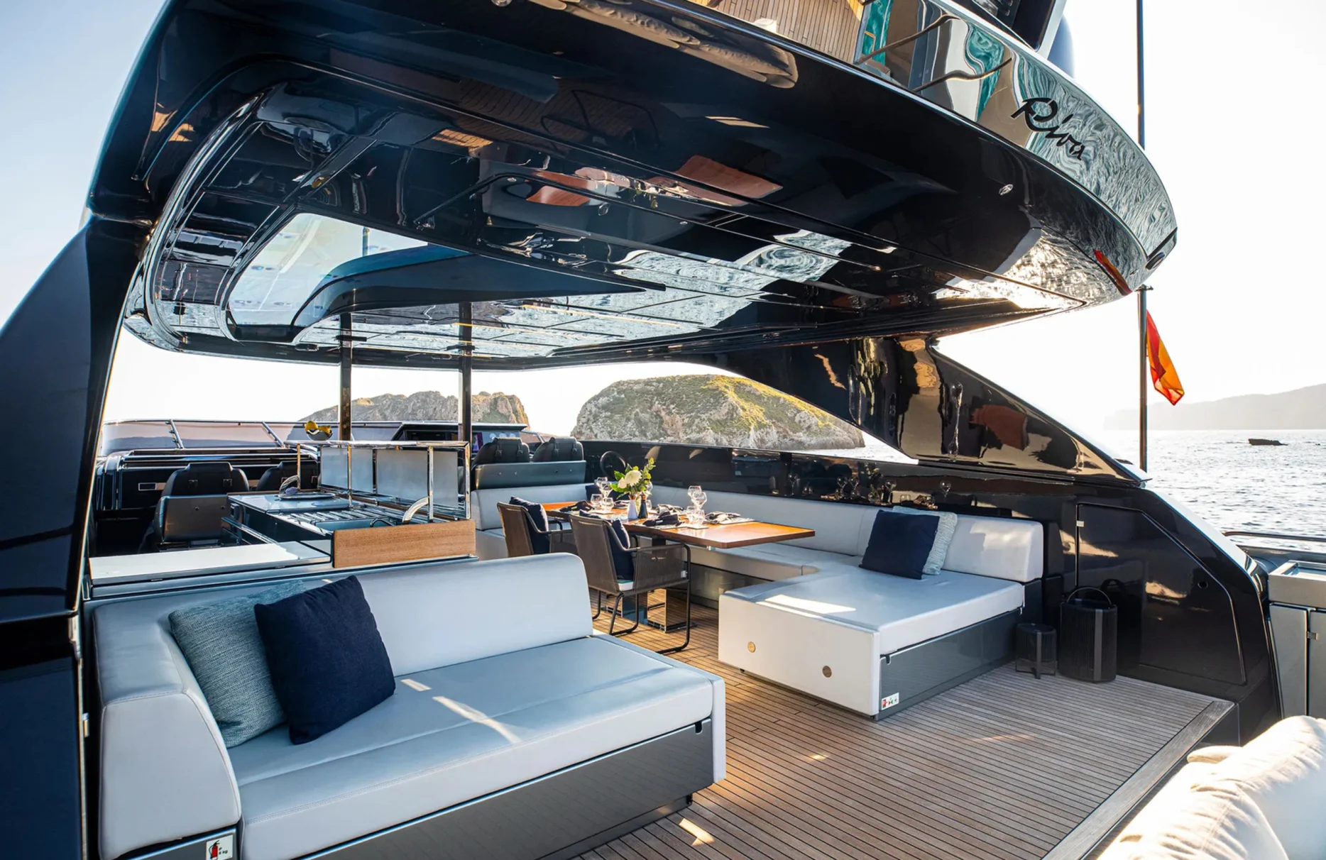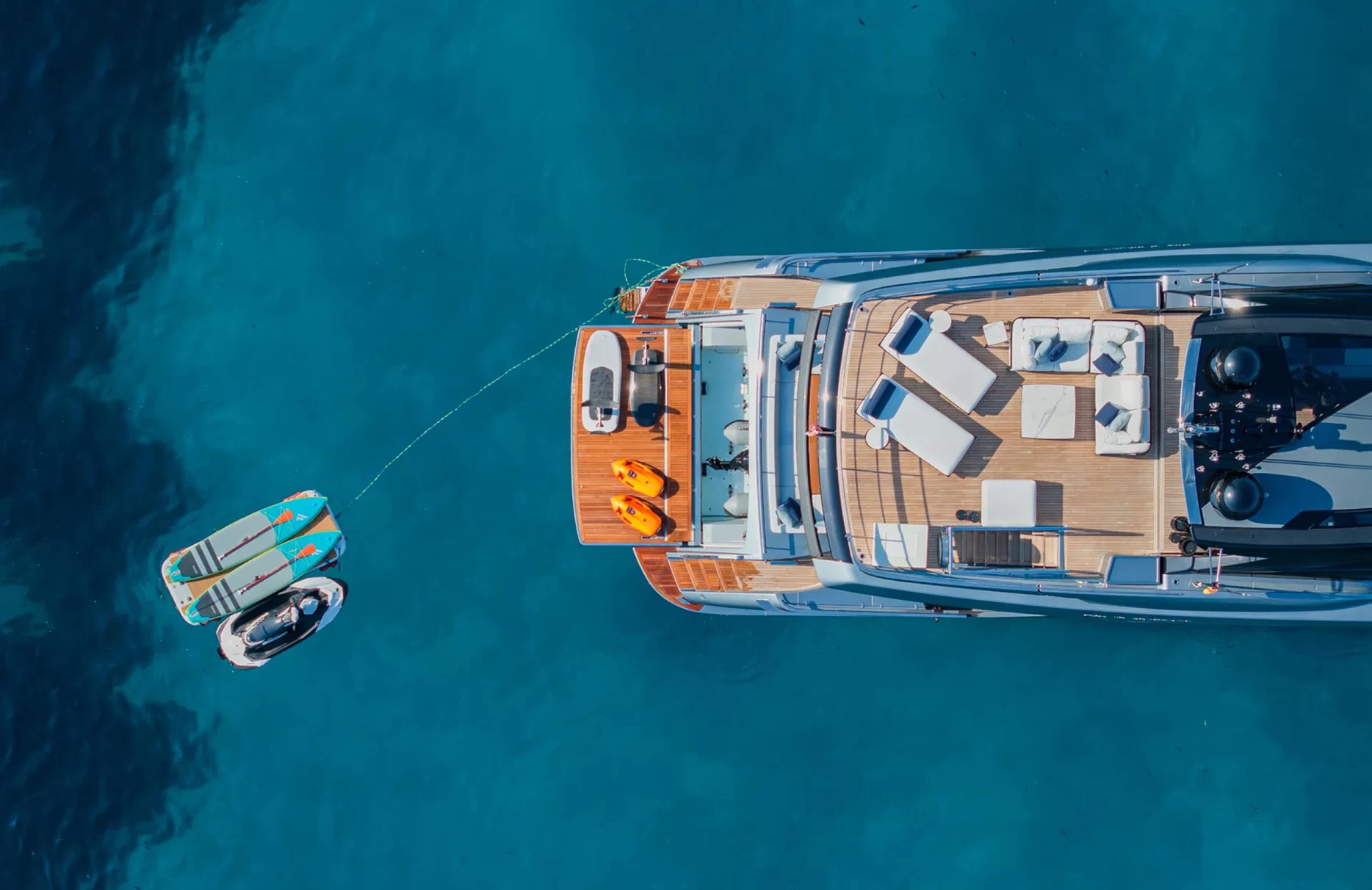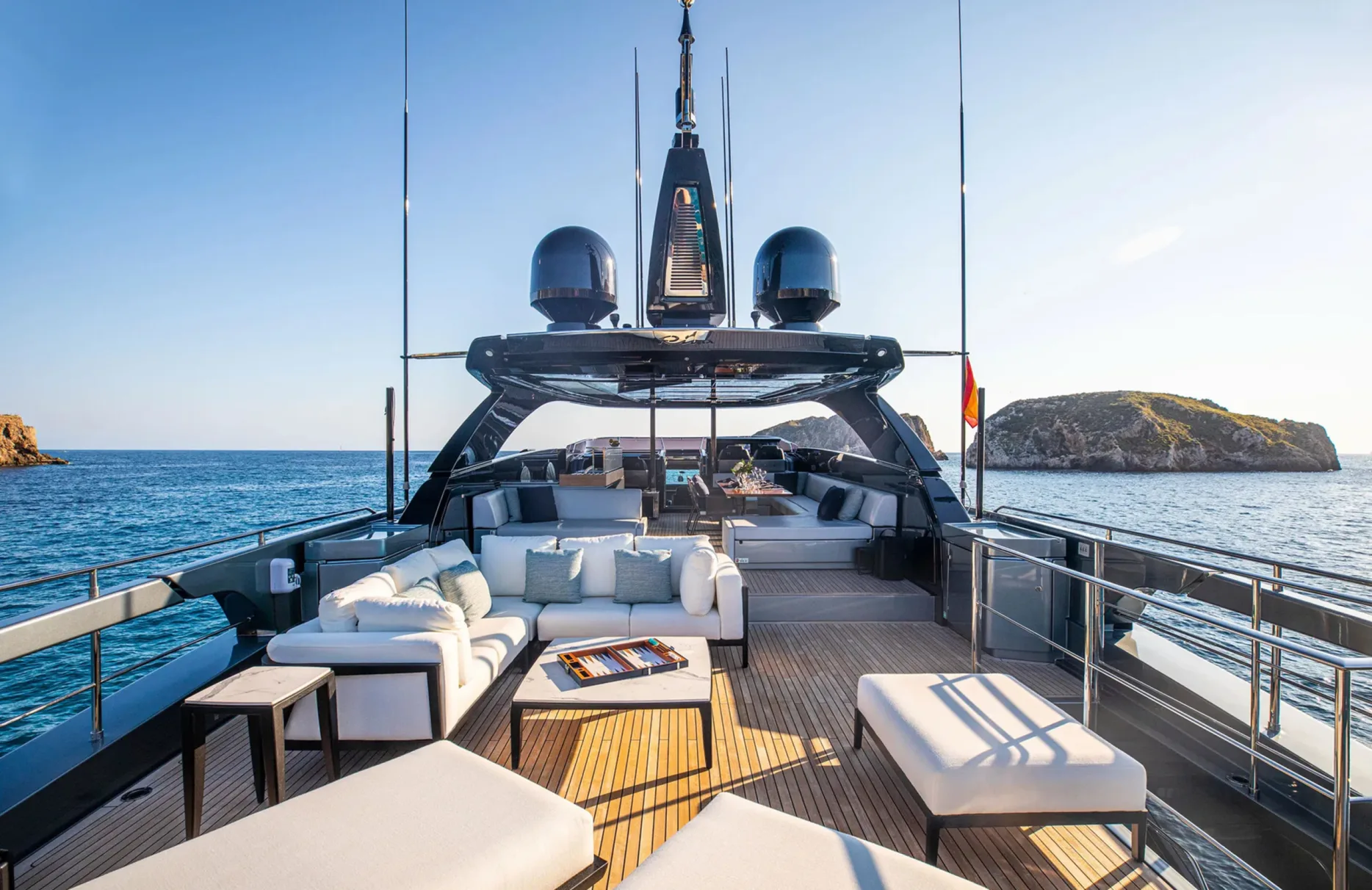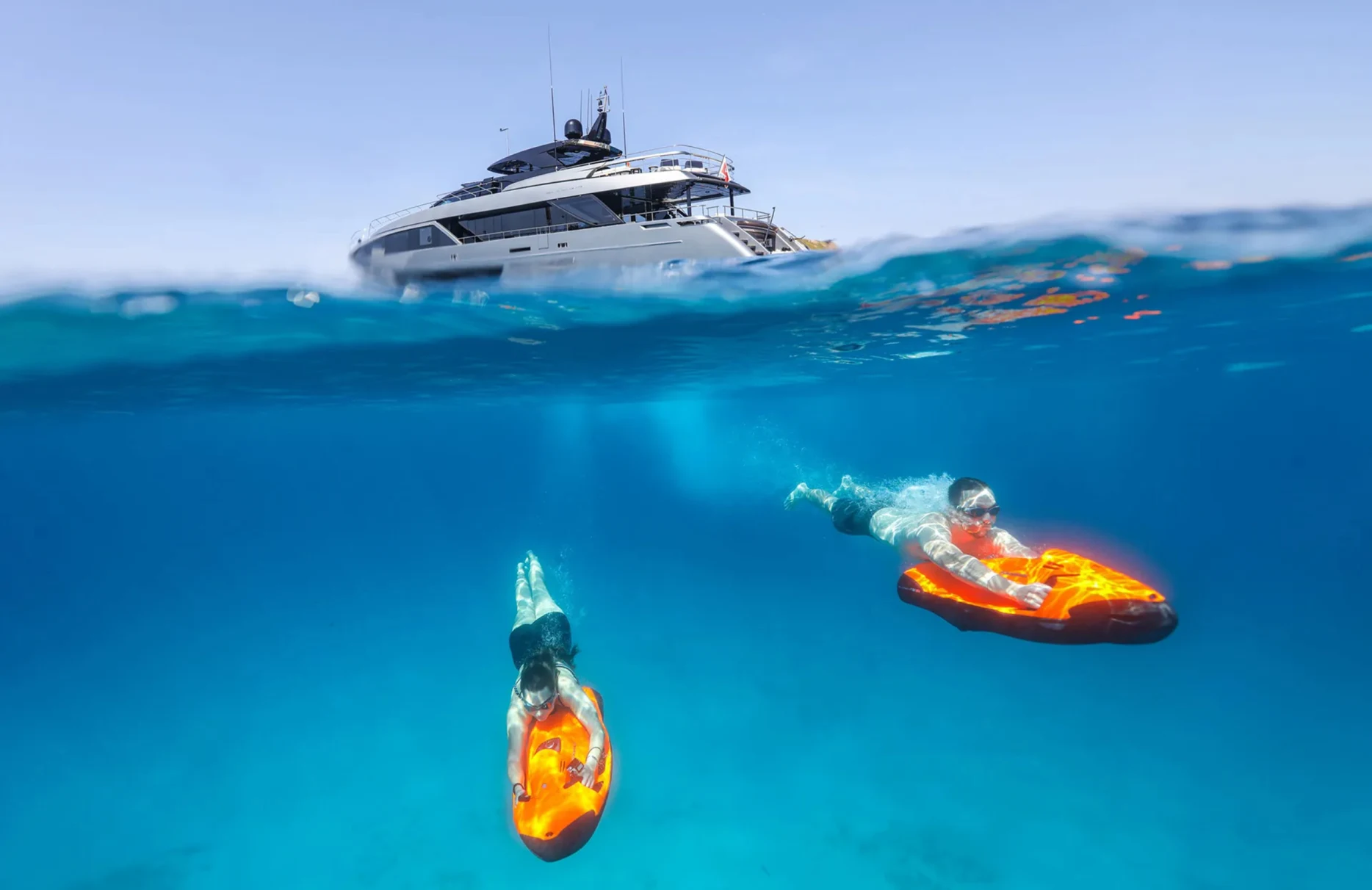 Life aboard Figurati is a symphony of relaxation and social delight. Begin your day with a refreshing dip in the deck jacuzzi, or unwind with a good book in one of the elegant lounges. As the sun sets, the exterior bar becomes the perfect spot for an evening cocktail, while the yacht’s ambient underwater lights create a mesmerizing aura. Stay connected with high-speed Wi-Fi, and enjoy the perfect climate indoors with cutting-edge air conditioning, each element designed to enhance your comfort and enjoyment.