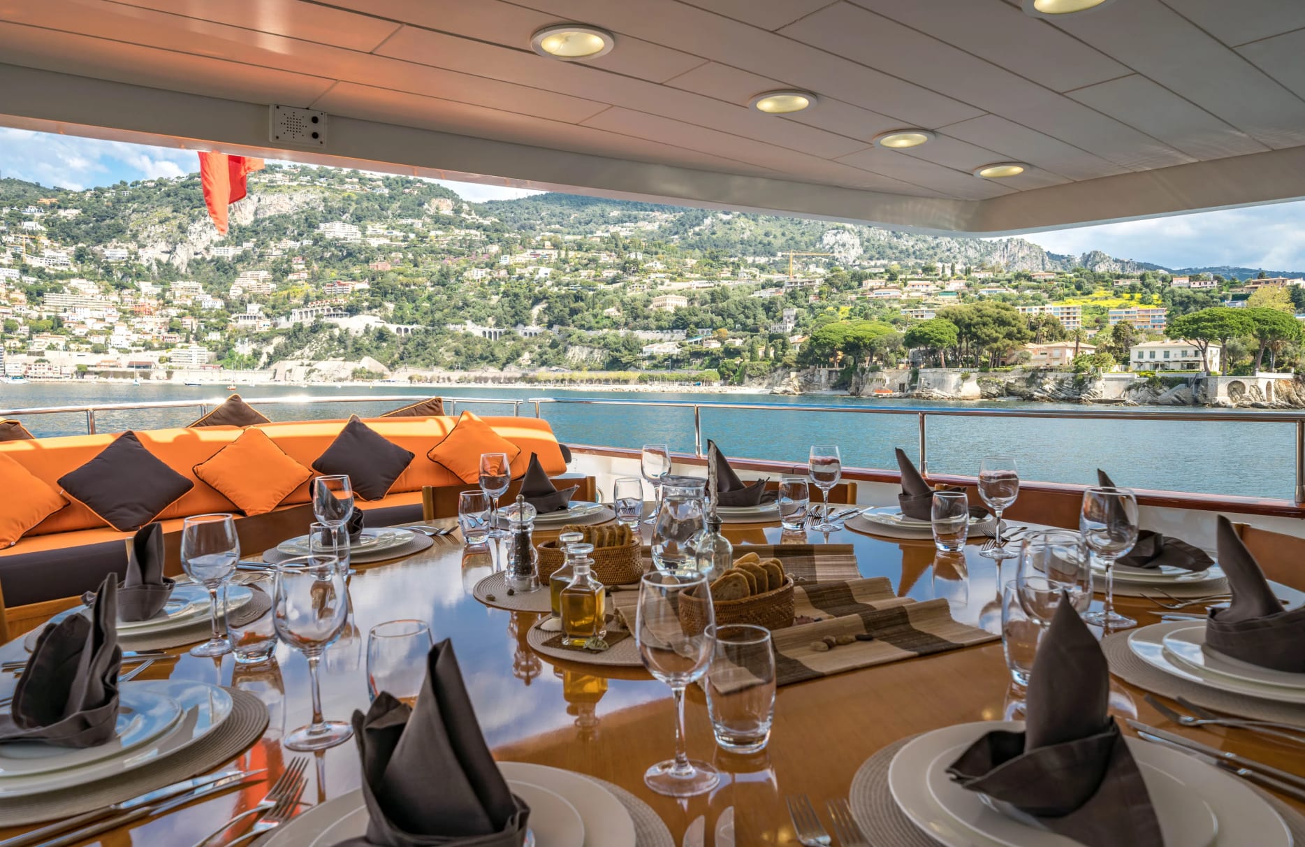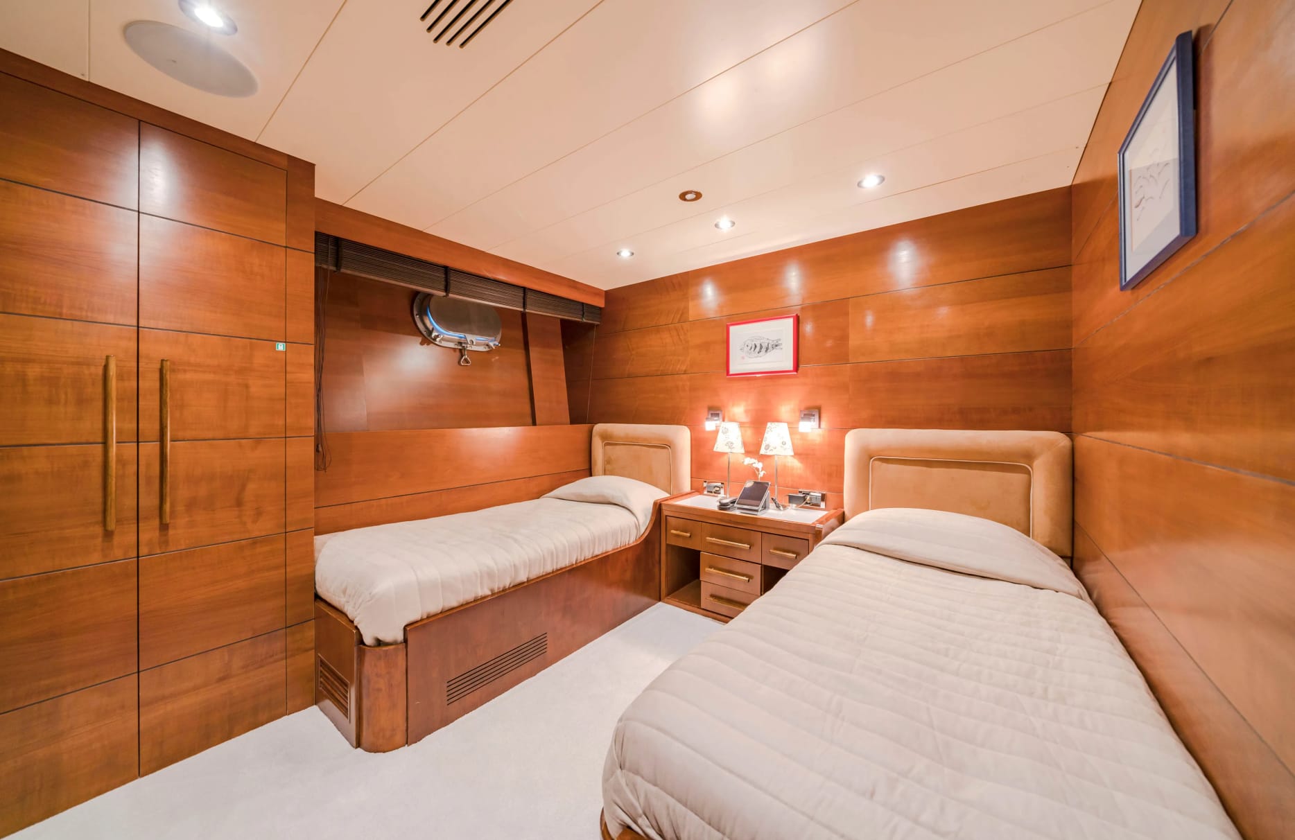 Accommodations aboard Fiorente offer a harmonious blend of sophistication and relaxation. Up to 10 guests are welcomed into five meticulously designed cabins, including a master suite, two double cabins, and two twin cabins, each promising a restful night’s sleep. Waking up to the gentle sway of the sea, guests are greeted by the morning sun filtering through elegant windows, setting the tone for another day of discovery and delight. The thoughtful design and inviting atmosphere create a personal retreat, ensuring every moment spent in your private quarters is as memorable as the views beyond.