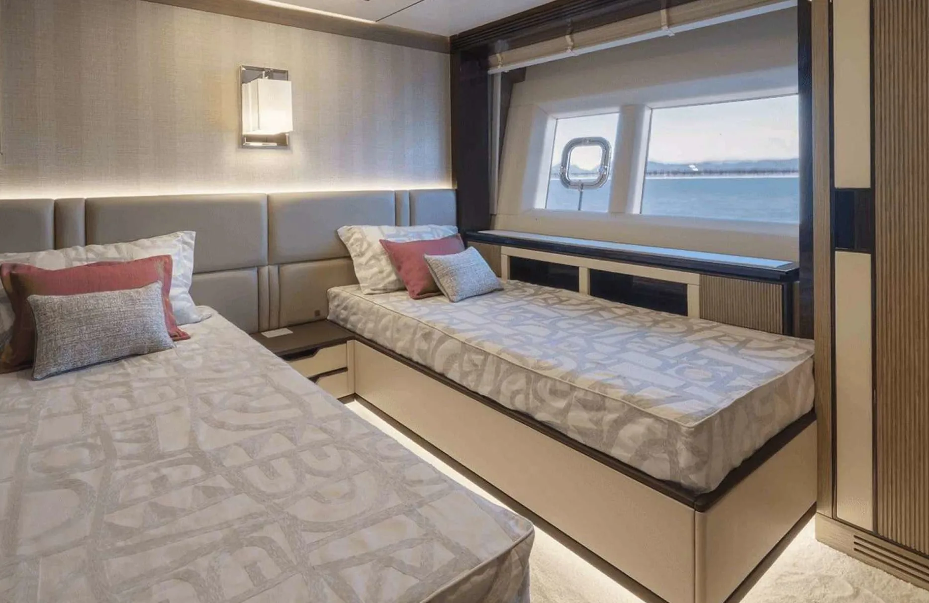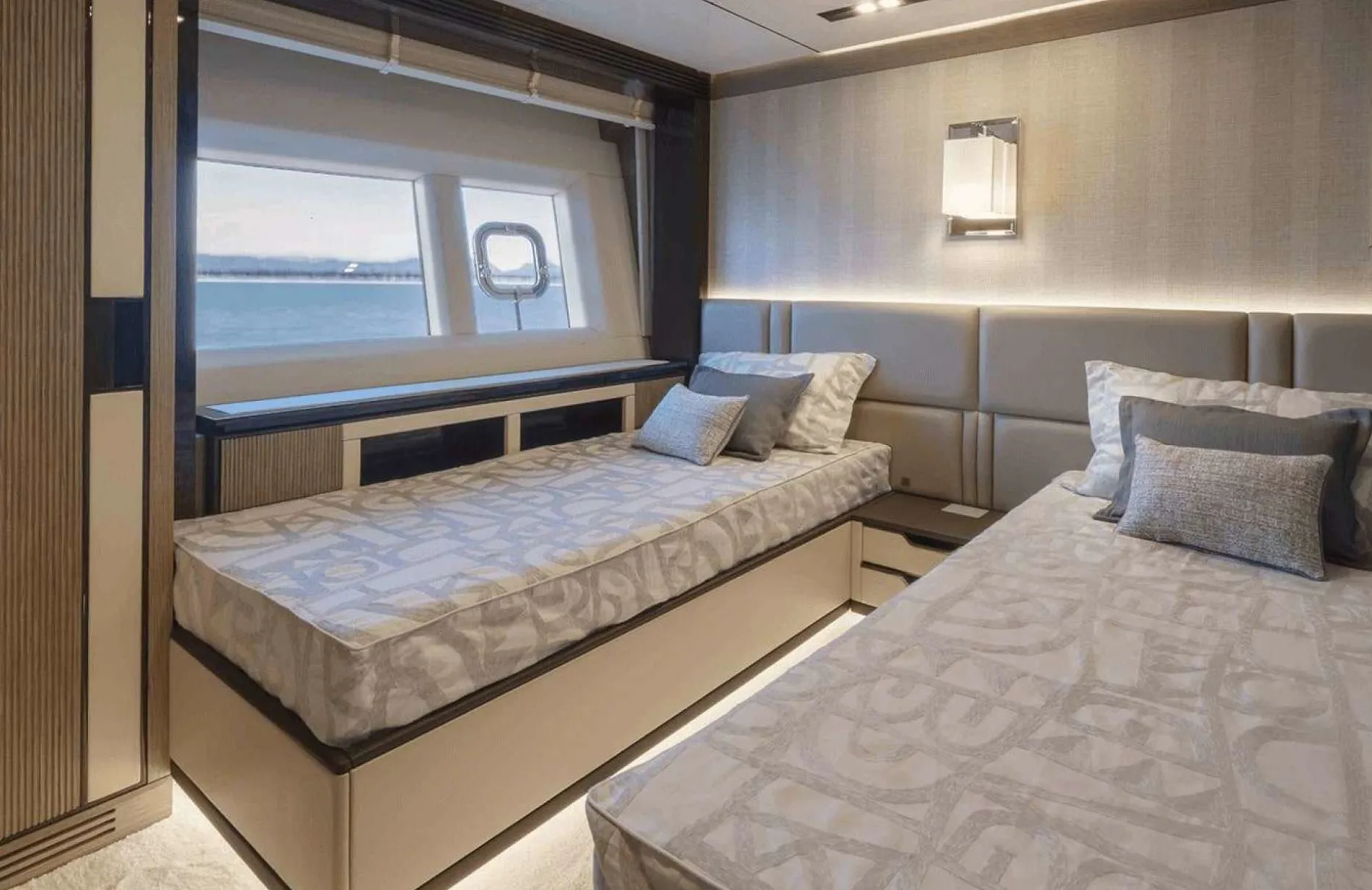 Accommodating up to ten guests, ‘Four Joys’ offers a sanctuary of comfort across its five exquisitely appointed cabins. Each morning, awaken to the gentle lapping of the waves in a master suite that boasts a blend of elegance and modernity. The VIP and additional double and twin cabins provide ample space for relaxation, ensuring that each guest feels enveloped in warmth and sophistication. The attentive six-member crew is ever-present, ensuring that your stay is marked by seamless service and unparalleled attention to detail.