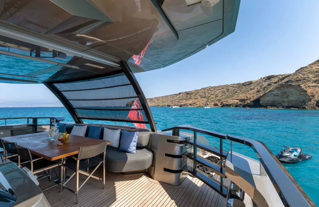 On Fusion, each day unfolds with new possibilities for relaxation and enjoyment. Begin your mornings on the sun-drenched decks, where sunpads invite you to bask in the warmth of the day. As the afternoon sun reaches its peak, retreat to the refreshing embrace of the deck jacuzzi, where the soothing bubbles and breathtaking views create an oasis of tranquility. Evenings are a time for social gatherings in the tastefully appointed indoor spaces, where the ambiance is both inviting and sophisticated. Stay connected with seamless Wi-Fi access, or disconnect entirely, as the stabilizers ensure smooth sailing whether you’re at anchor or underway. The climate-controlled interiors provide an ideal retreat after a day of sun and sea.
