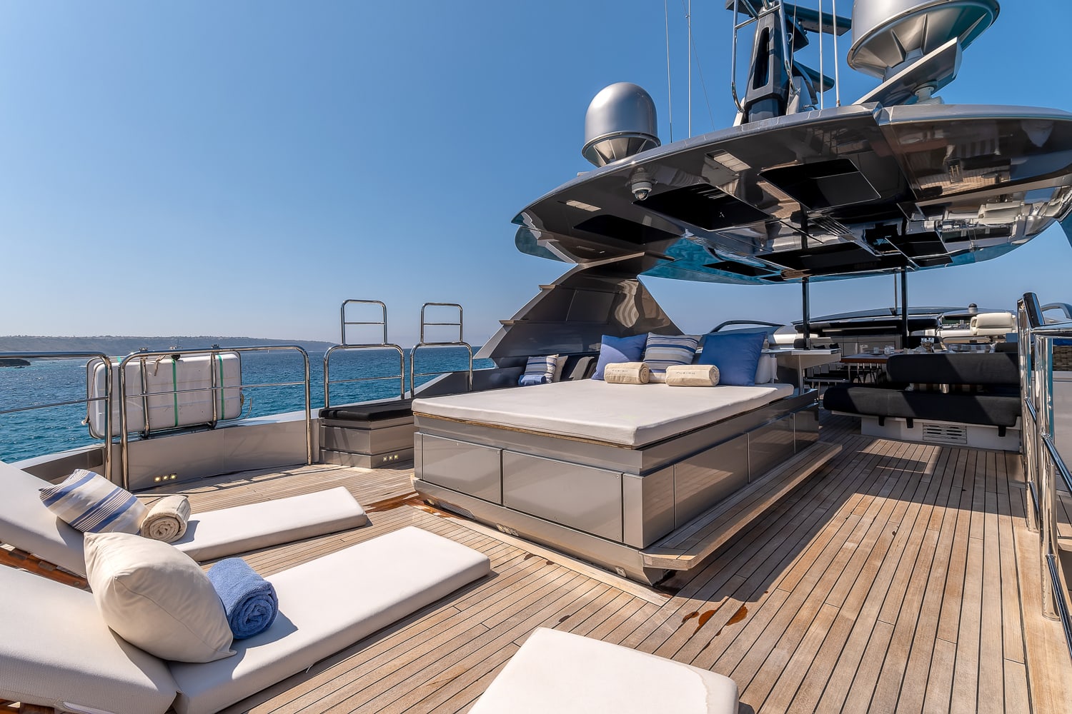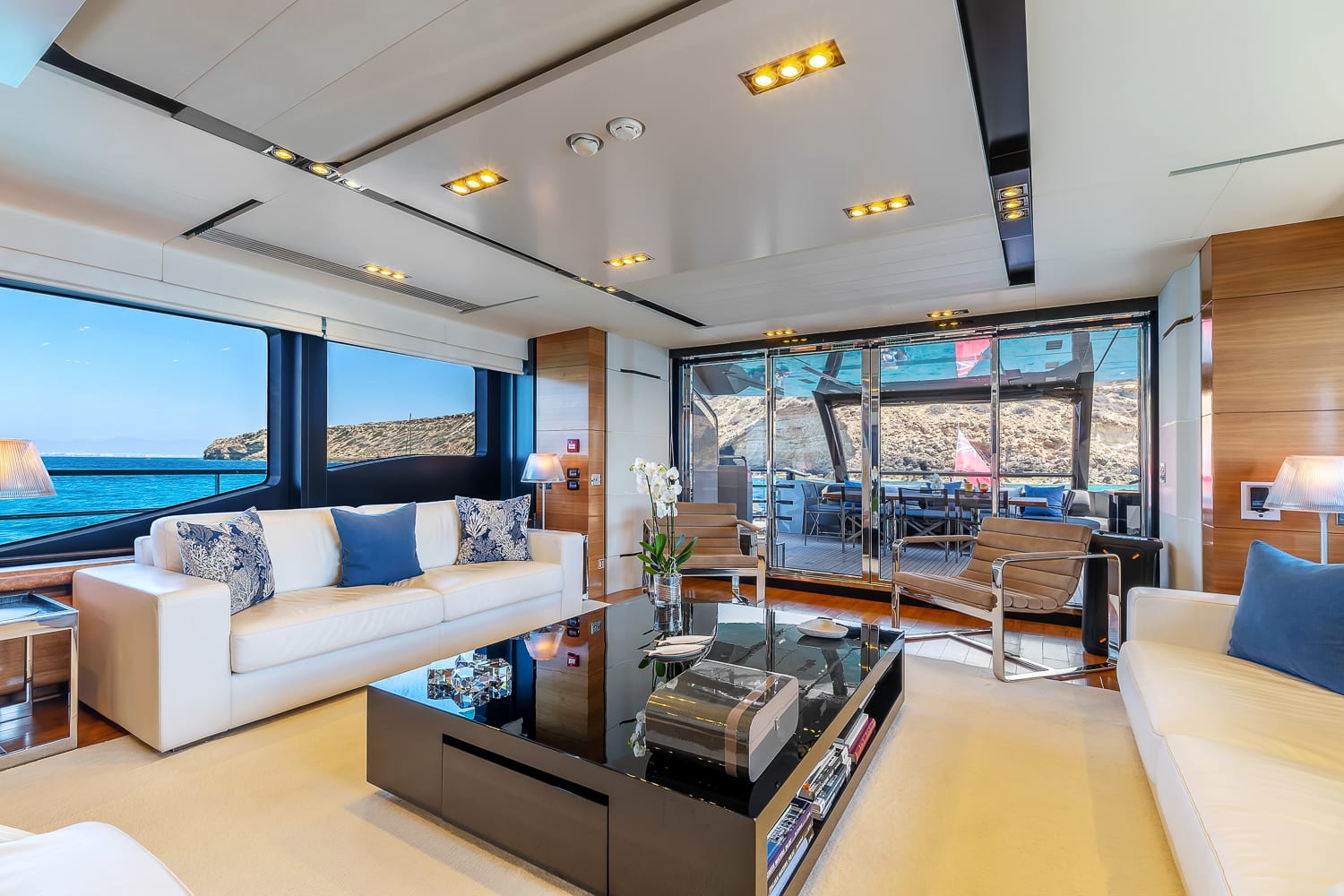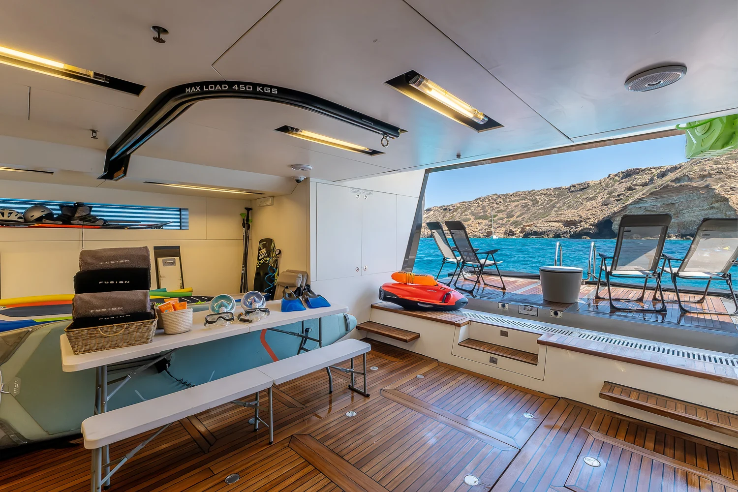 On Fusion, each day unfolds with new possibilities for relaxation and enjoyment. Begin your mornings on the sun-drenched decks, where sunpads invite you to bask in the warmth of the day. As the afternoon sun reaches its peak, retreat to the refreshing embrace of the deck jacuzzi, where the soothing bubbles and breathtaking views create an oasis of tranquility. Evenings are a time for social gatherings in the tastefully appointed indoor spaces, where the ambiance is both inviting and sophisticated. Stay connected with seamless Wi-Fi access, or disconnect entirely, as the stabilizers ensure smooth sailing whether you’re at anchor or underway. The climate-controlled interiors provide an ideal retreat after a day of sun and sea.