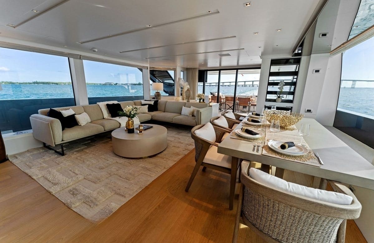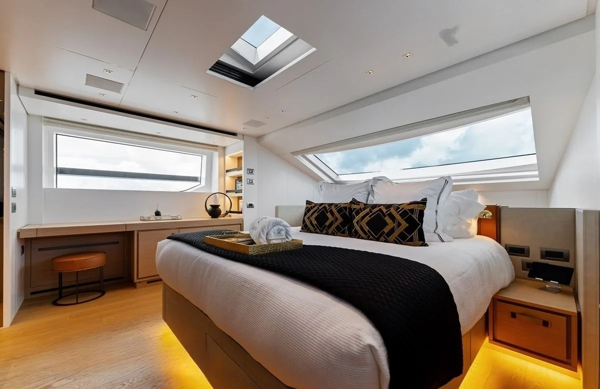 Gatsby invites up to eight guests to enjoy her thoughtfully designed accommodations, promising restful nights and indulgent mornings. The master suite serves as a personal retreat, while three additional cabins, including doubles and twins, offer comfort and privacy for every guest. Each cabin is a testament to Filippetti’s dedication to detail, where waking up to the gentle sway of the ocean is a serene experience, and retiring each night feels like a privilege.