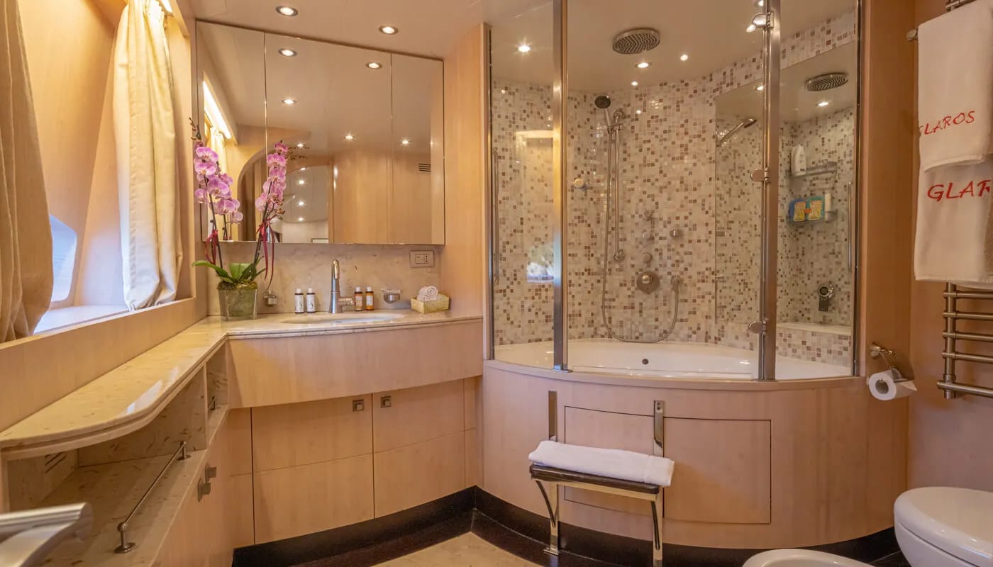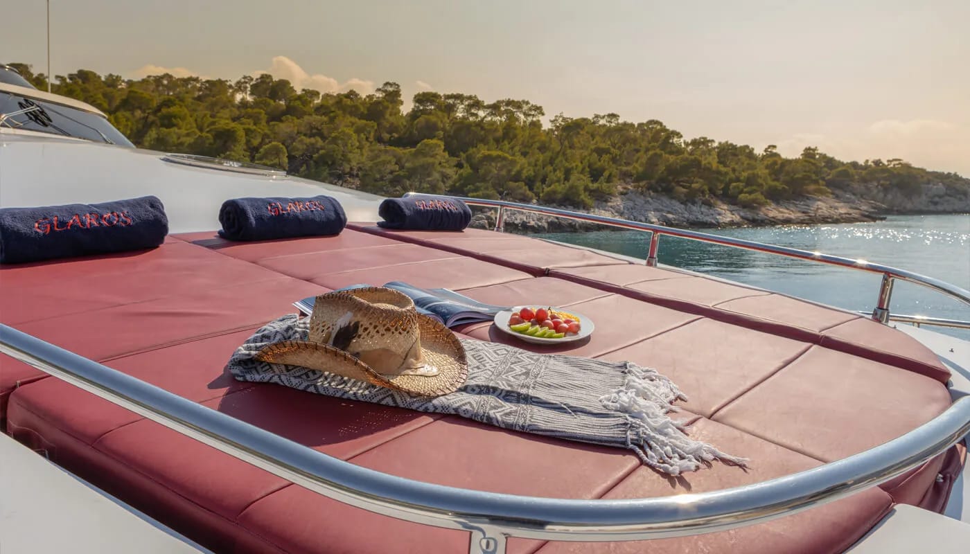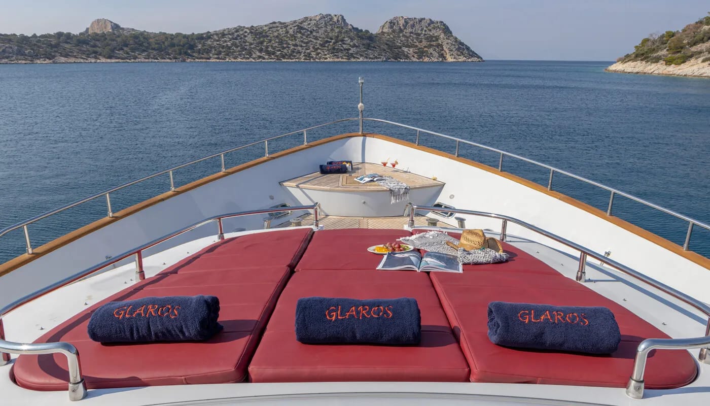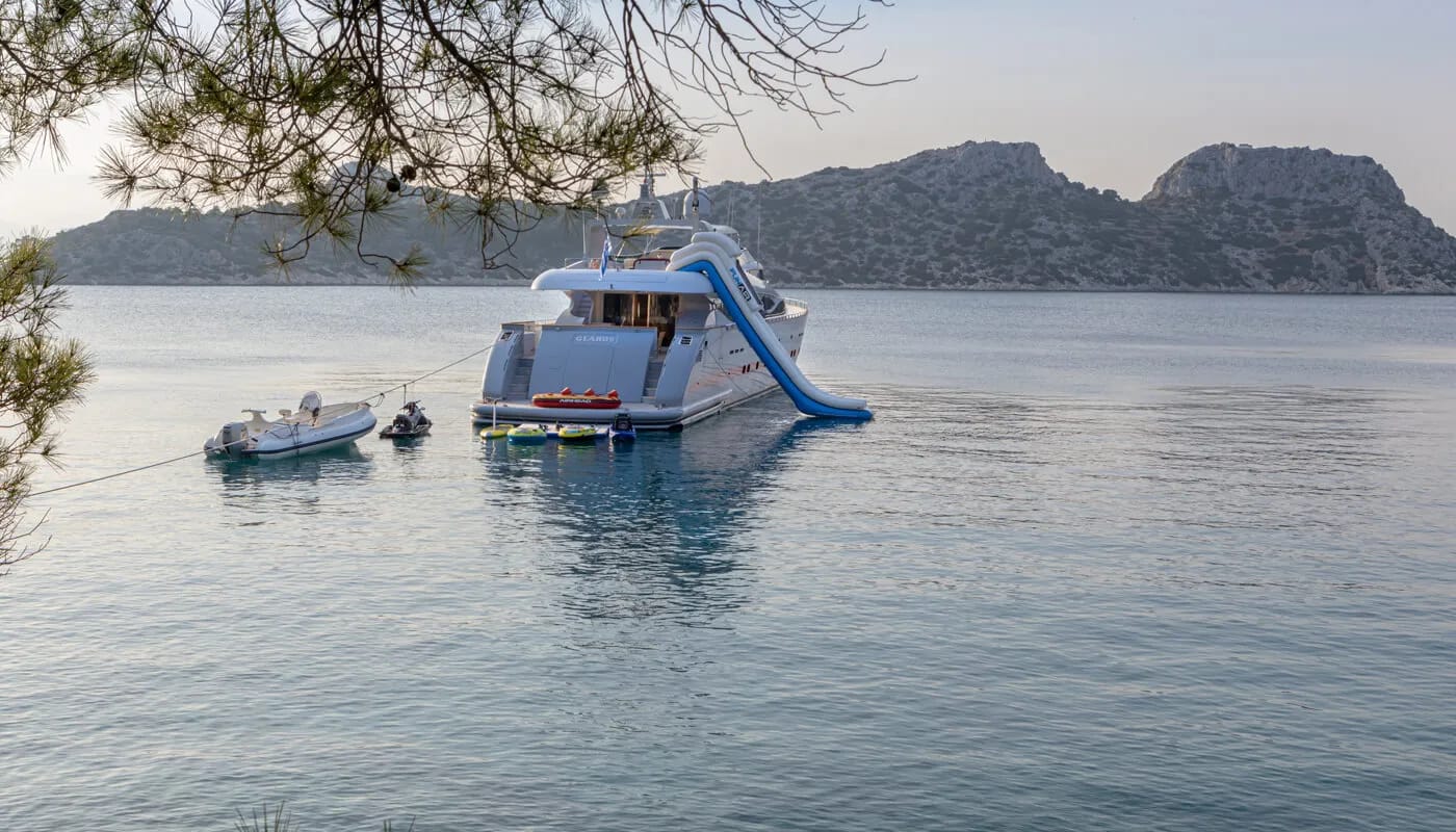 Onboard Glaros, every detail is crafted for comfort and delight. The gentle hum of the air conditioning ensures a perfect climate, allowing you to unwind with a book or share stories in the elegant salon. Wi-Fi keeps you connected, whether you’re conducting business or sharing your voyage with loved ones. As the sun sets, the deck transforms into a haven of relaxation and entertainment, with an inflatable water slide offering playful adventures for all ages.