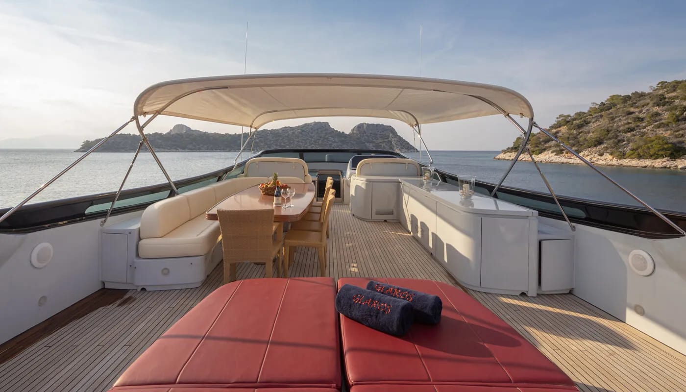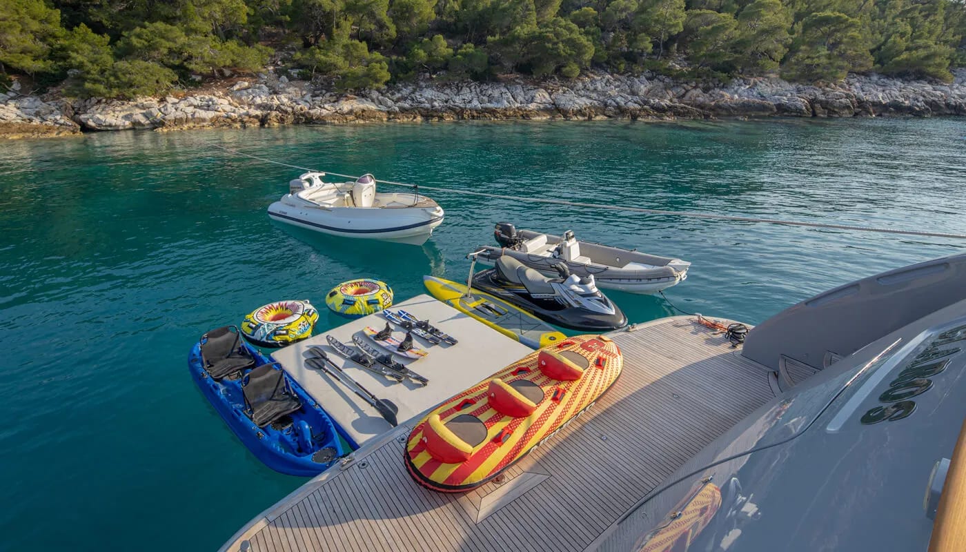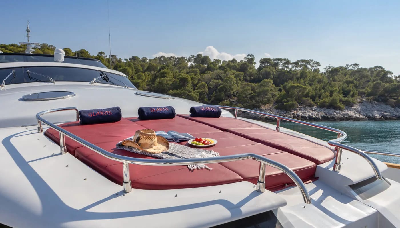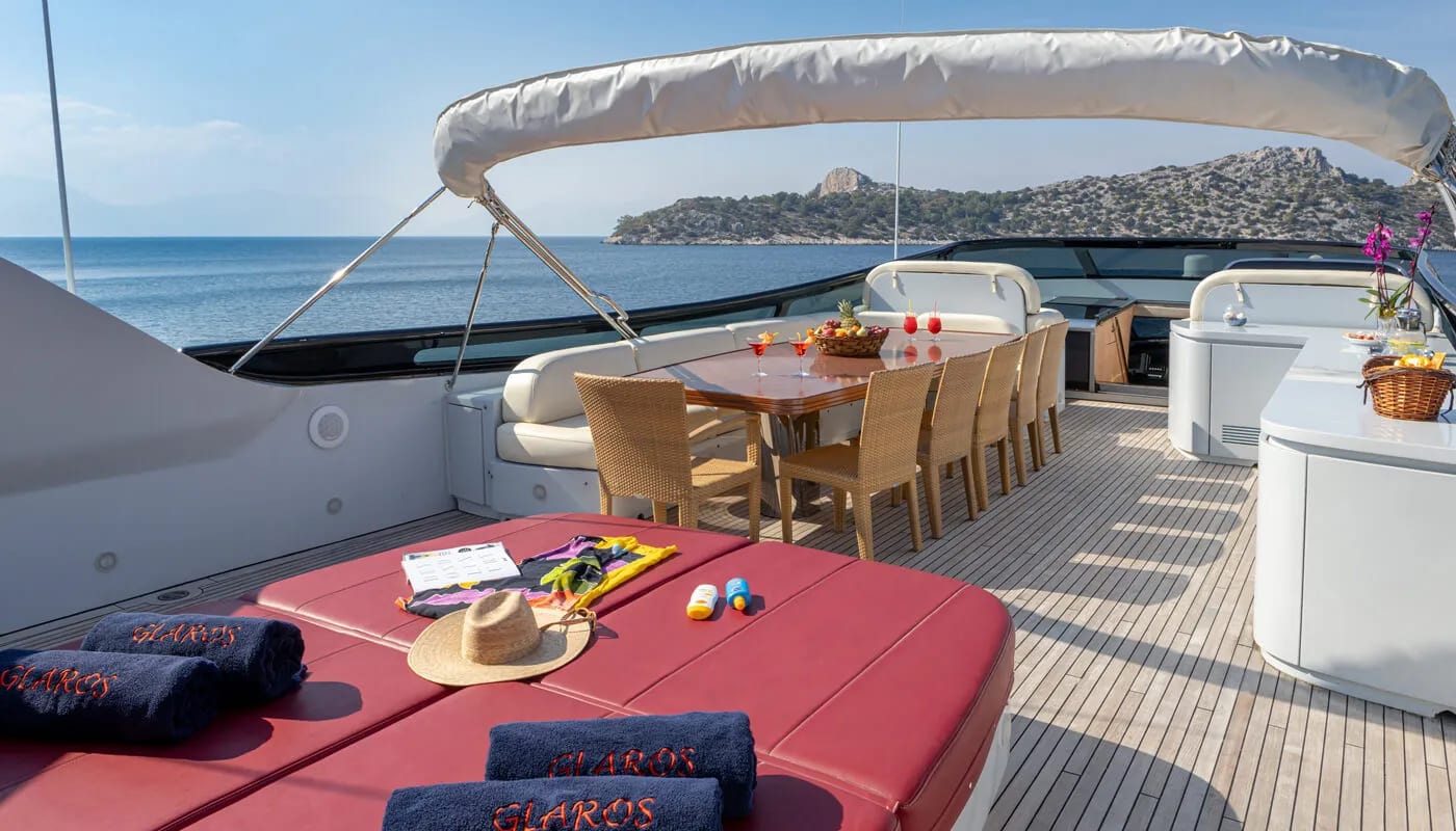 Onboard Glaros, every detail is crafted for comfort and delight. The gentle hum of the air conditioning ensures a perfect climate, allowing you to unwind with a book or share stories in the elegant salon. Wi-Fi keeps you connected, whether you’re conducting business or sharing your voyage with loved ones. As the sun sets, the deck transforms into a haven of relaxation and entertainment, with an inflatable water slide offering playful adventures for all ages.