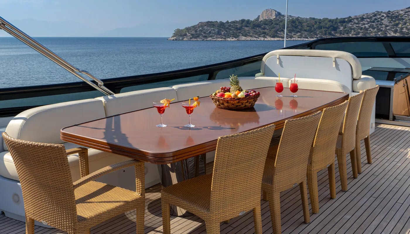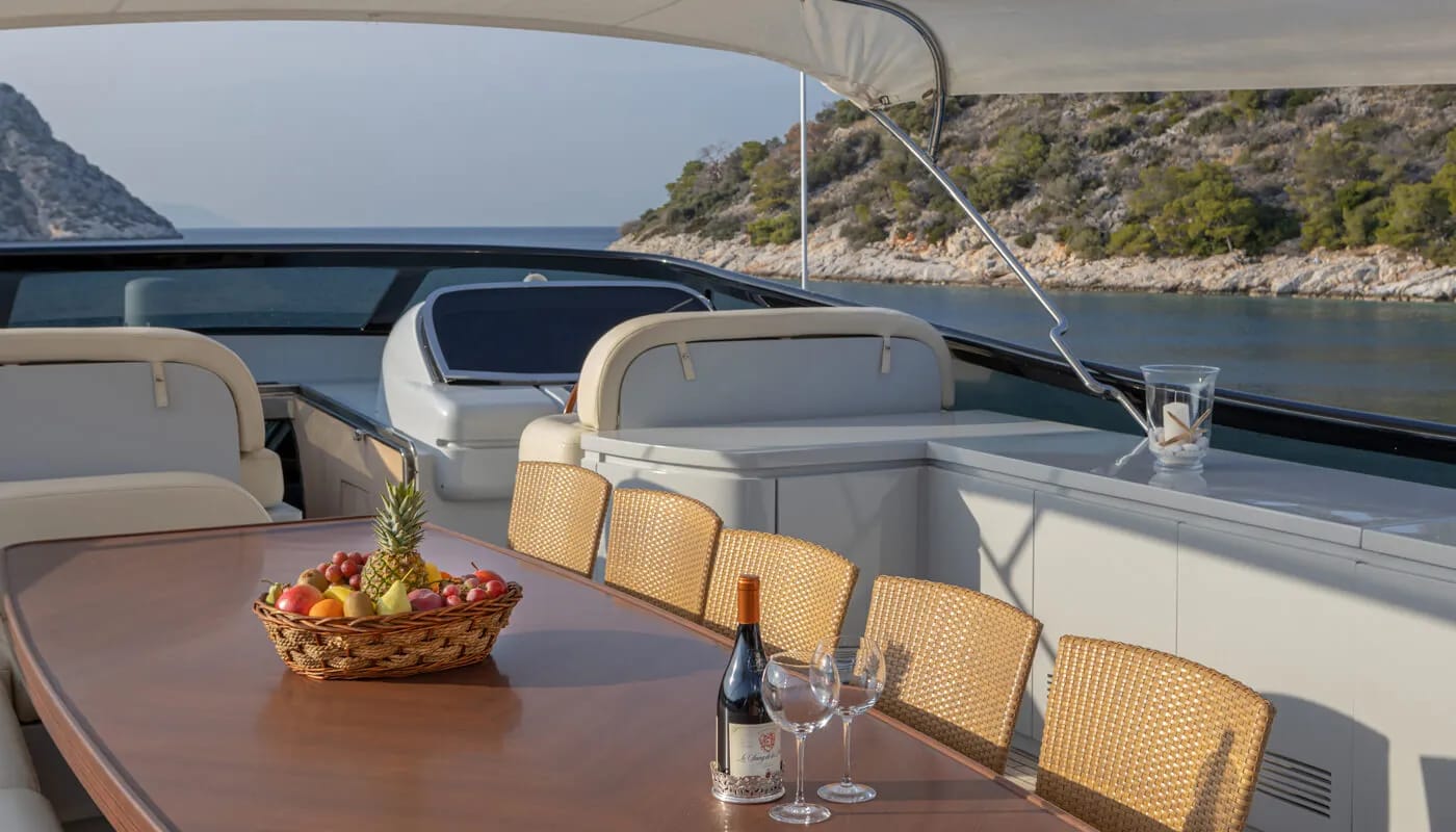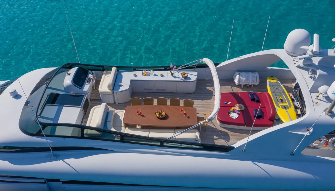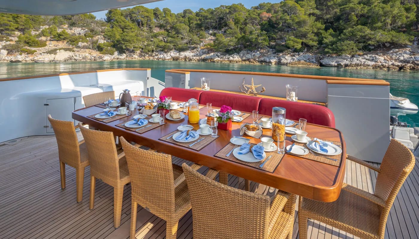 Onboard Glaros, every detail is crafted for comfort and delight. The gentle hum of the air conditioning ensures a perfect climate, allowing you to unwind with a book or share stories in the elegant salon. Wi-Fi keeps you connected, whether you’re conducting business or sharing your voyage with loved ones. As the sun sets, the deck transforms into a haven of relaxation and entertainment, with an inflatable water slide offering playful adventures for all ages.