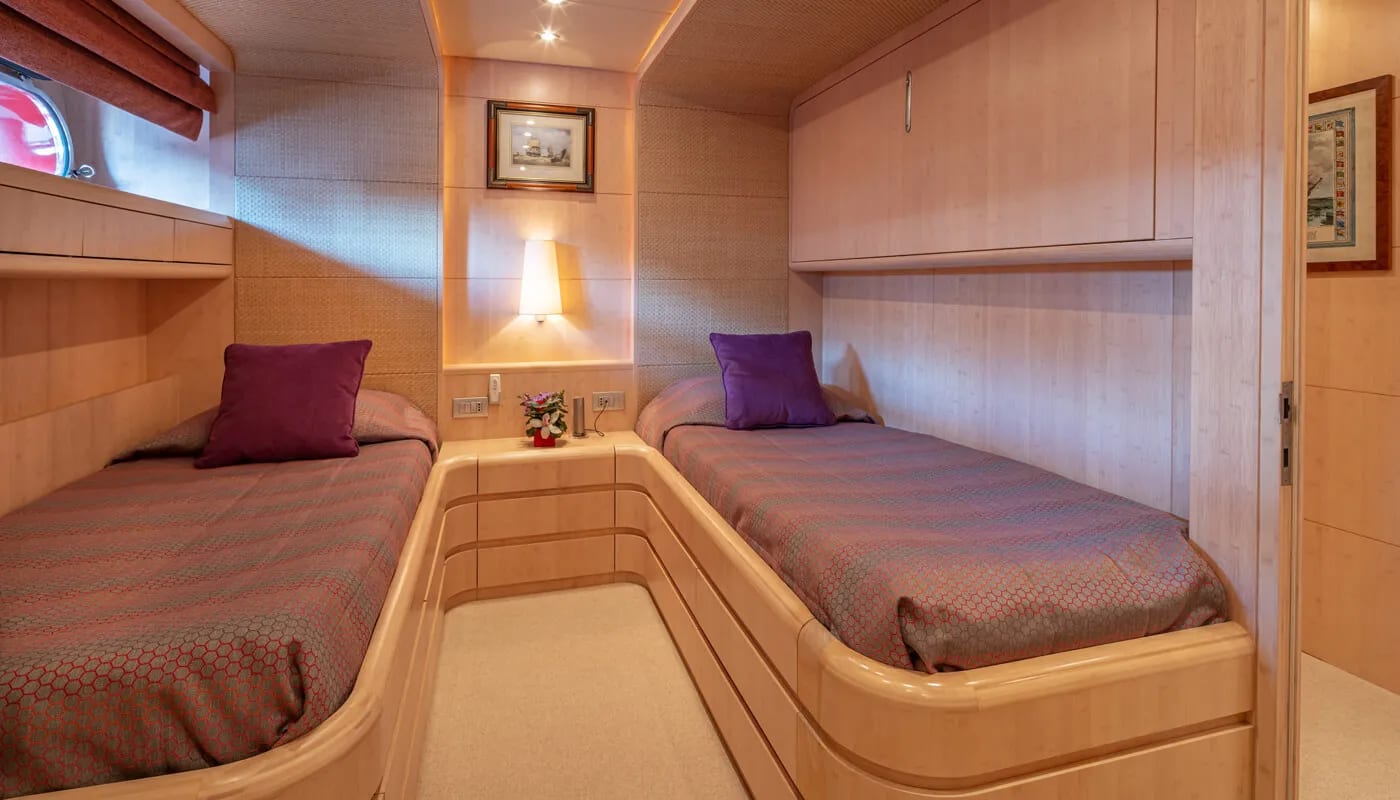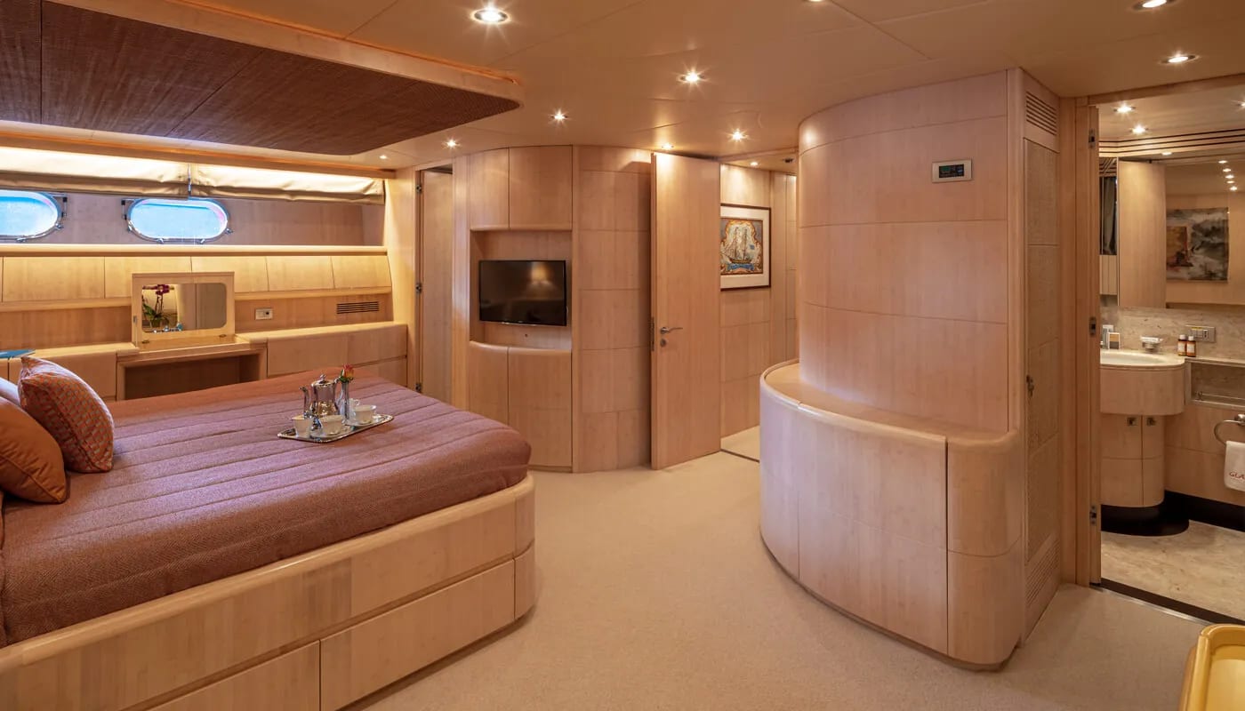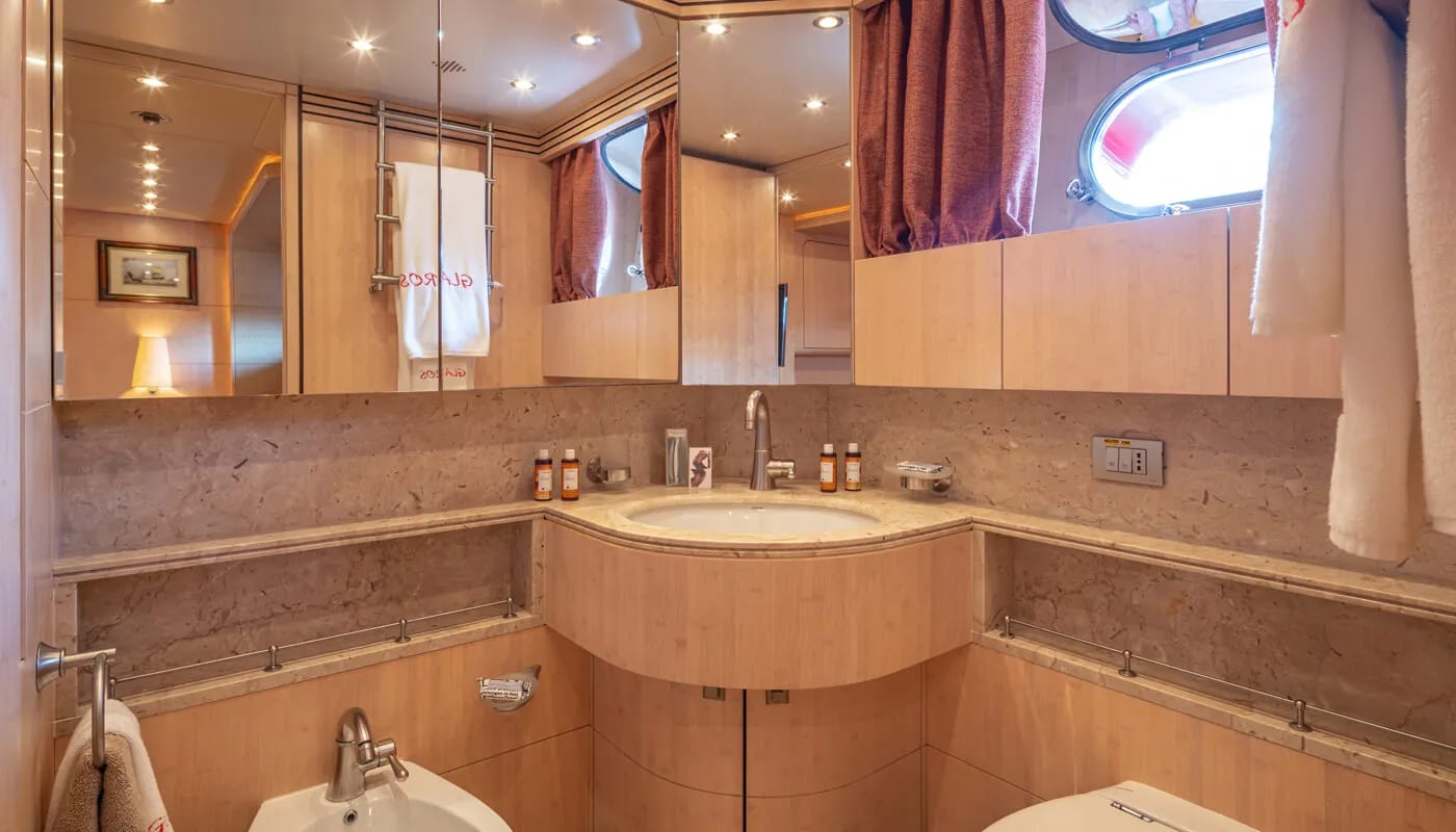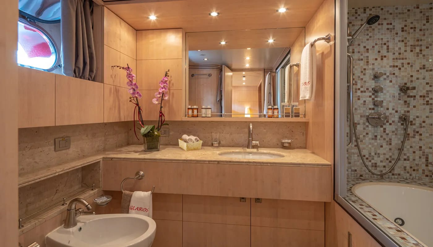 Glaros accommodates up to 12 guests in six exquisitely appointed cabins, each a sanctuary of comfort. From the master suite to the charming twin cabins, every room is designed to welcome you with a sense of peace. Awaken to the gentle motion of the sea and the promise of another day filled with exploration and relaxation. Each cabin is a private retreat, where the day’s adventures are recounted and dreams are woven.