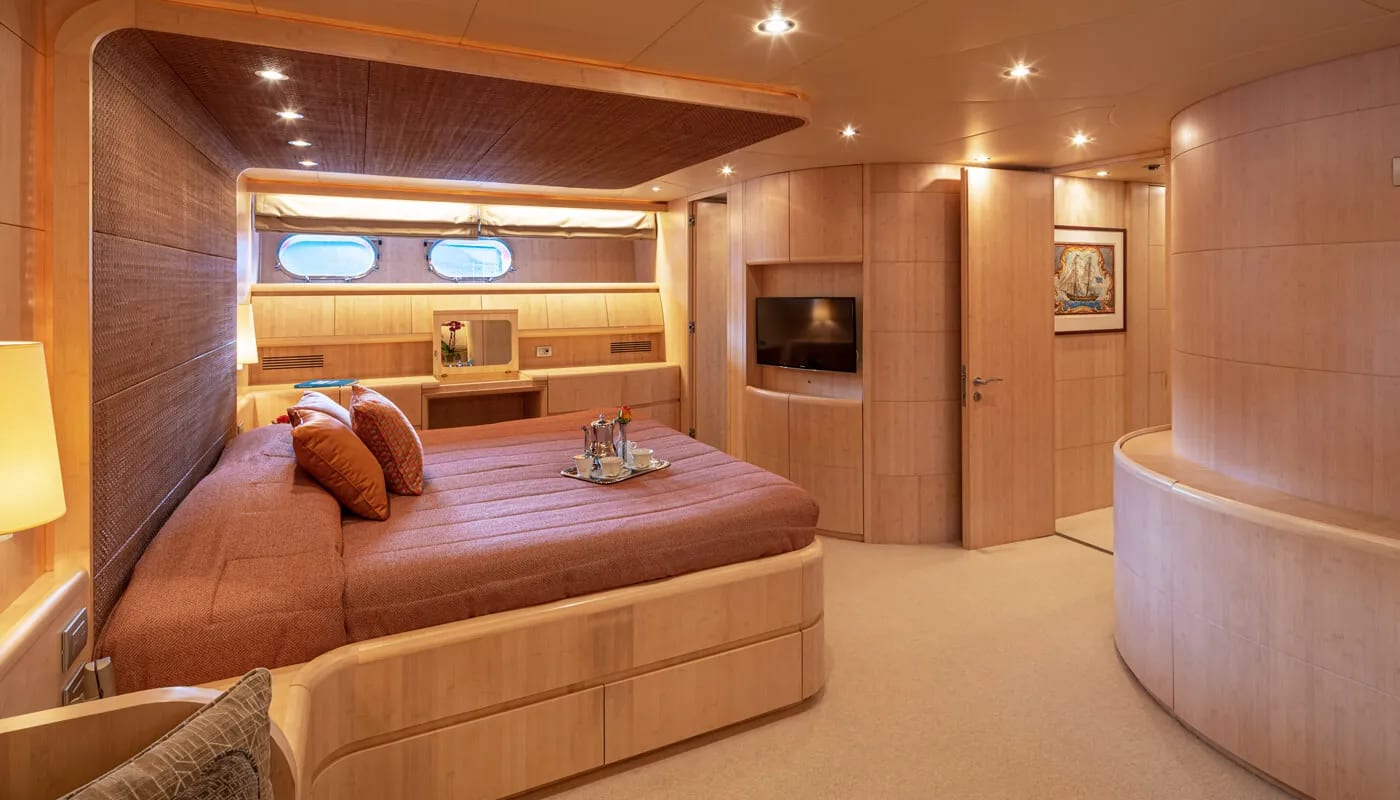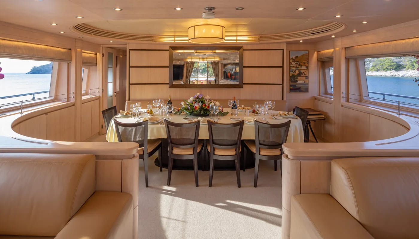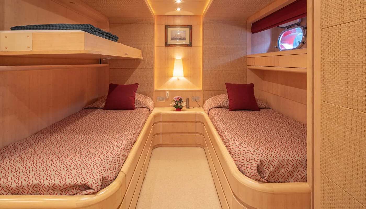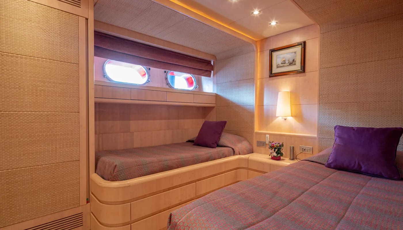 Glaros accommodates up to 12 guests in six exquisitely appointed cabins, each a sanctuary of comfort. From the master suite to the charming twin cabins, every room is designed to welcome you with a sense of peace. Awaken to the gentle motion of the sea and the promise of another day filled with exploration and relaxation. Each cabin is a private retreat, where the day’s adventures are recounted and dreams are woven.