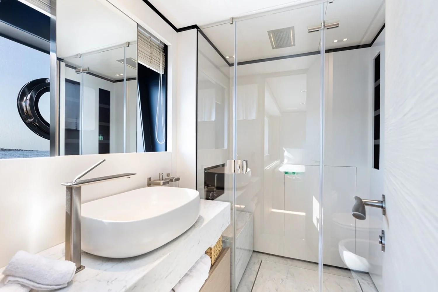 As you retire to your cabin aboard Haiami I, you’ll find a sanctuary designed for rest and rejuvenation. Hosting up to 12 guests, the yacht features six exquisitely appointed cabins, each a harmonious blend of comfort and elegance. The full-beam master suite offers a haven of tranquility with its own his and her bathrooms, setting a tone of serene opulence. The remaining cabins, adaptable in their twin or double configurations, ensure flexibility and luxury for your entire party. Awaken each morning to the gentle lapping of waves and the promise of a day filled with new adventures, as the meticulous attention to detail in each room ensures a restful and invigorating stay.